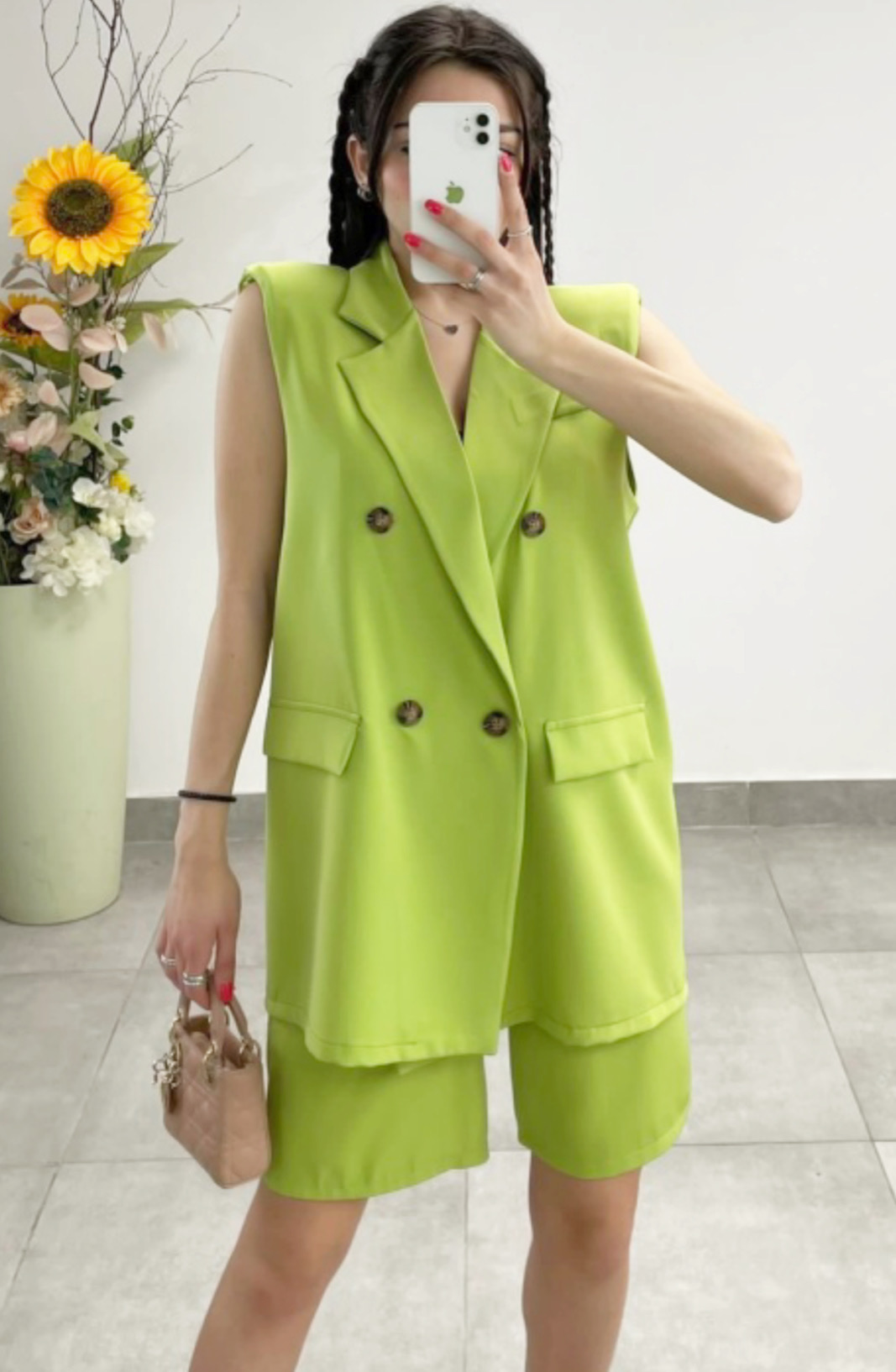 Conjunto de chaqueta y pantalón. Chaqueta sin mangas, de cuello solapa, vivo en pecho derecho y solapas en cadera simulando bolsillos. Cuatro botones frontales, uno de ellos de cierre. Pantalón corto de cintura elástica en parte posterior, dos bolsillos y cierre de cremallera y botón superior. 95% poliéster y 5% elastano. Fabricado en Italia.