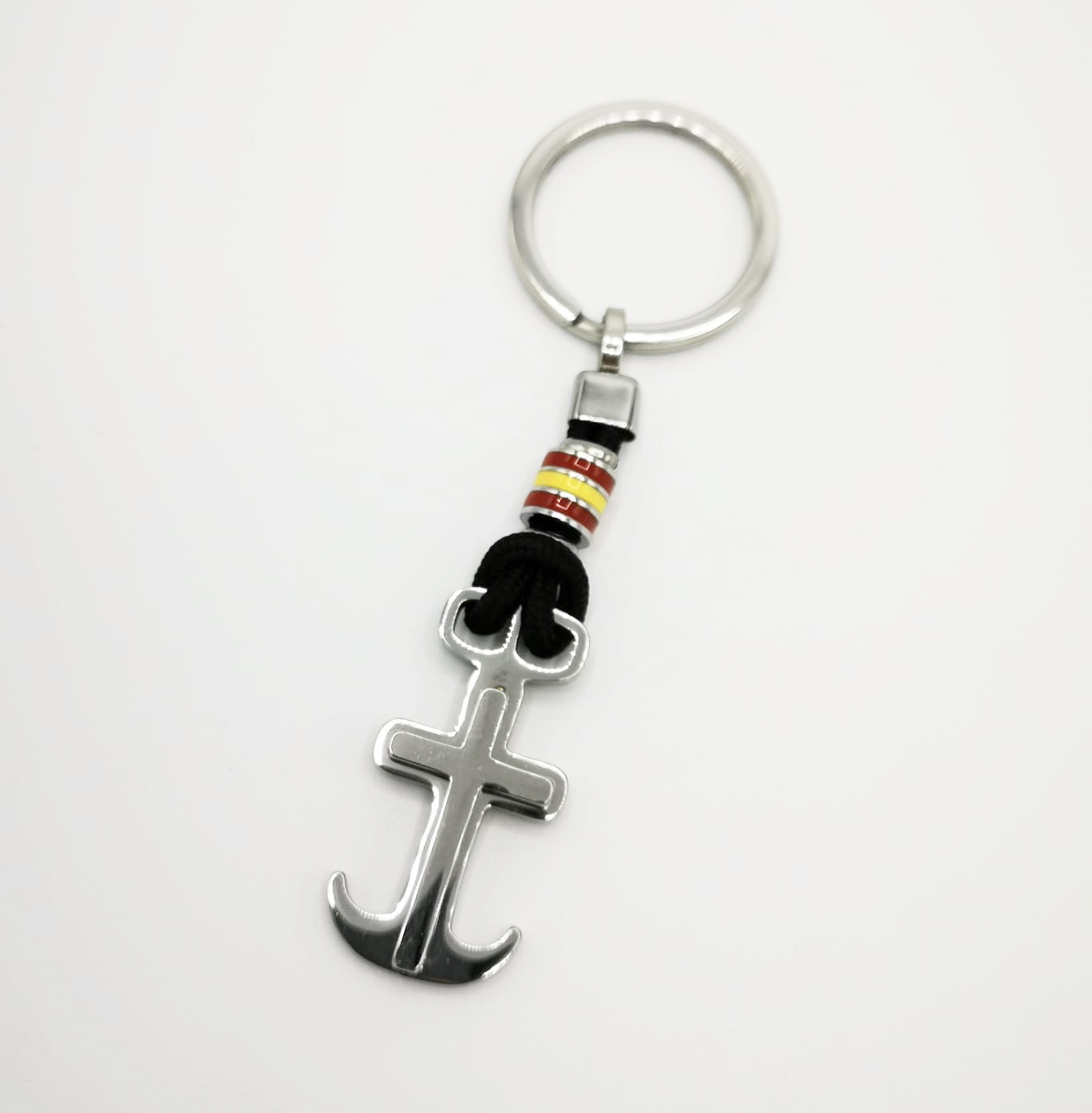 Llavero cruz sobre ancla y aro de llaves en acero plateado, unidos por cordón efecto nudo marinero con abalorio metálico cilíndrico bicolor. Largo total aprox.: 9 cm.