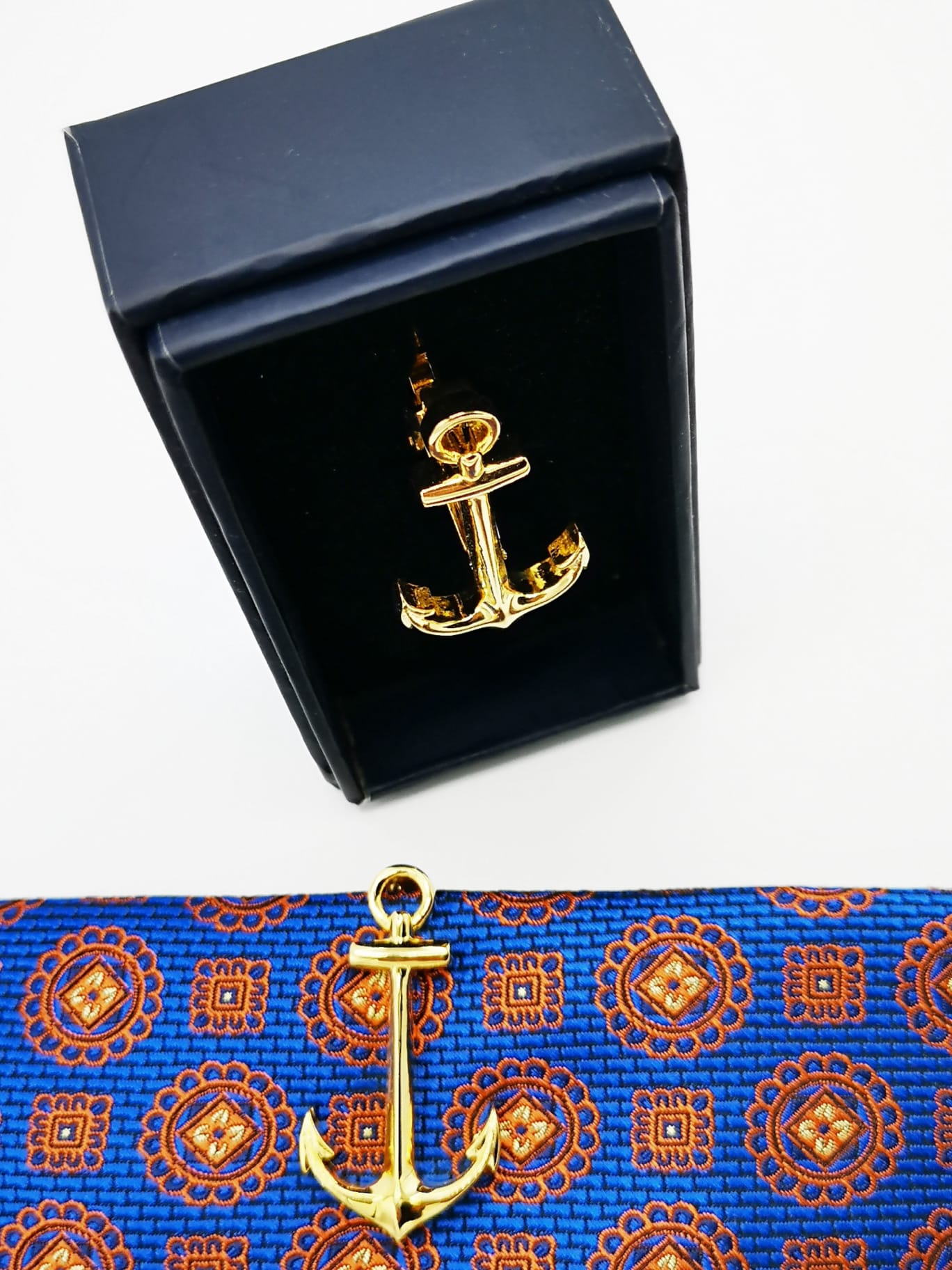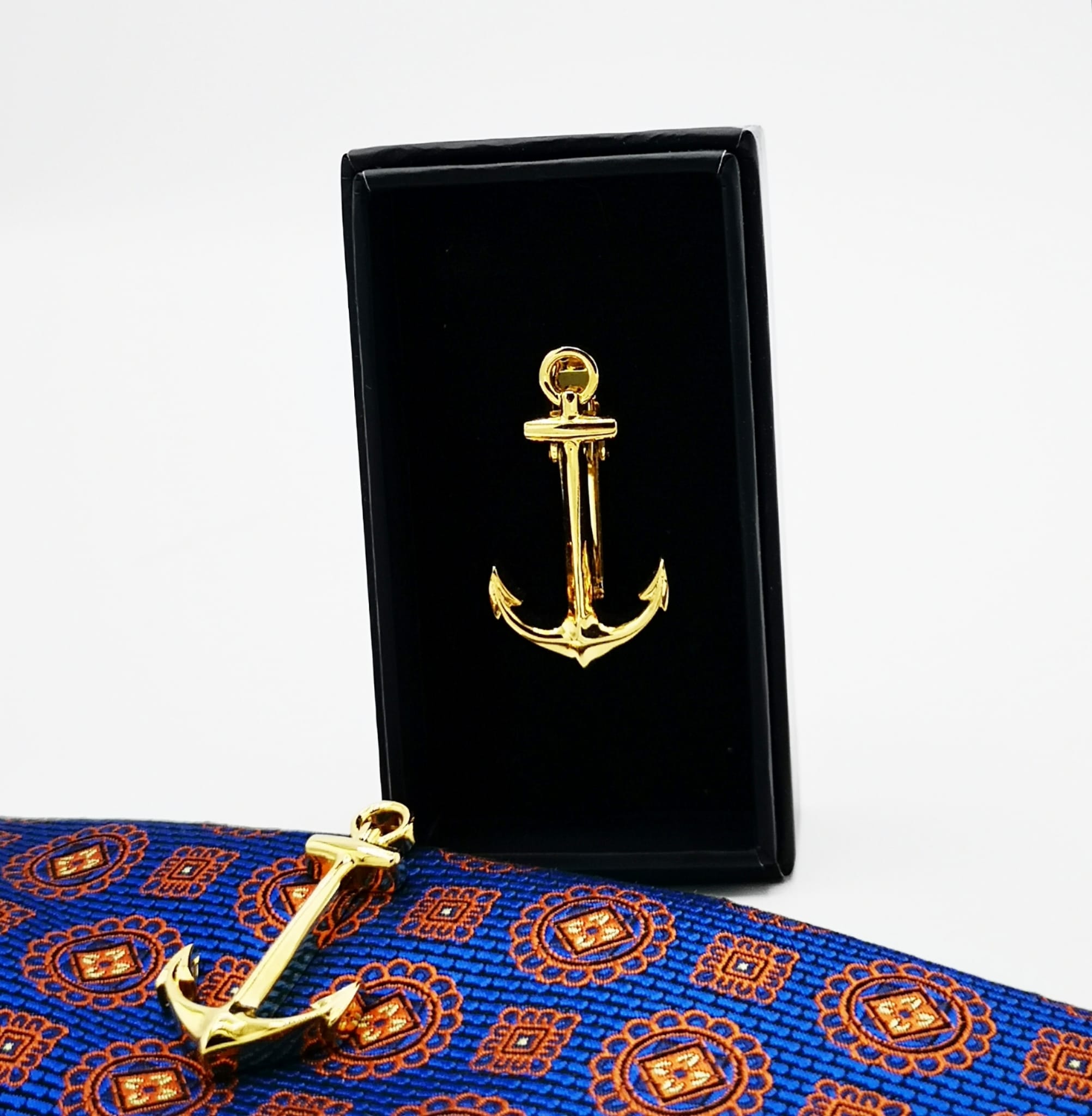 Pasador de corbata en forma de ancla. Aleación de metales pulida en dorado. Un toque original a tu look más sofisticado.