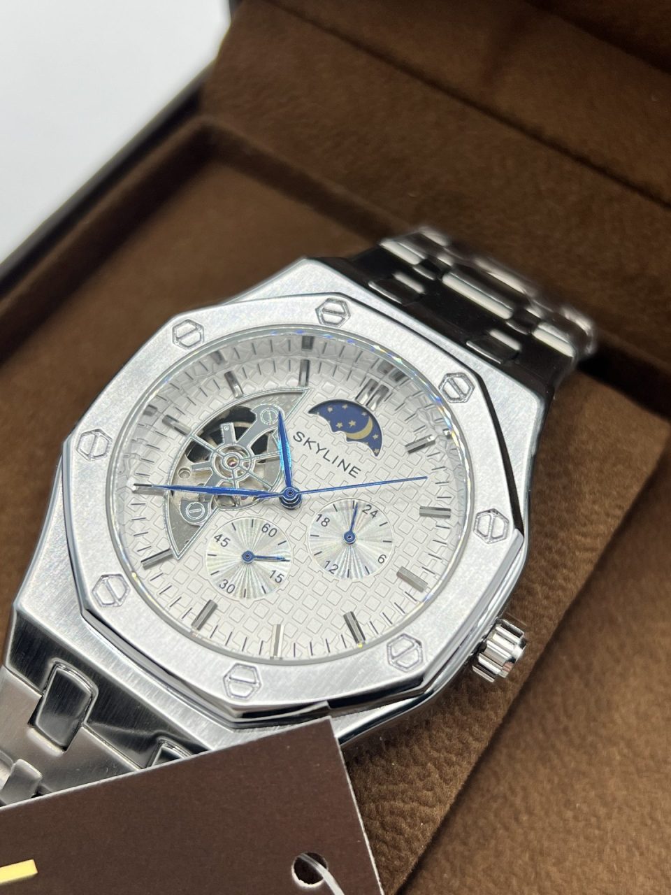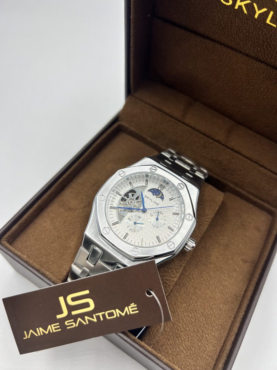 Reloj automático Skyline, con caja y correa en acero inoxidable. Dial con fase lunar y función 24 horas. Garantía de 2 años.