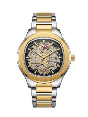 El reloj Skyline destaca por su diseño vanguardista y su construcción sólida. Su caja y brazalete de acero inoxidable con acabado dorado ofrecen una durabilidad excepcional y un brillo que no pasa desapercibido. El bisel dentado con detalles numéricos en negro le otorga un carácter deportivo y masculino.