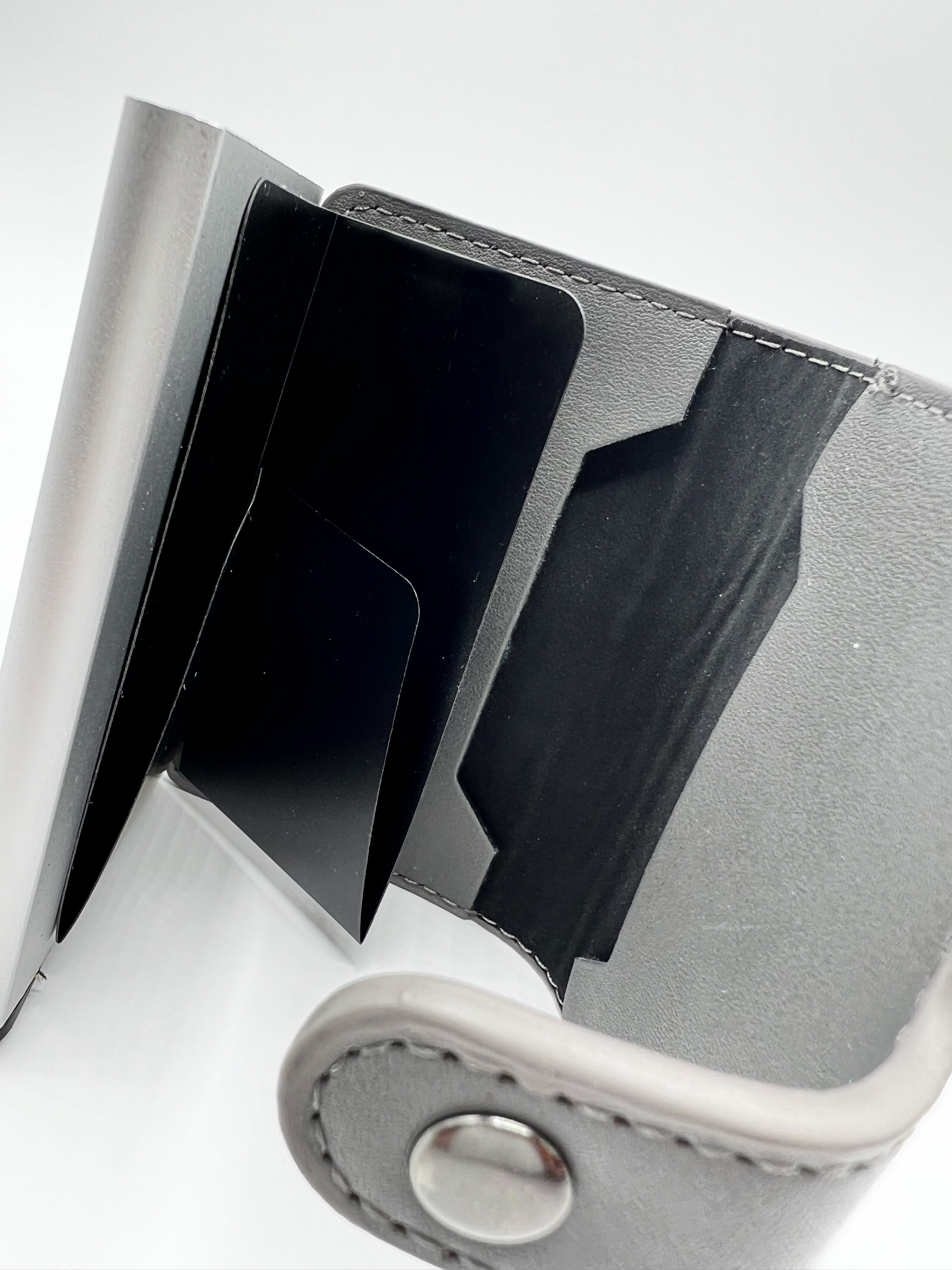 Cartera símil piel e interior con compartimento de aluminio para 6-8 tarjetas. El mecanismo permite deslizar las tarjetas con un simple movimiento para poder disponer de ellas inmediatamente. Incorpora compartimento de plástico para billetes y 2 bolsillos adicionales para más tarjetas.