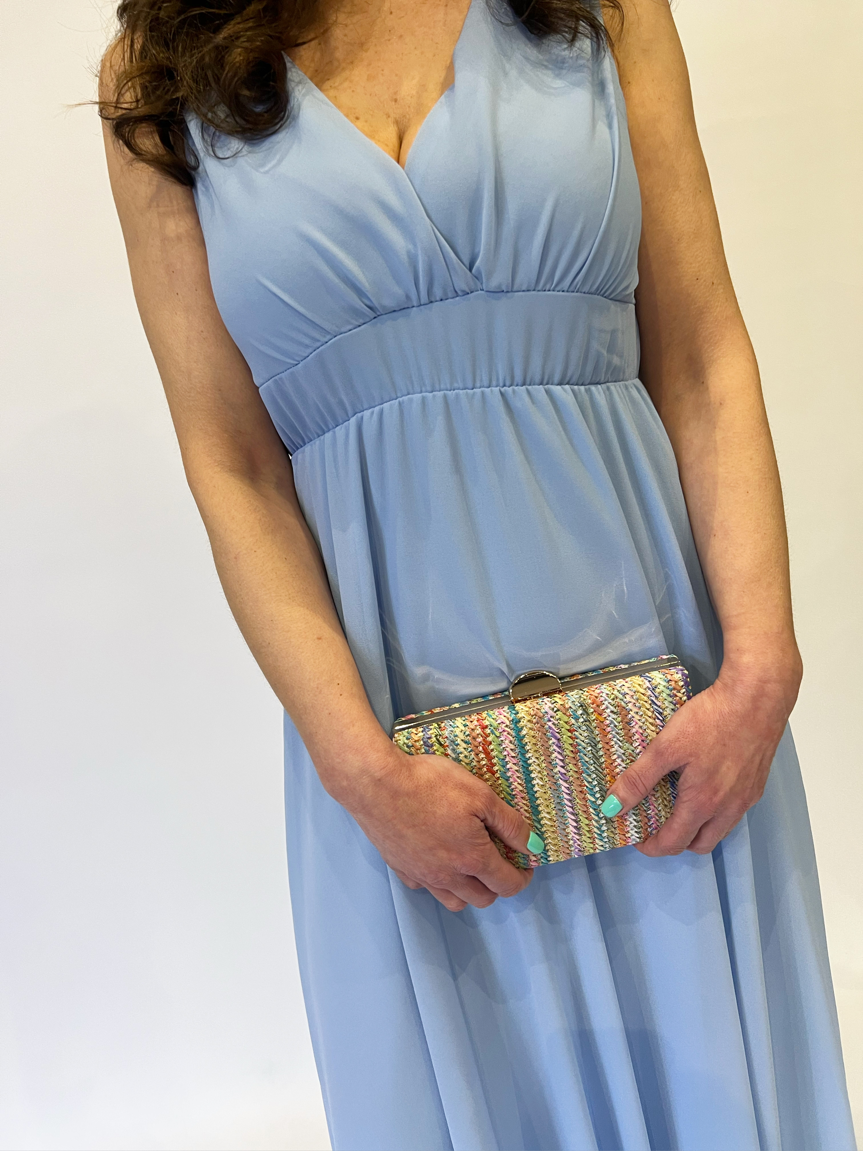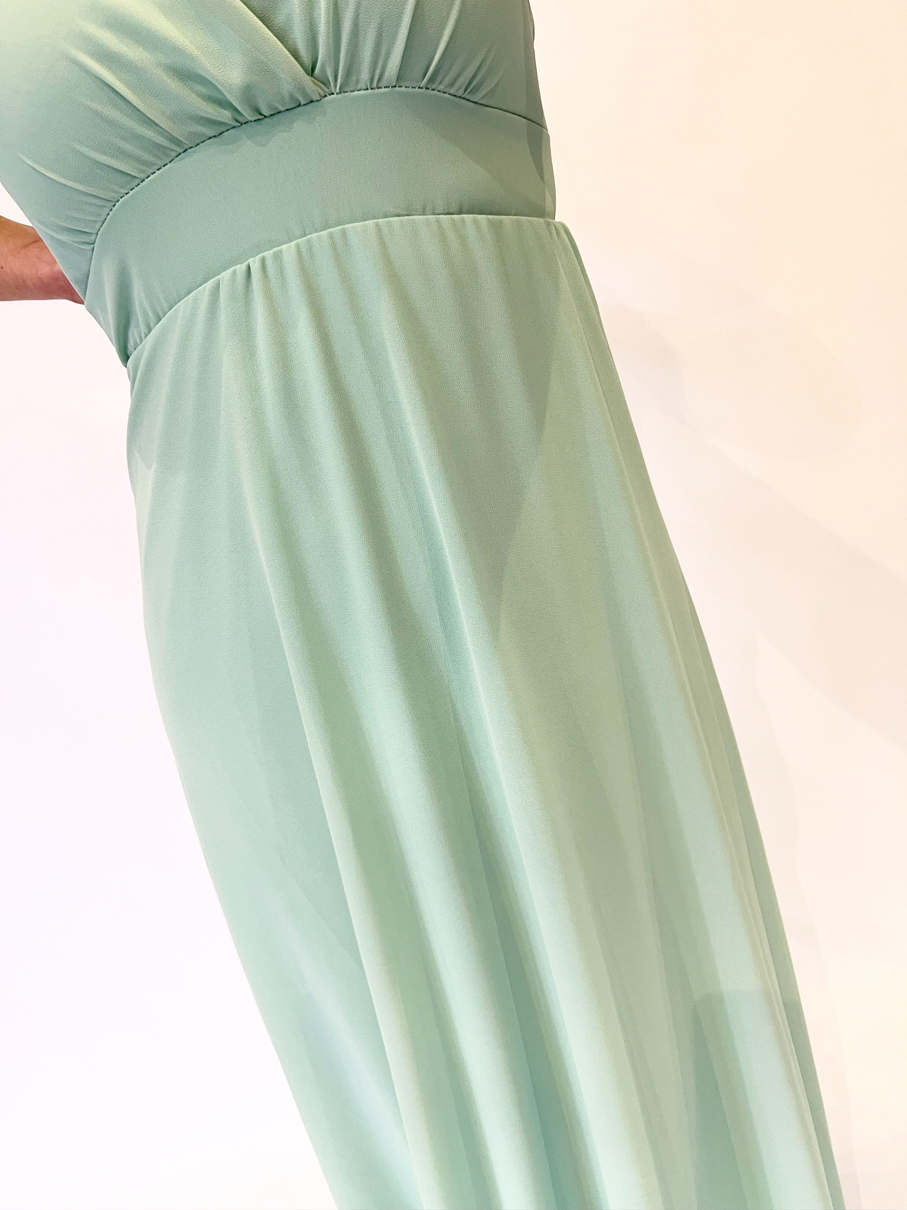 Vestido largo de gasa sin mangas, con goma elástica en cintura. Escote en pecho y espalda en «V». Forro interior. 100% poliéster. Fabricado en Italia.
