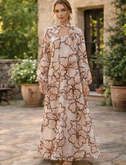 Vestido largo de diseño elegante con estampado floral en relieve, ideal para lucir en cualquier ocasión especial o en tu día a día con estilo.