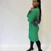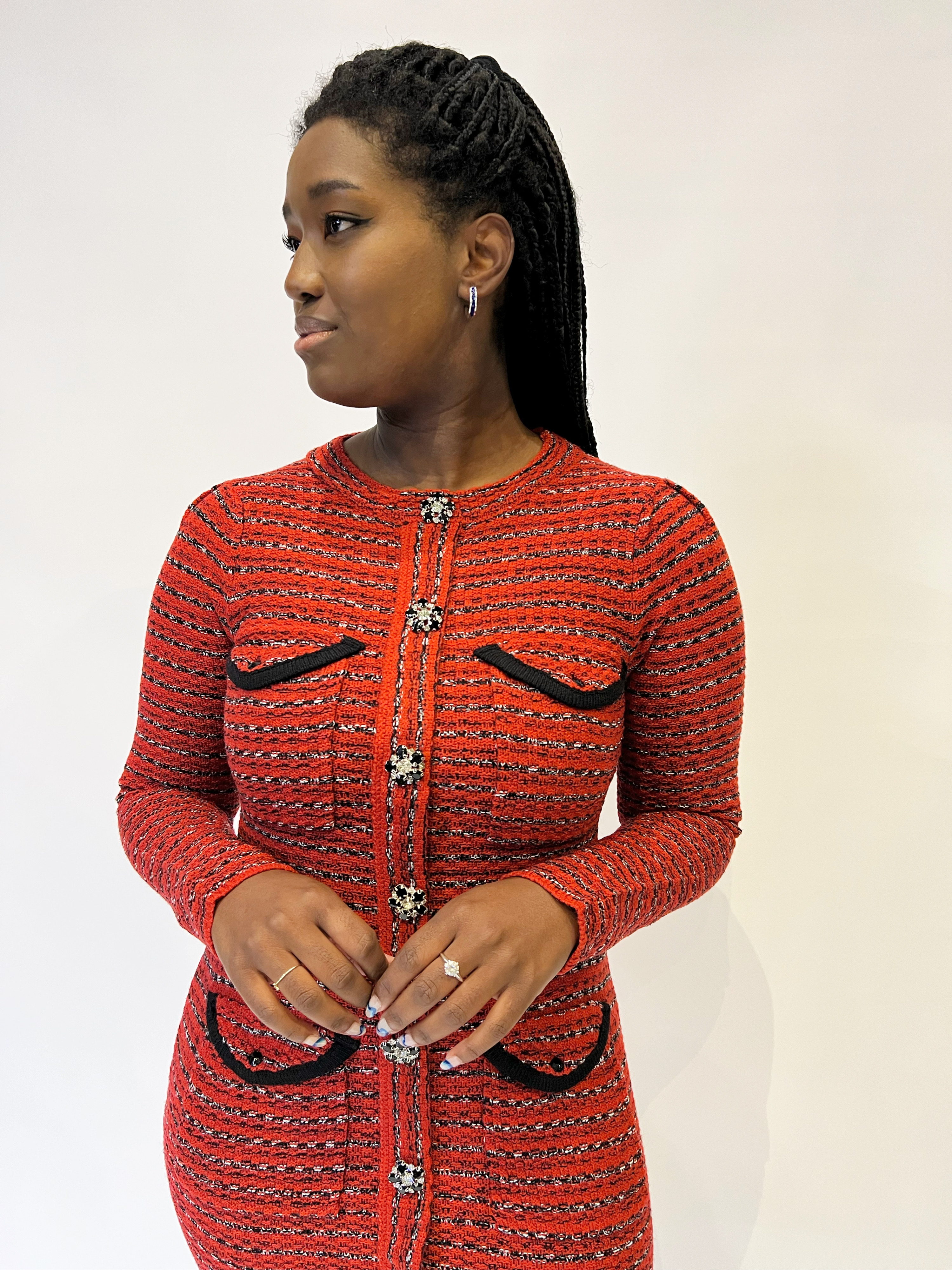 Vestido en punto jaspeado, de cuello redondo y manga larga. Cuatro bolsillos plastrón de solapa con cierre de botón de piedra y rematada con vivo en frontal. Cierre frontal de diez botones de piedras engarzadas. Largo aproximado en talla S: 98 cm.