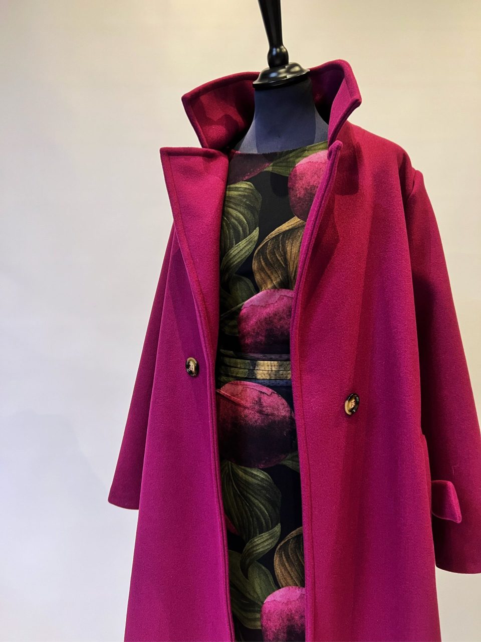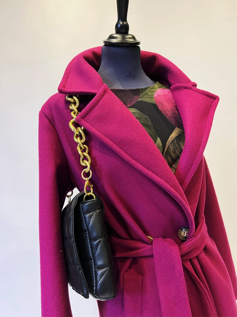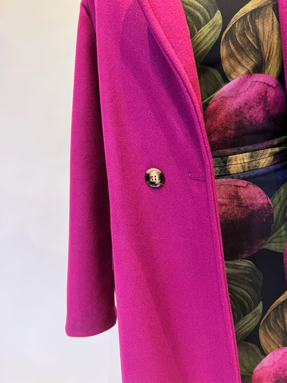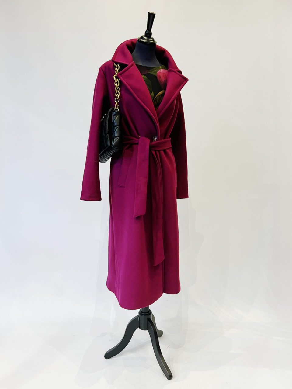 Abrigo largo de paño con cuello solapa ancha de muesca y manga larga. Dos bolsillos frontales oblícuos con un vivo. Cierre frontal de doble botonadura y cinturón lazada con dos trabillas de sujeción. Forro interior a tono, 100% poliéster. Composición exterior: 95% poliéster y 5% lana. Fabricado en Italia.