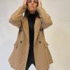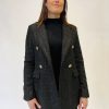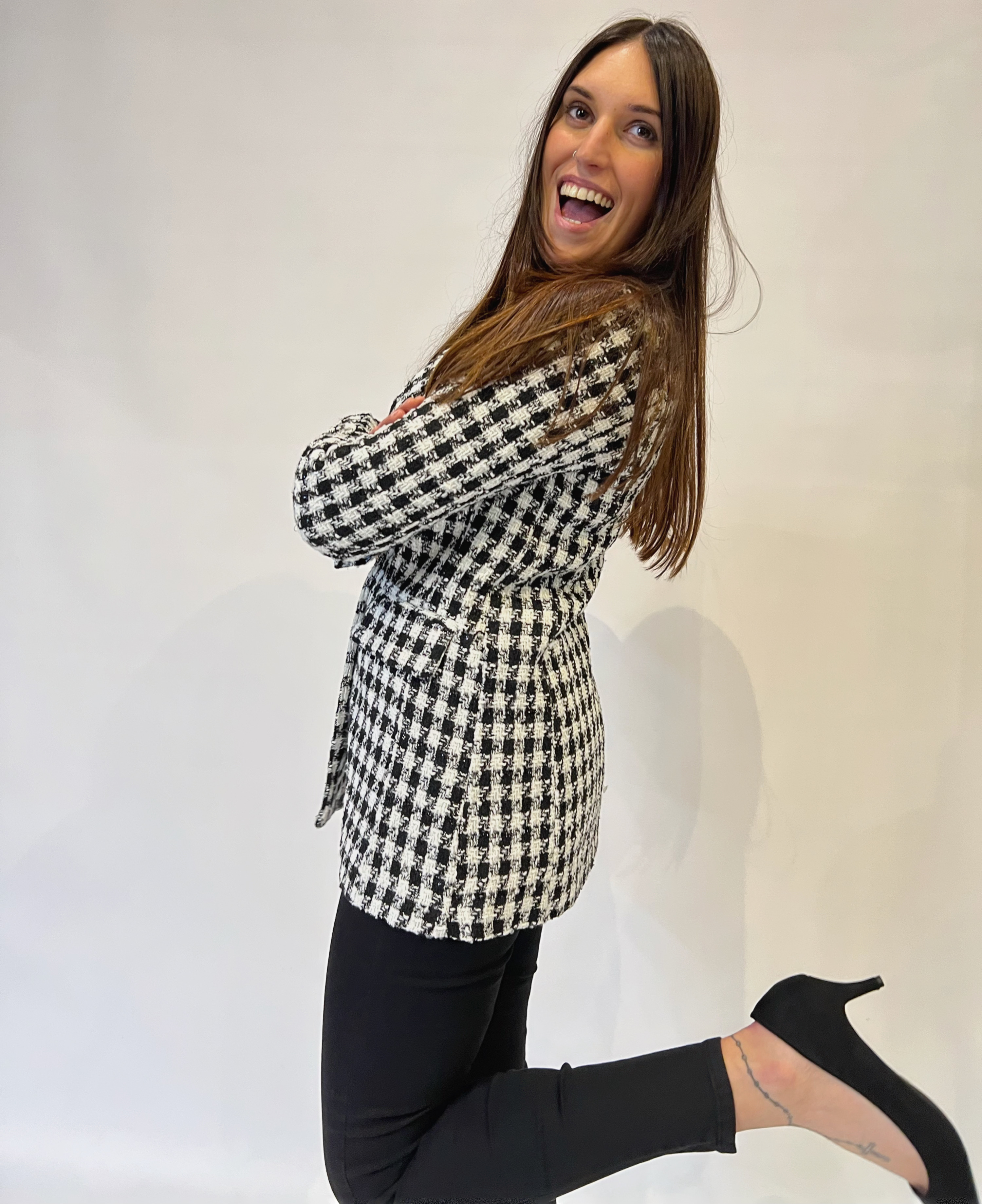 Americana pata de gallo con solapa, con manga larga y hombros marcados. Líneas de brillo cruzadas formando rectángulos. Bolsillos delanteros con tapeta. Forro interior. Cierre frontal cruzado con cuatro botones dorados exteriores y uno interior transparente. 100% poliéster.