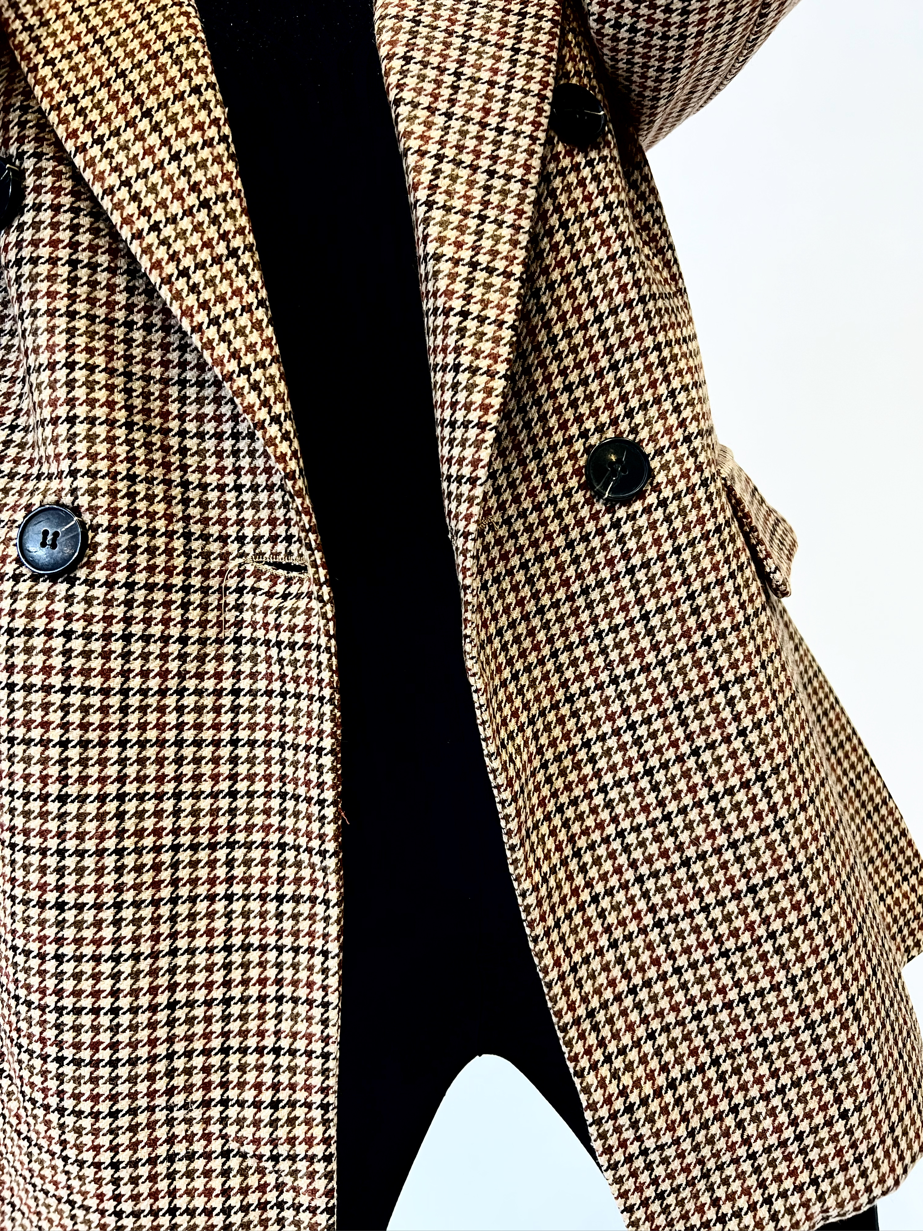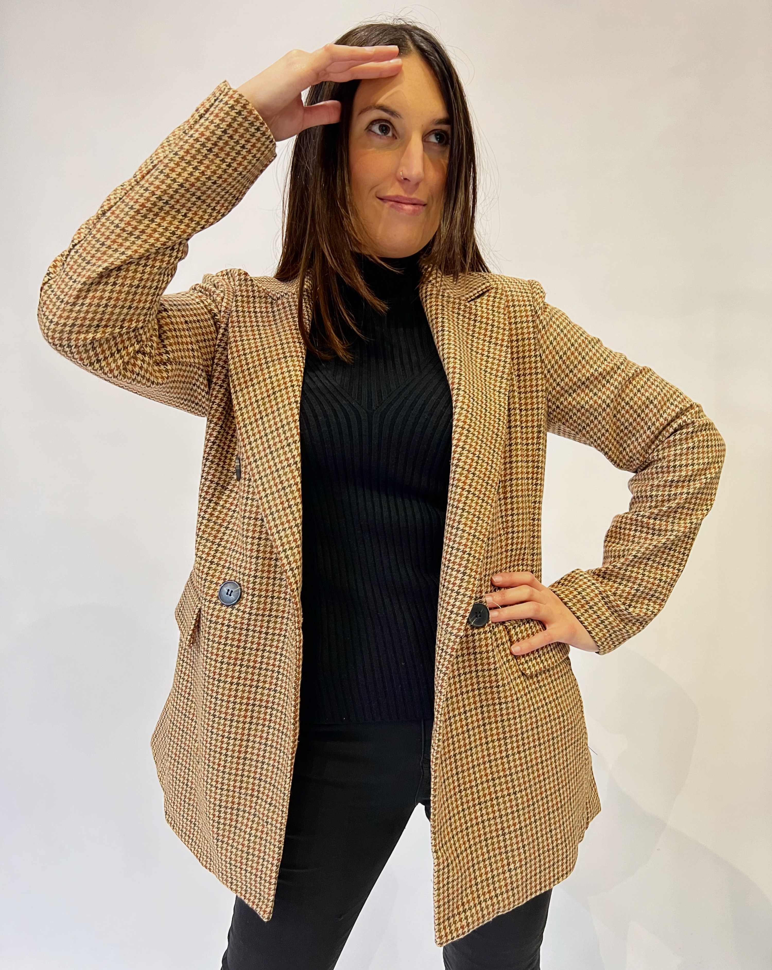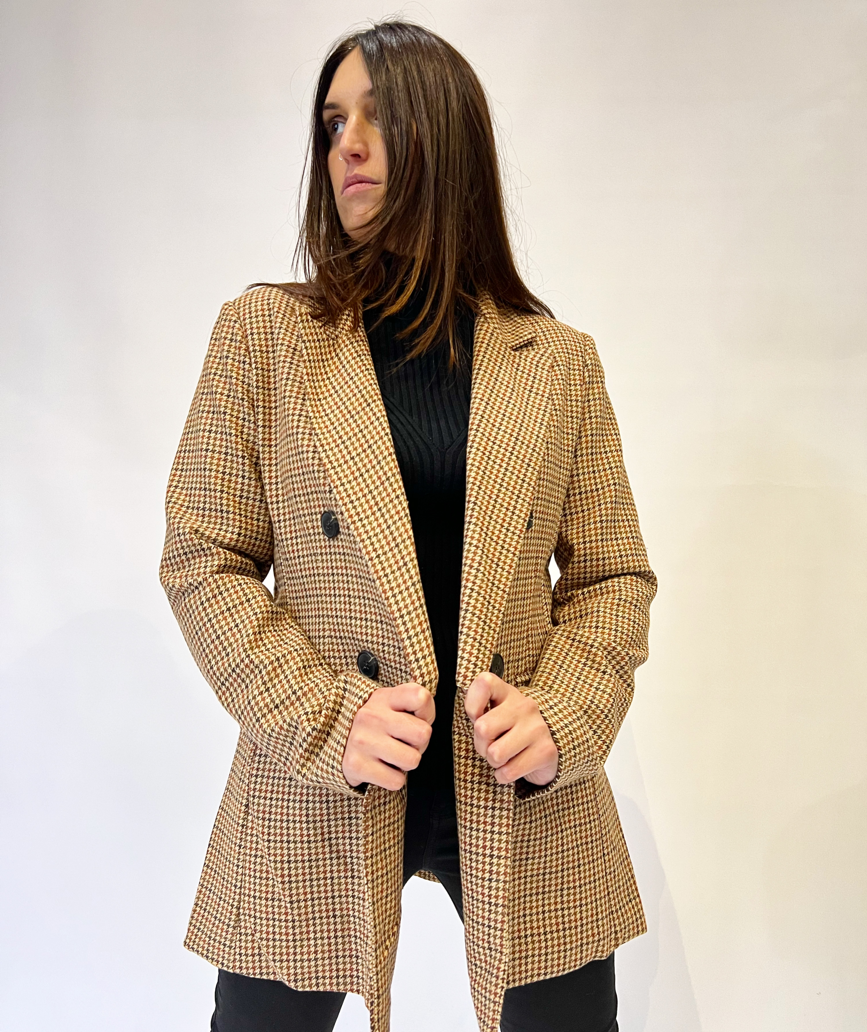 Americana pata de gallo con solapa, con manga larga y hombros marcados. Bolsillos delanteros con tapeta. Forro interior. Cierre frontal cruzado con cuatro botones exteriores y uno interior transparente. 90% poliéster y 10% lana.