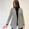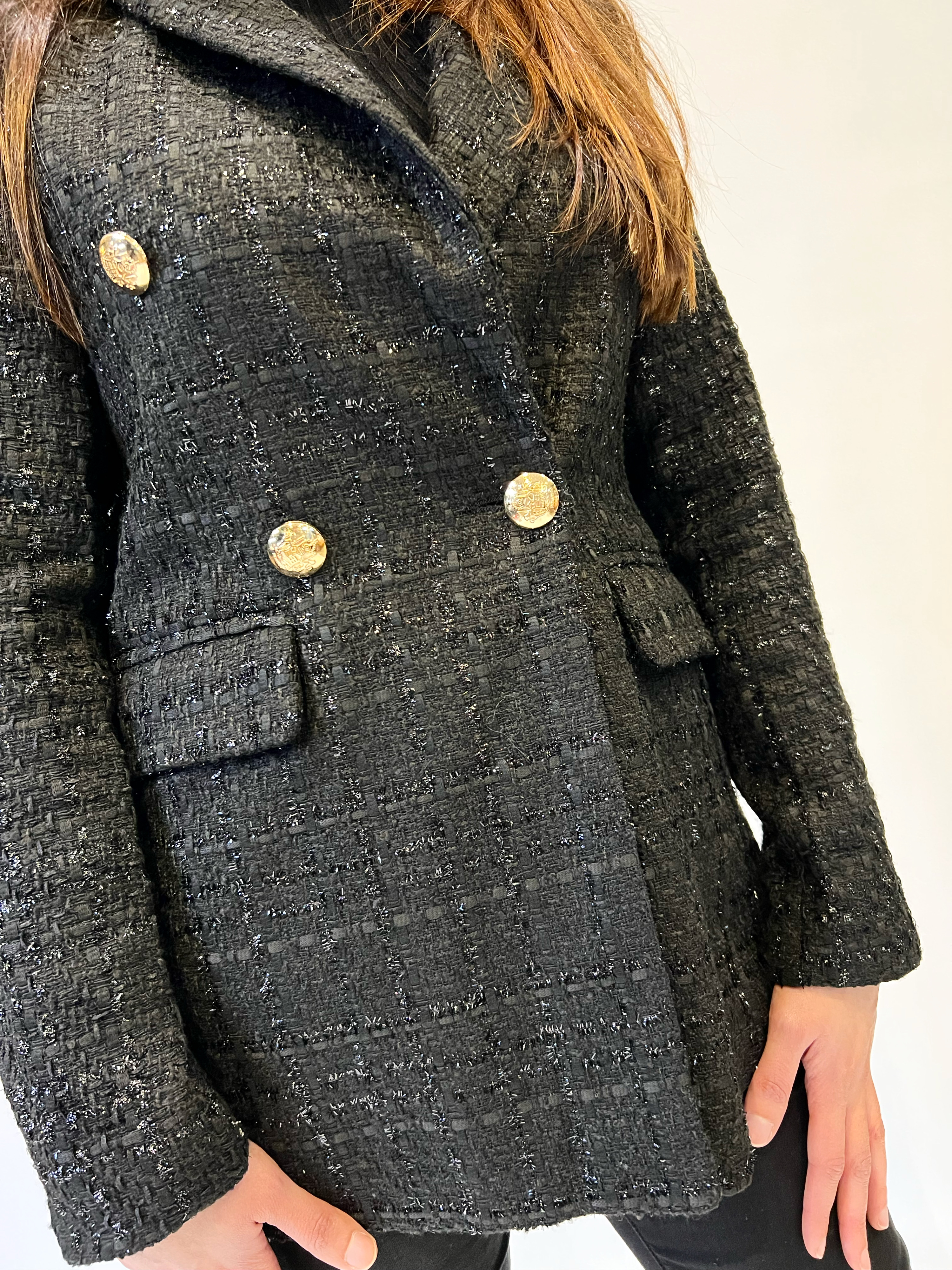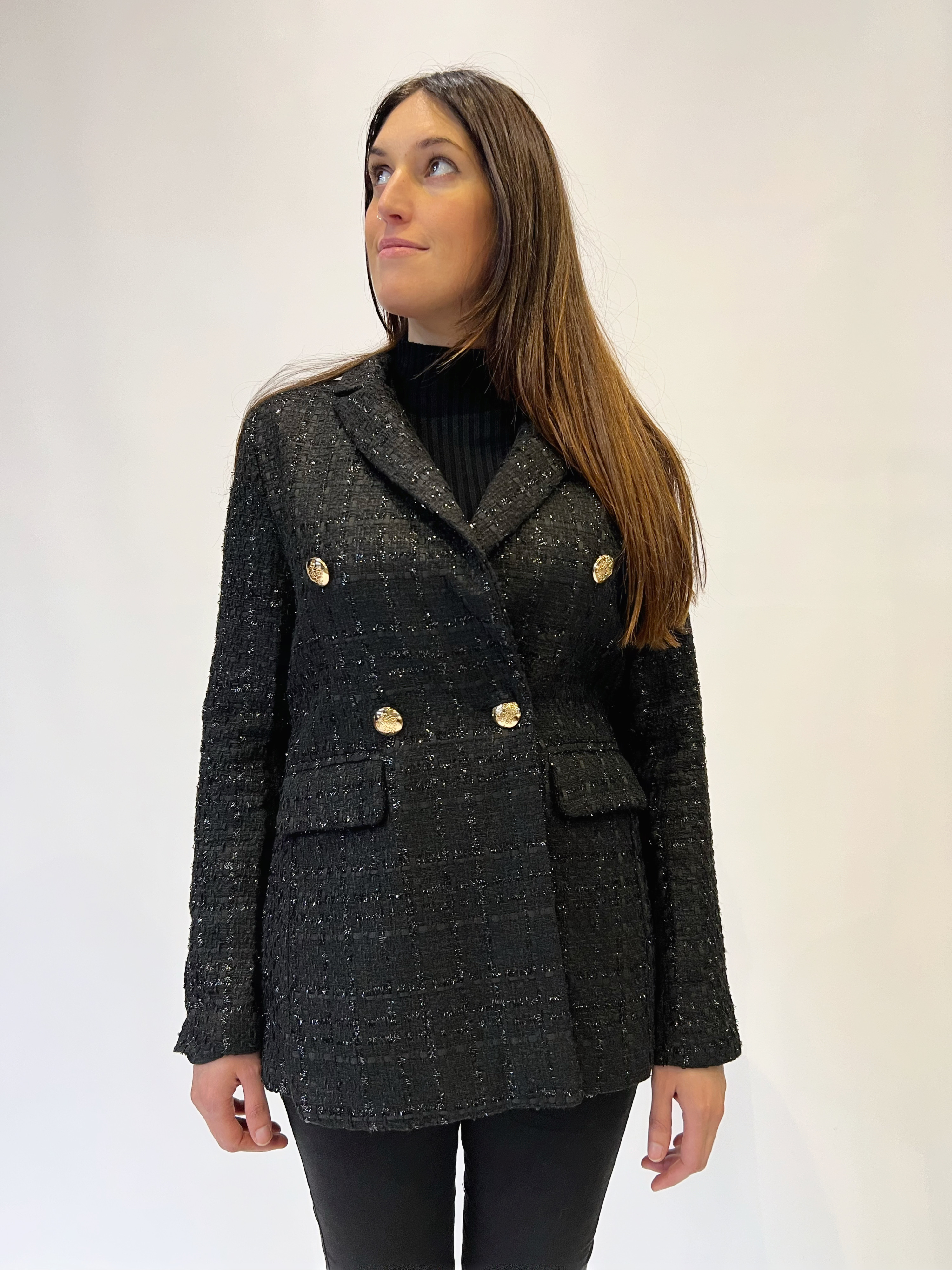Americana cruzada pata de gallo con solapa, con manga larga y hombros marcados. Líneas de brillo cruzadas formando rectángulos. Bolsillos delanteros con tapeta. Forro interior. Cierre frontal cruzado con cuatro botones dorados exteriores y uno interior transparente. 100% poliéster.