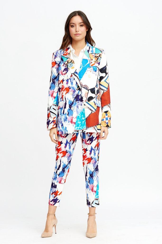 Chaqueta americana estampada, de cuello solapa con muescas y manga larga. Dos bolsillos frontales con solapa. Cierre cruzado de botón doble. 100% poliéster.