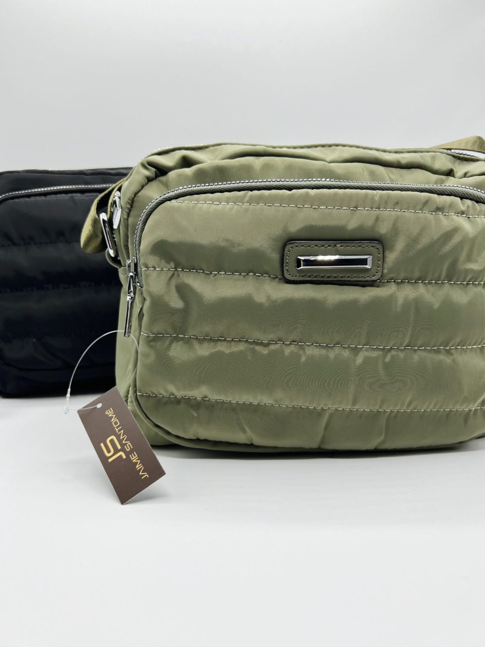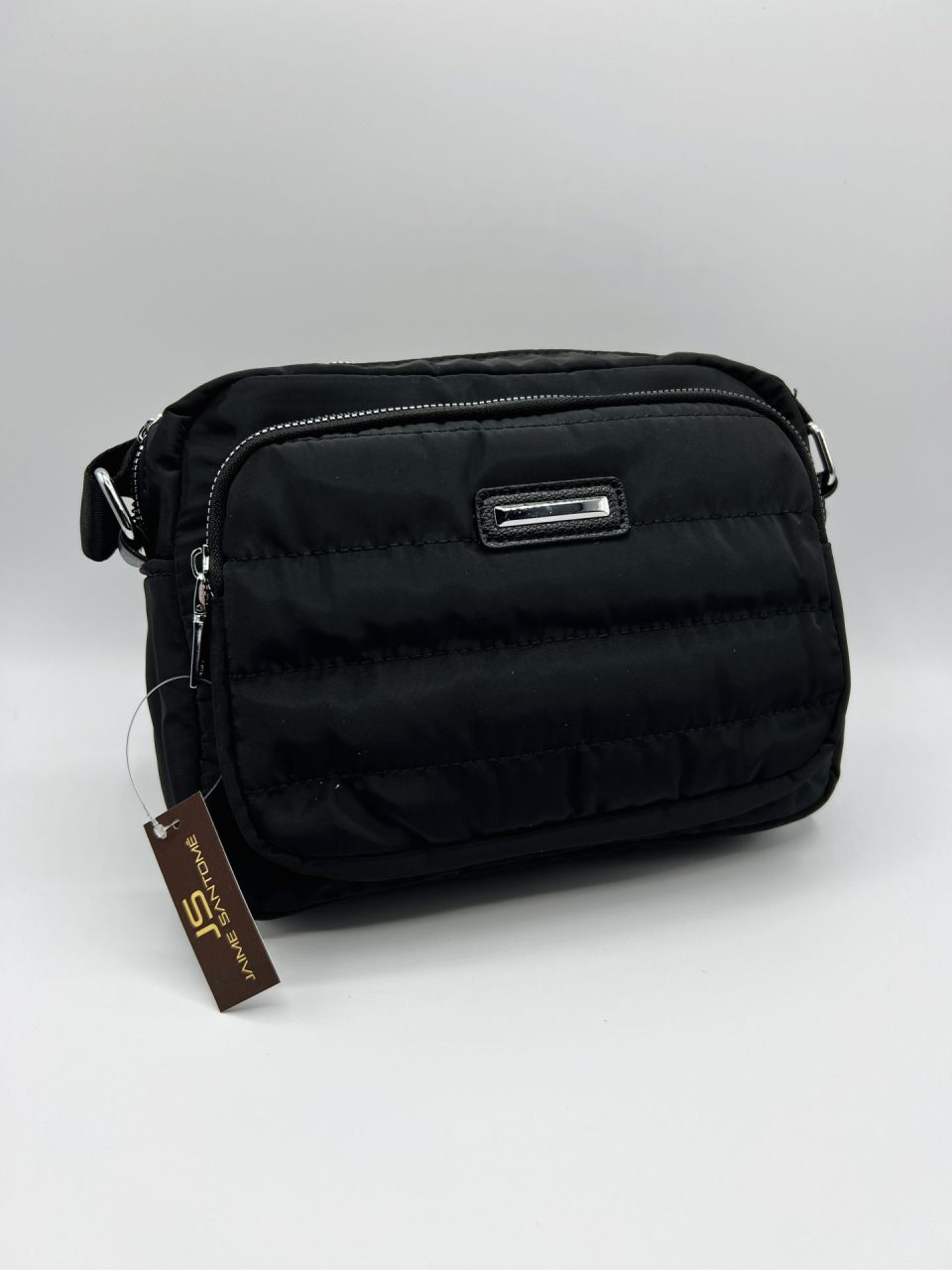 Bandolera acolchada con correa de nylon. Compartimento principal con tres bolsillos. uno de ellos con cremallera. Cierre de cremallera. Lleva un compartimento exterior en el frontal, con cierre de cremallera. Exterior: 100% Nylon e Interior (forro): 100% poliéster. Fornituras en metal plateado.