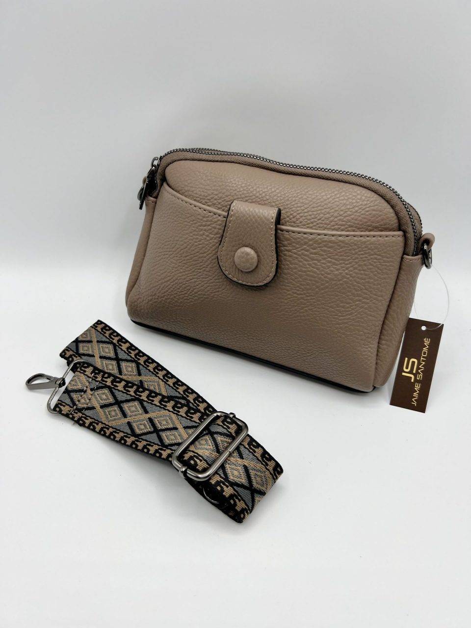 Bandolera pequeña de doble compartimento, con un bolsillo interior abierto en un compartimento y uno de cremallera en el otro. Cierre de ambos compartimentos de cremallera. Un bolsillo exterior de solapilla con clip de imán en delantero y un bolsillo exterior trasero de cremallera. Correa de colores tipo étnico con enganches de mosquetón. Exterior: 100% PU e Interior: 100% poliéster. Fornituras en metal plateado.