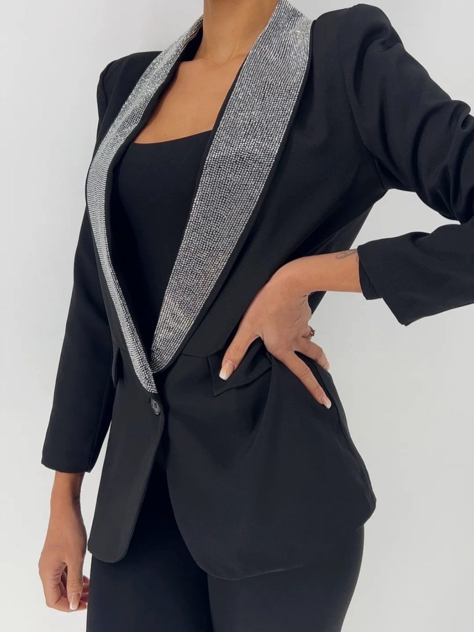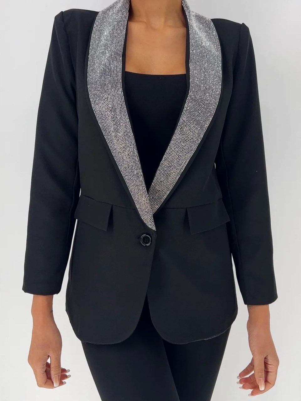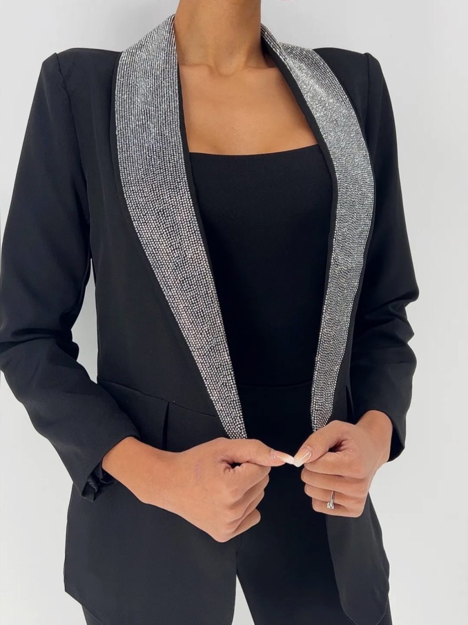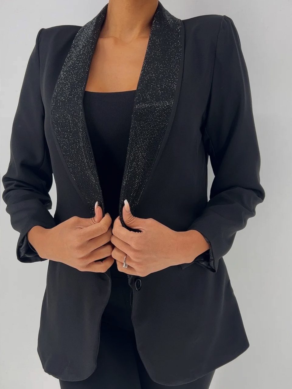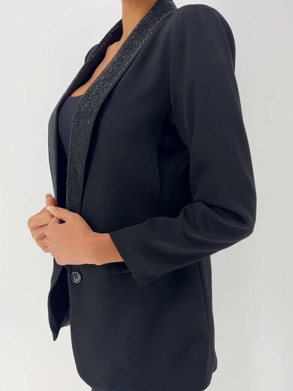 Blazer de manga larga y cuello solapa esmoquin cruzada de brillos en negro. Dos solapas frontales de falsos bolsillos. Forro interior. 100% poliéster. Fabricada en Italia.