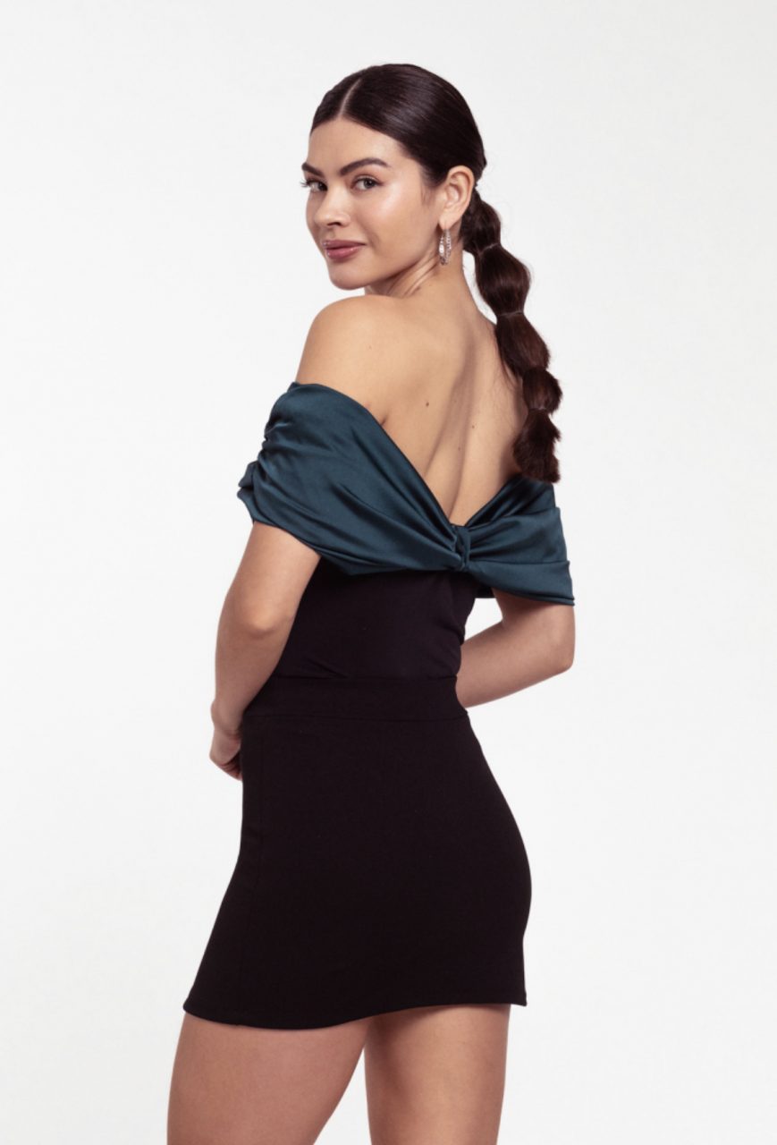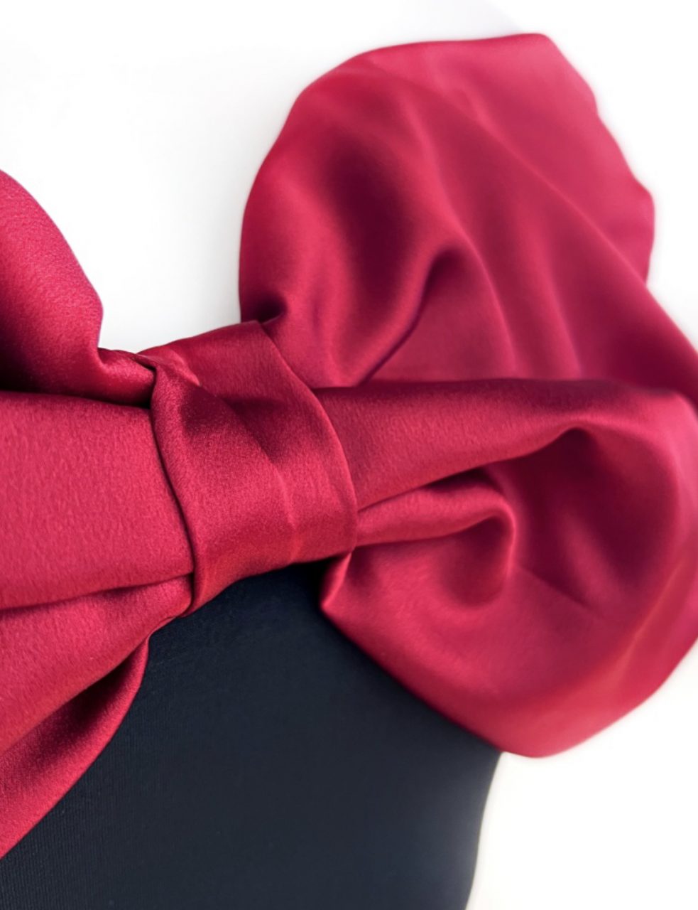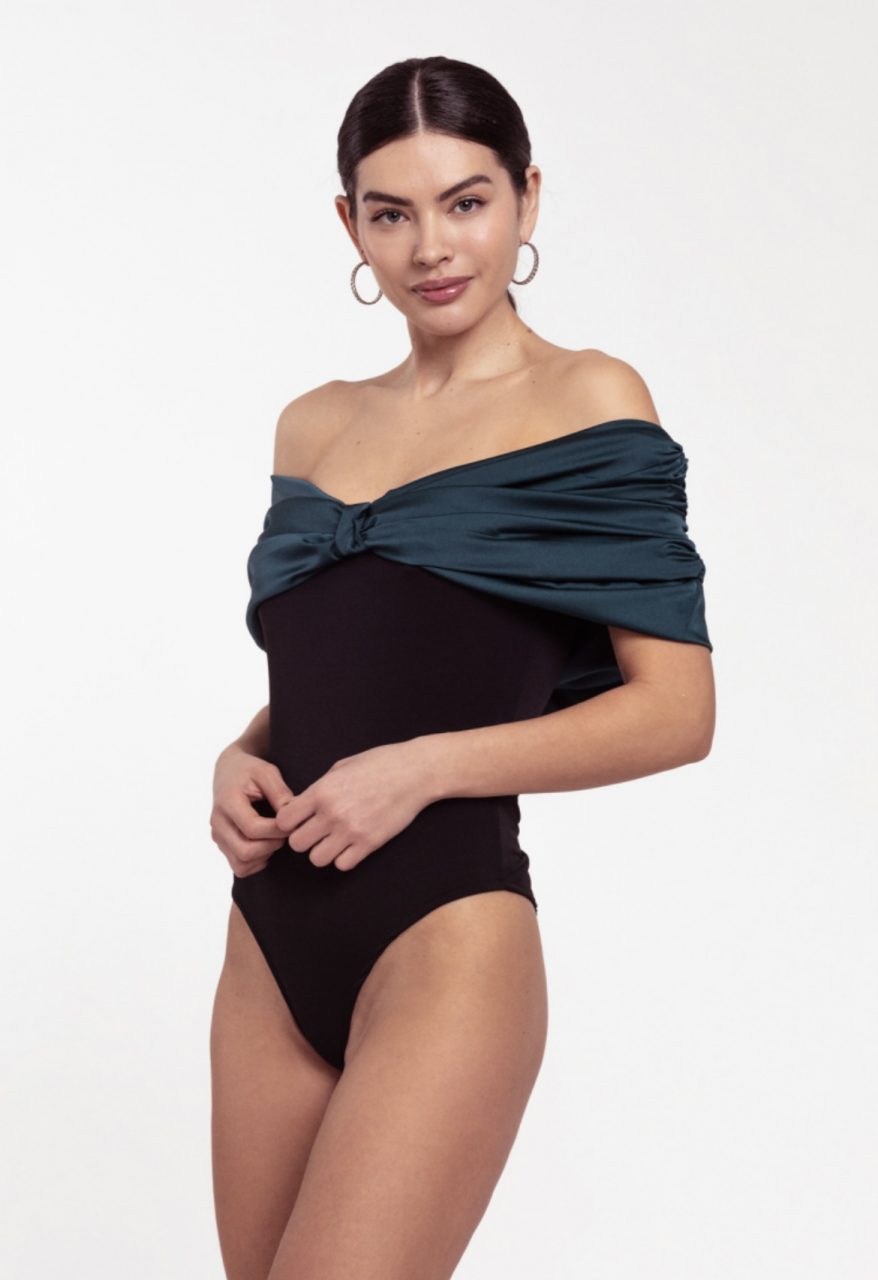 Body de escote recto y hombros descubiertos. Detalle de lazo grande en pecho y espalda. Cierre en bajo con botones a presión. 95% poliéster y 5% elastano. Made in Italy.