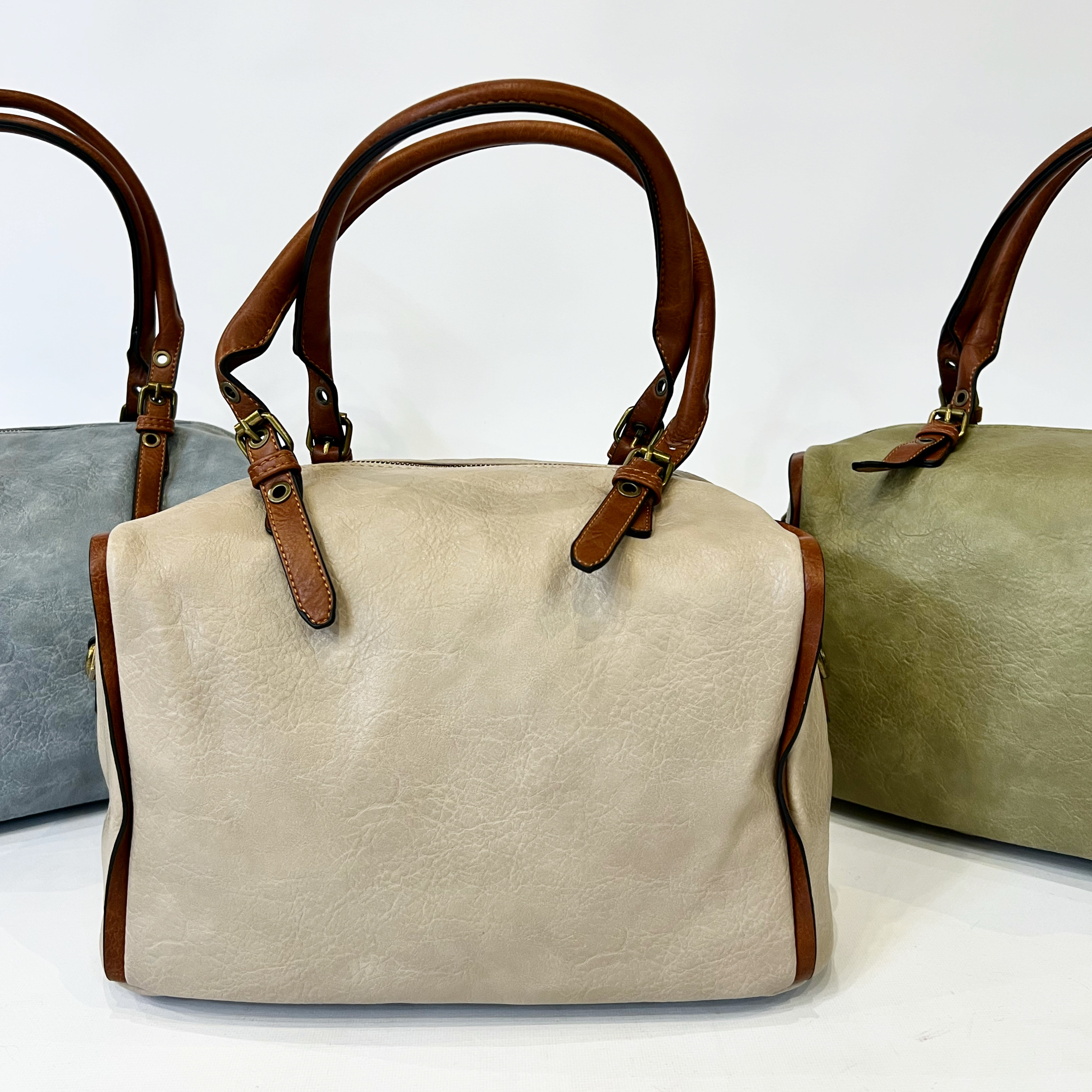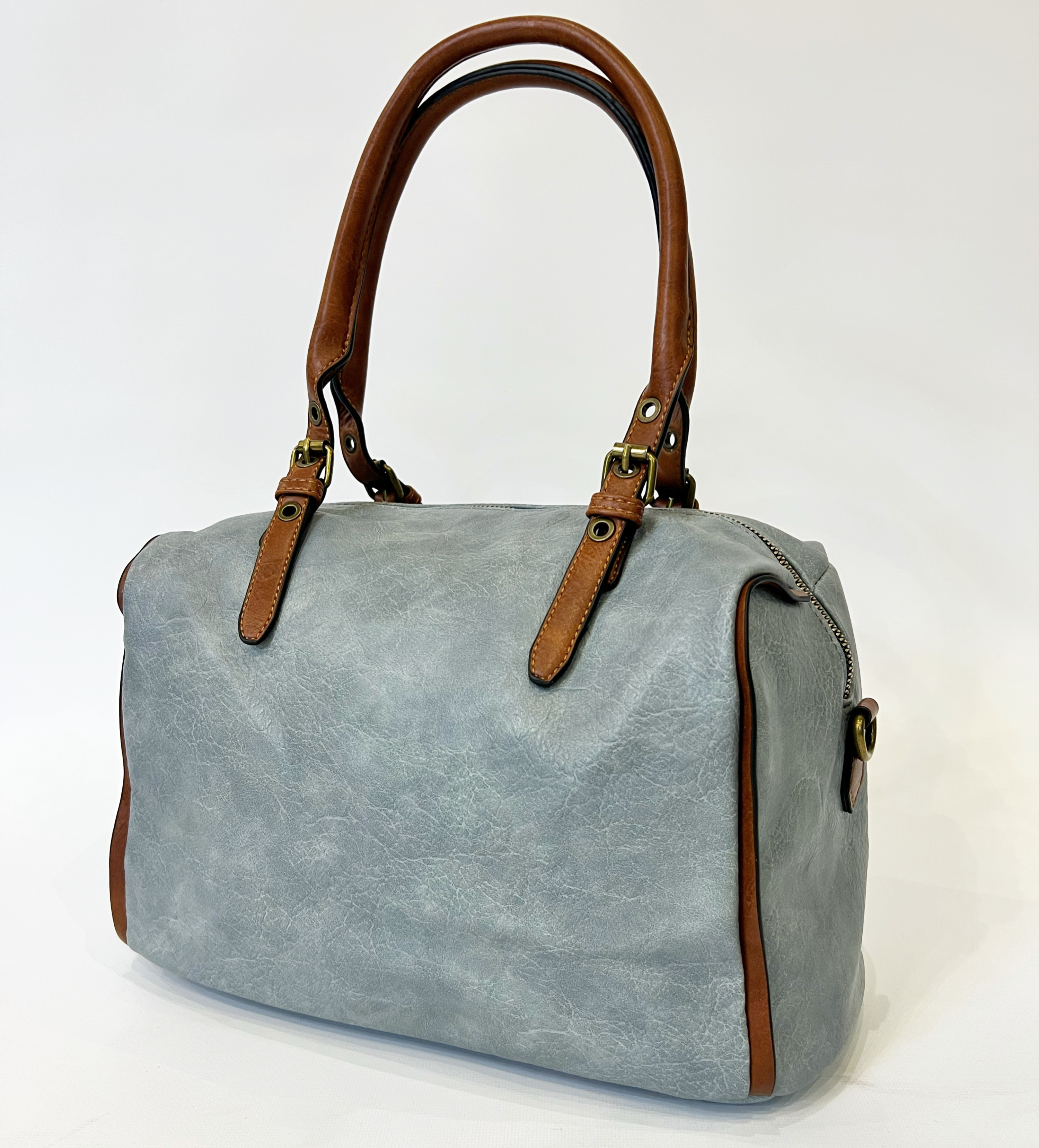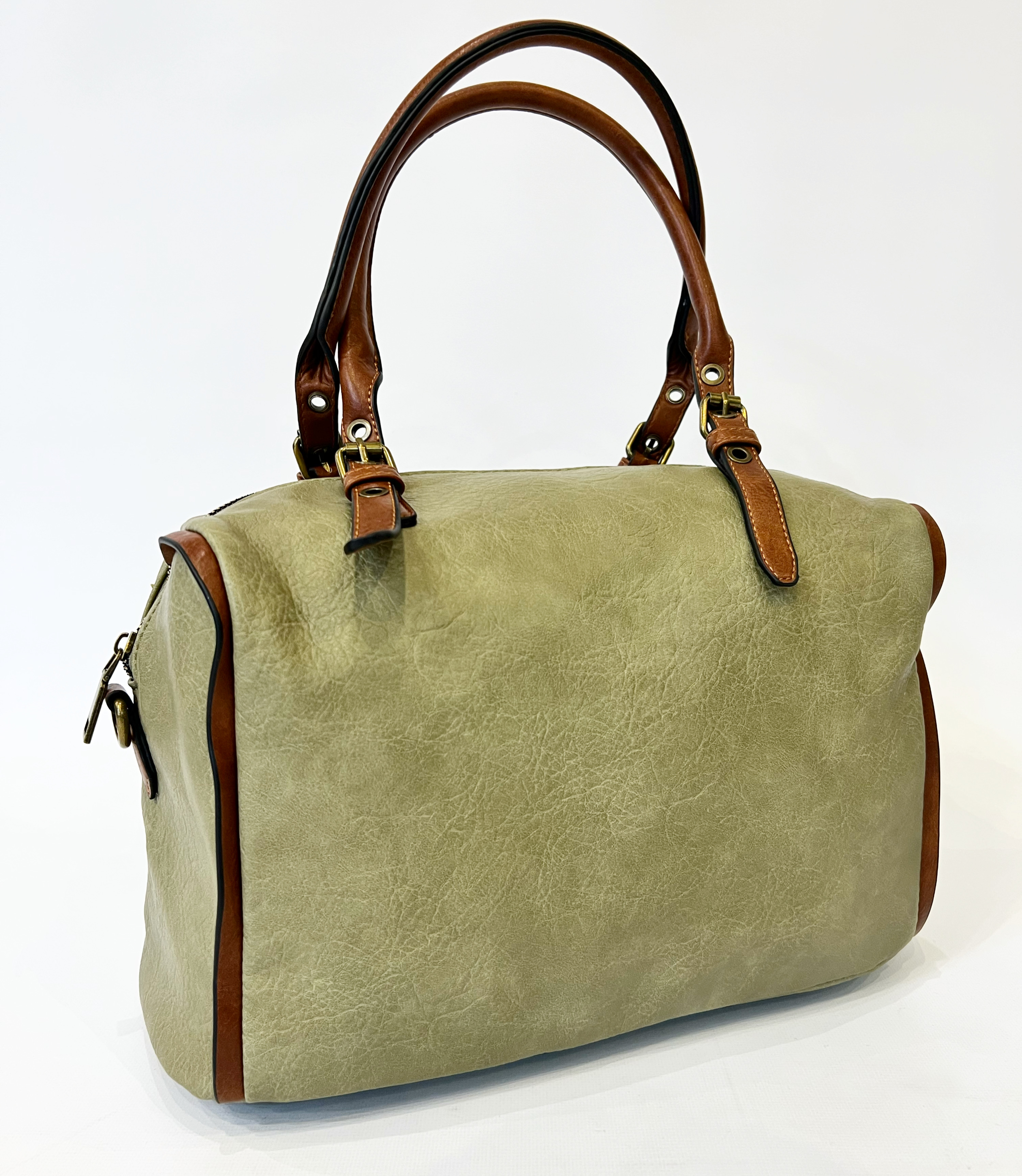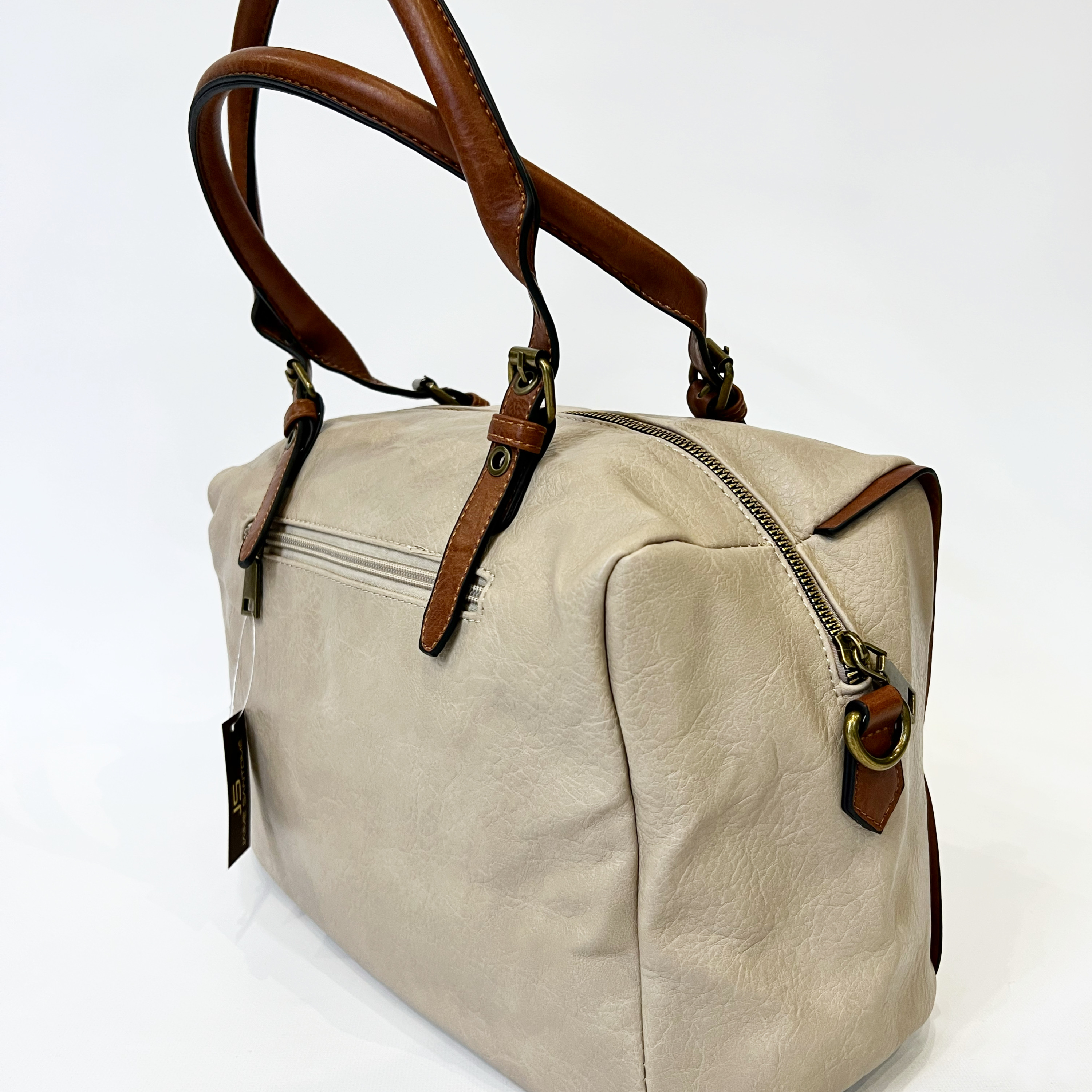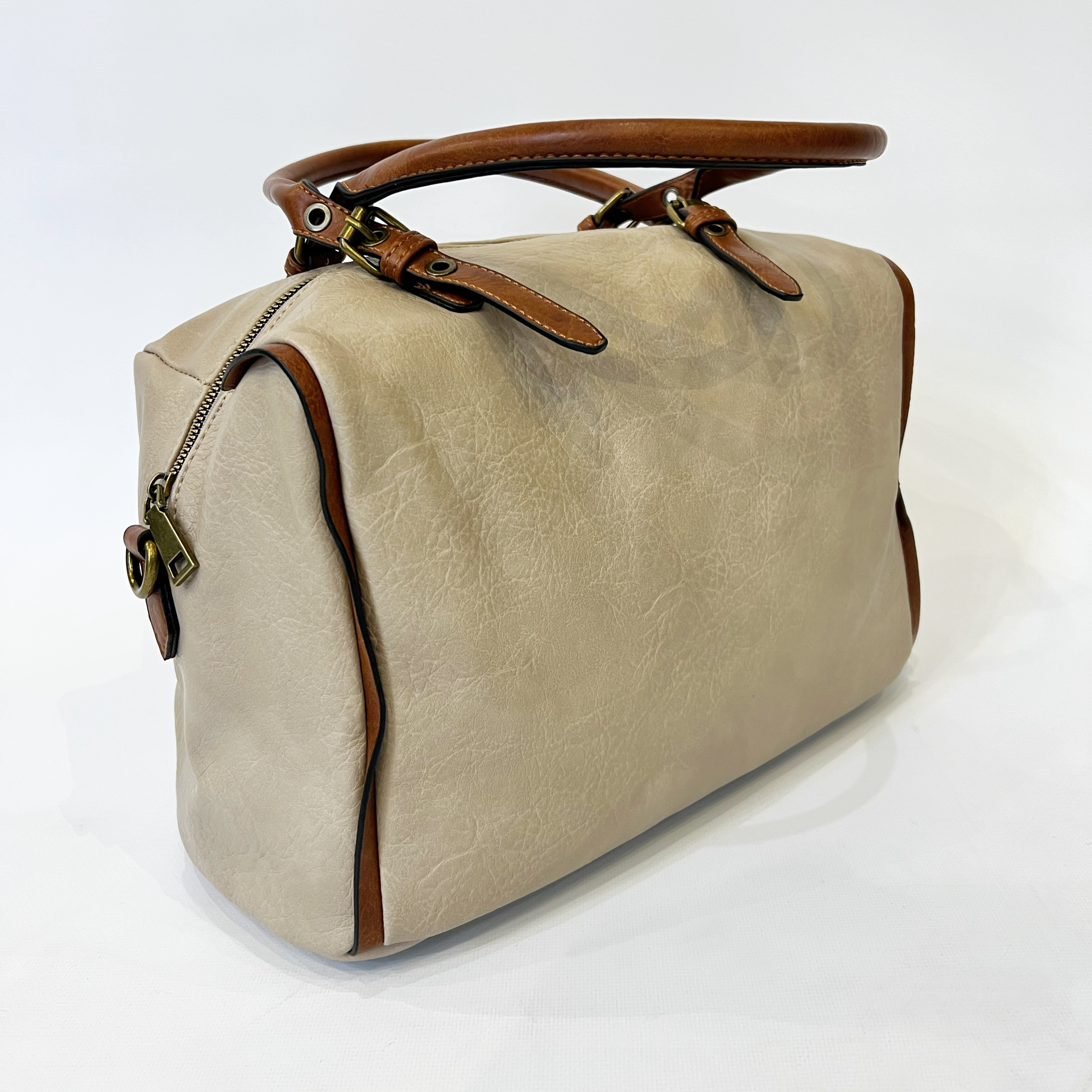 Bolso combinado de tacto suave y cierre de cremallera. Asa de mano, correa regulable para hombro y bordes laterales en color marrón. Cinco compartimentos independientes en interior, dos de ellos con cierre de cremallera. Un bolsillo exterior trasero con cierre de cremallera.