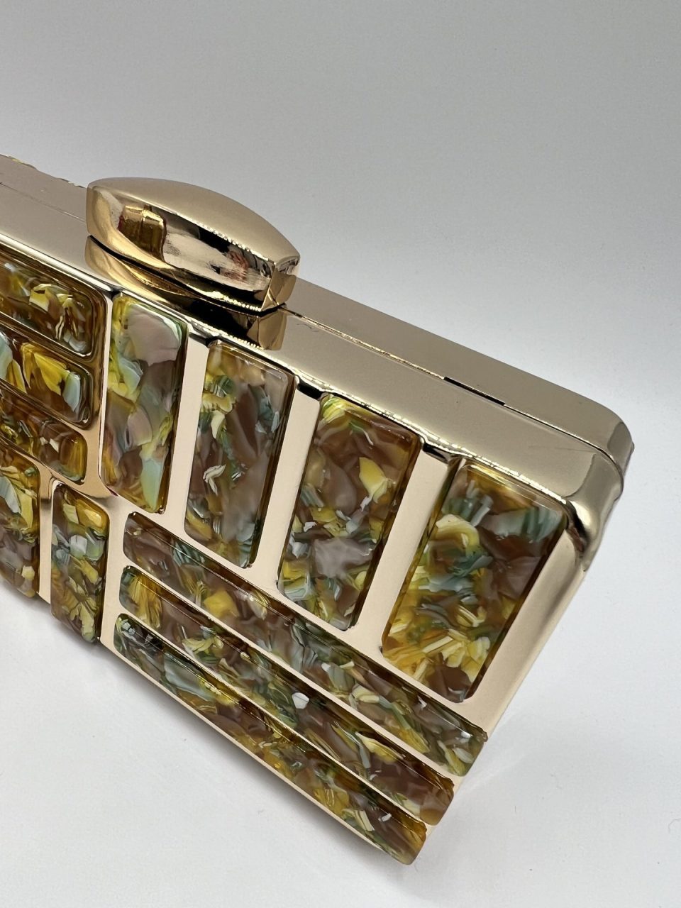 Bolso clutch, combinado en dorado y nácar por ambos lados. Interior forrado en tela. Cadena extraíble para colgar, de eslabones dorados.