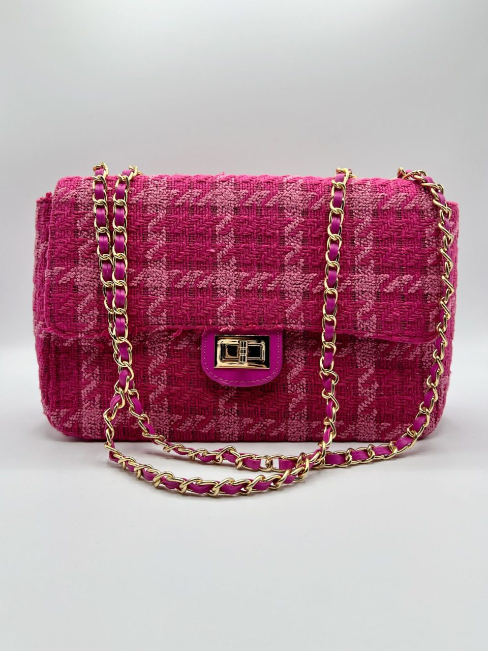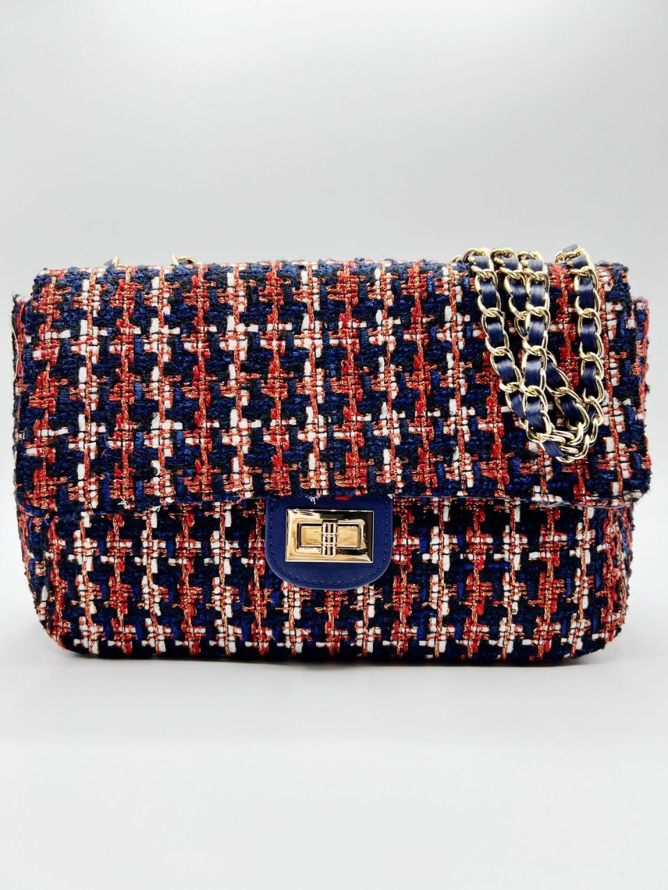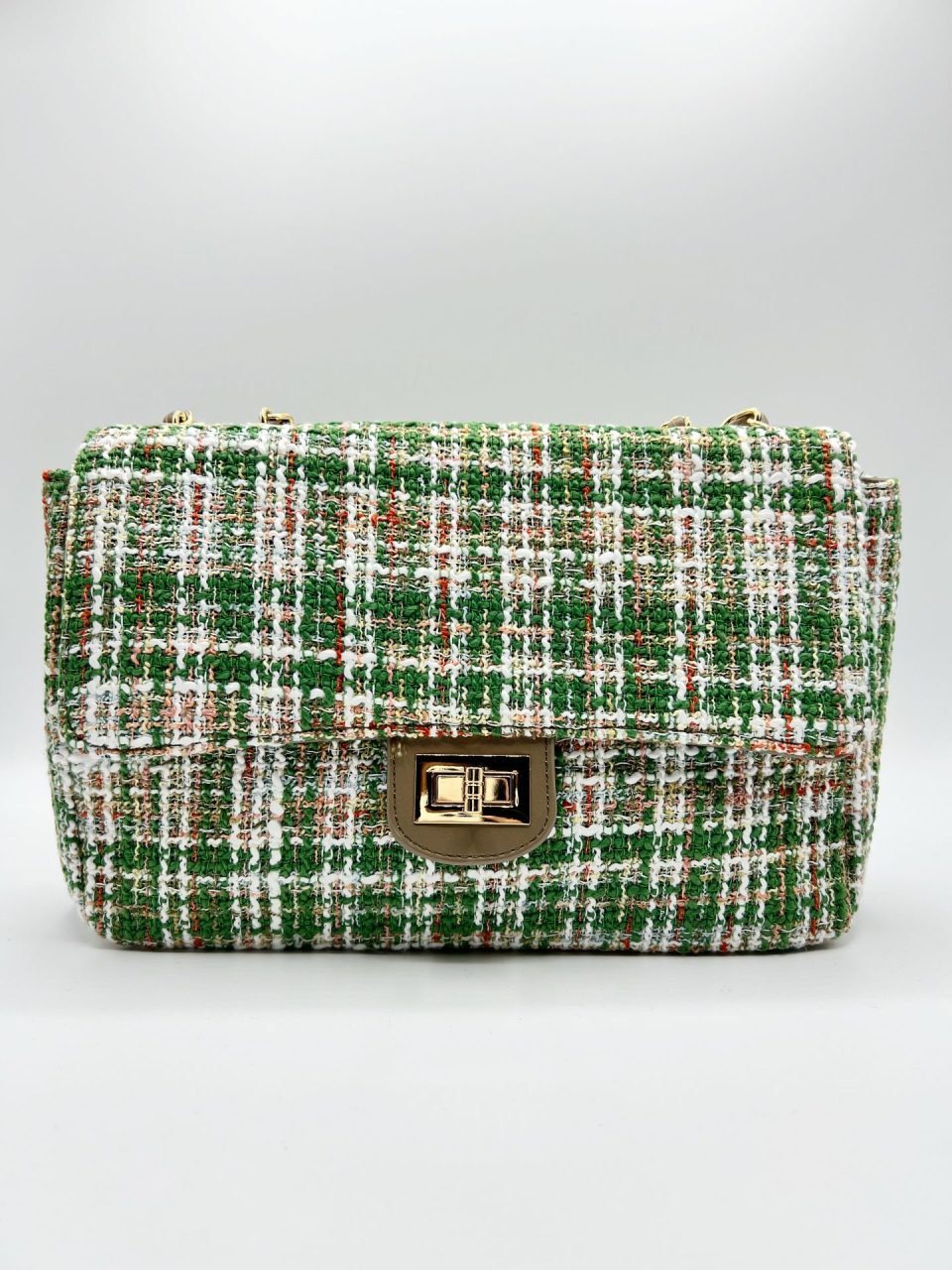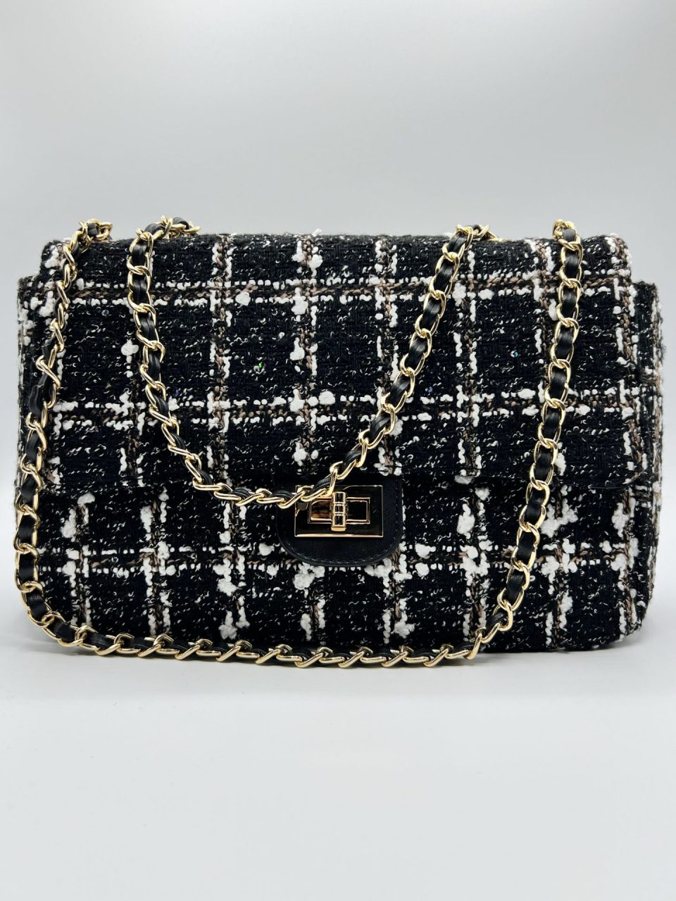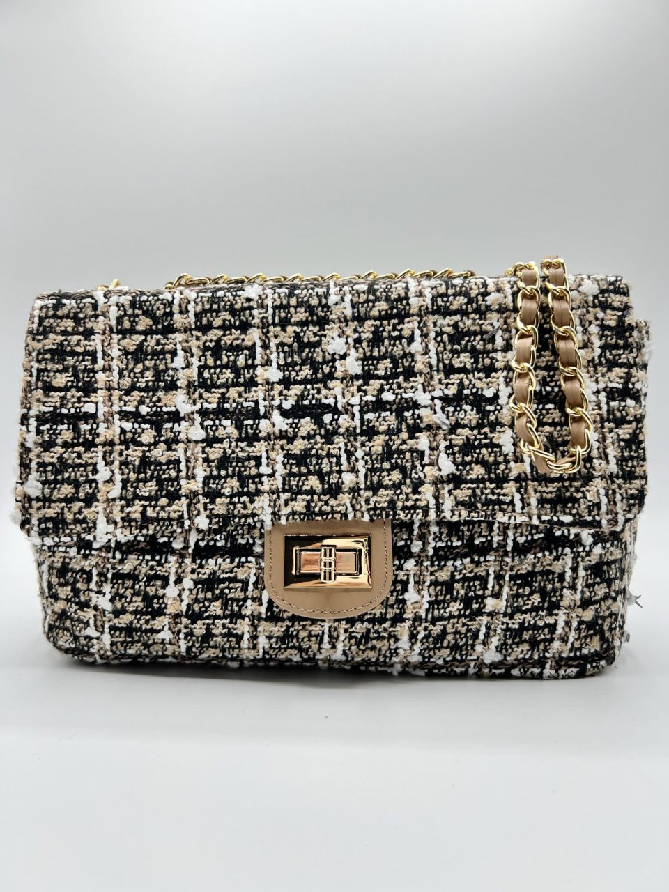 Bolso jaspeado Gales con base en PU. Dos bolsillos interiores, uno de ellos con cierre de cremallera. Correa de cadena para bandolera. Cierre de cremallera con solapa superior con cierre giratorio de metal. Medidas: 27x17x10. Composición exterior: 90% poliéster y 10% PU. Composición interior: 100% poliéster. Fornituras en metal dorado.