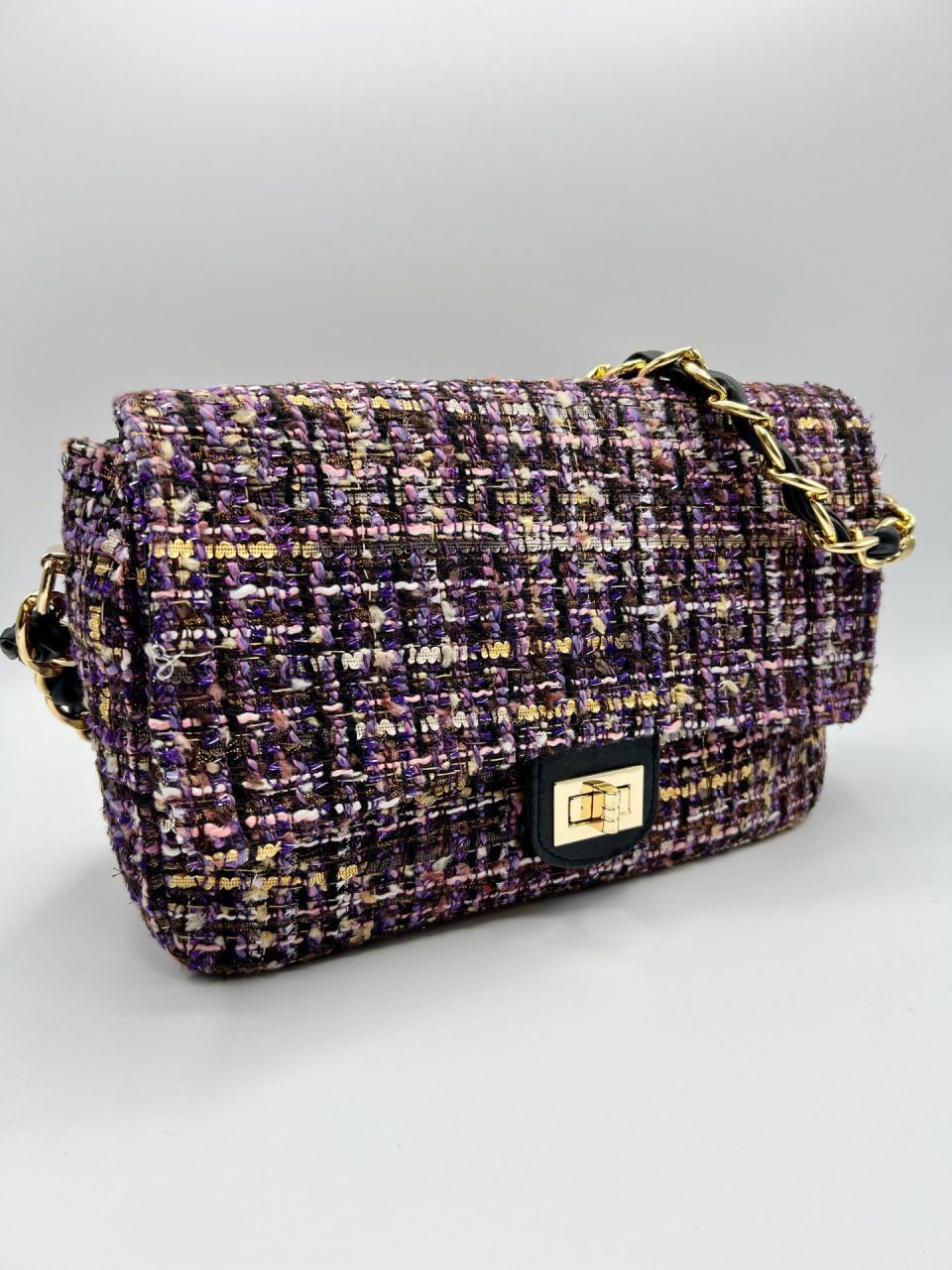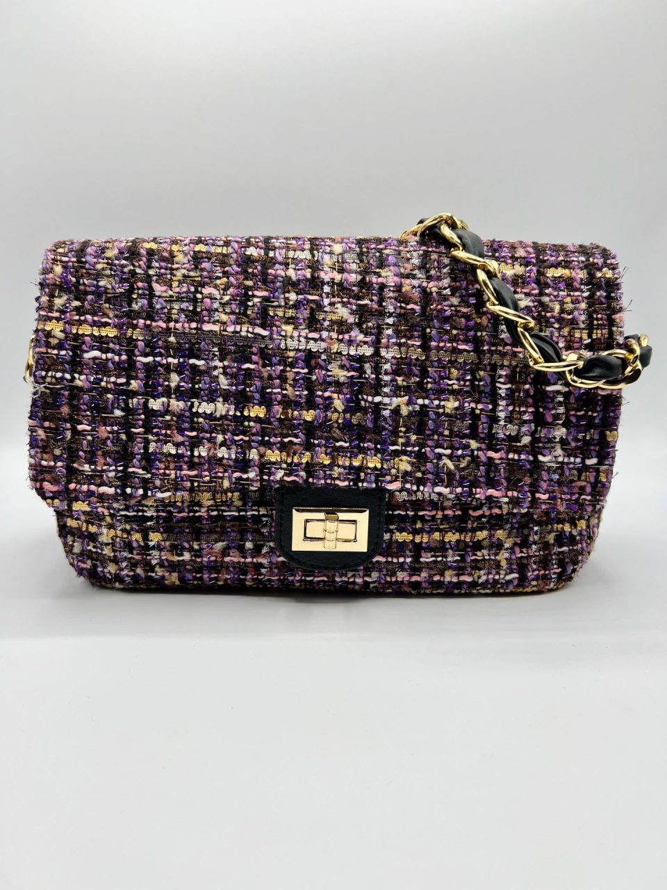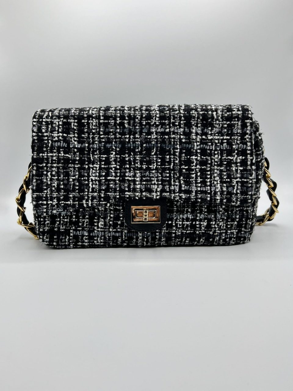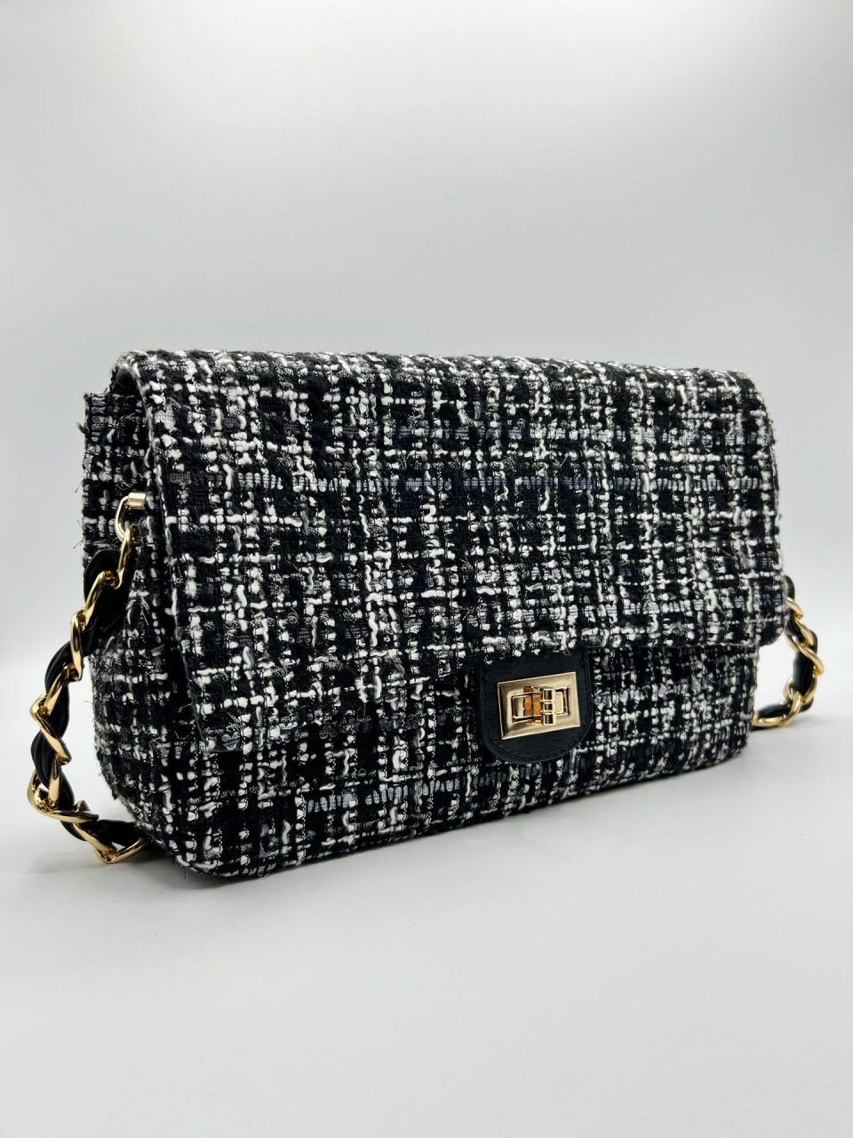 Bolso jaspeado con base en PU. Dos bolsillos interiores, uno de ellos con cierre de cremallera. Correa de cadena para bandolera. Cierre de cremallera con solapa superior con cierre giratorio de metal. Medidas: 27x17x10. Composición exterior: 90% poliéster y 10% PU. Composición interior: 100% poliéster. Fornituras en metal dorado.