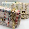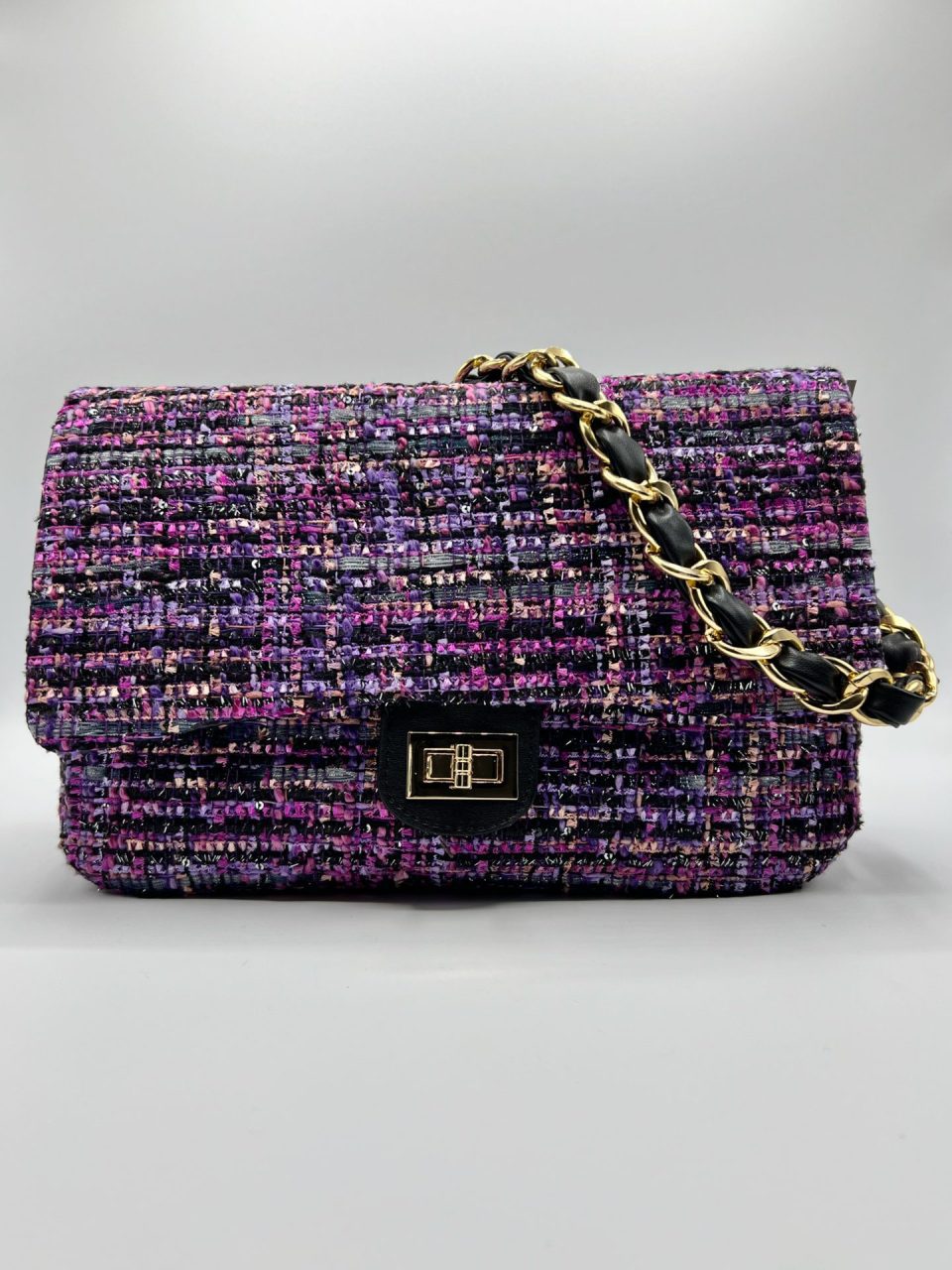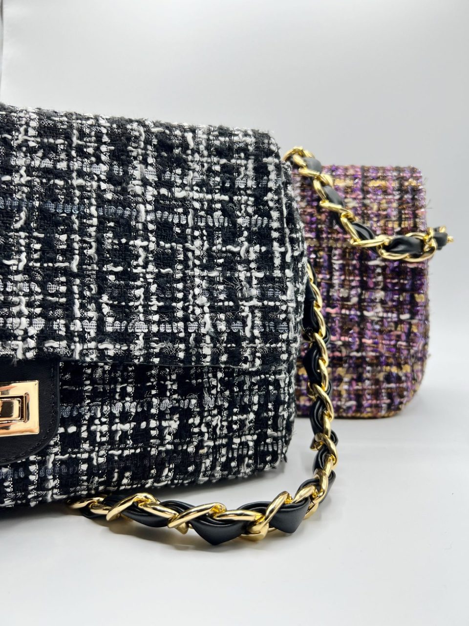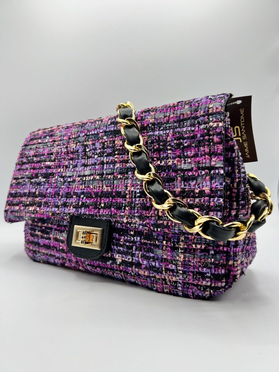 Bolso jaspeado con base en PU. Dos bolsillos interiores, uno de ellos con cierre de cremallera. Correa de cadena para bandolera. Cierre de cremallera con solapa superior con cierre giratorio de metal. Medidas: 27x17x10. Composición exterior: 90% poliéster y 10% PU. Composición interior: 100% poliéster. Fornituras en metal dorado.