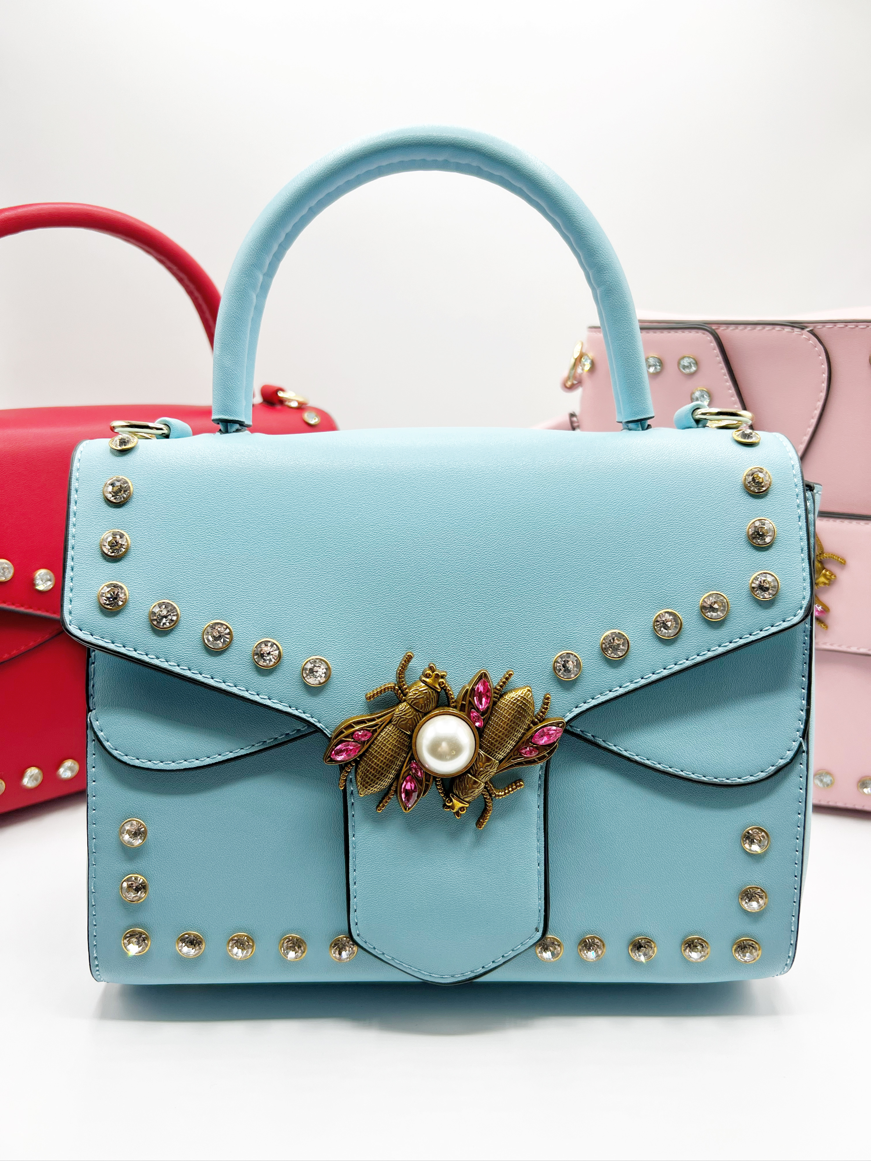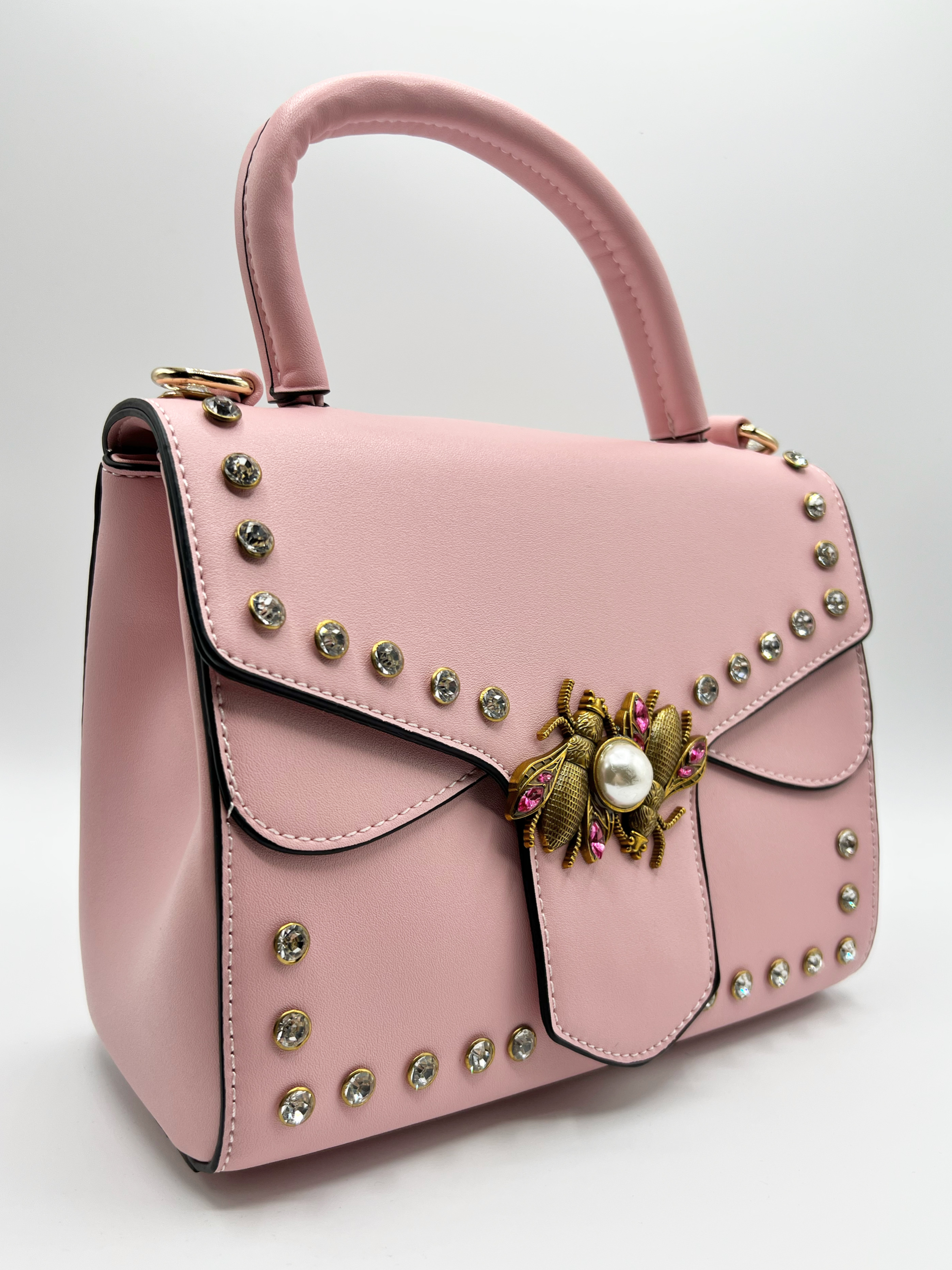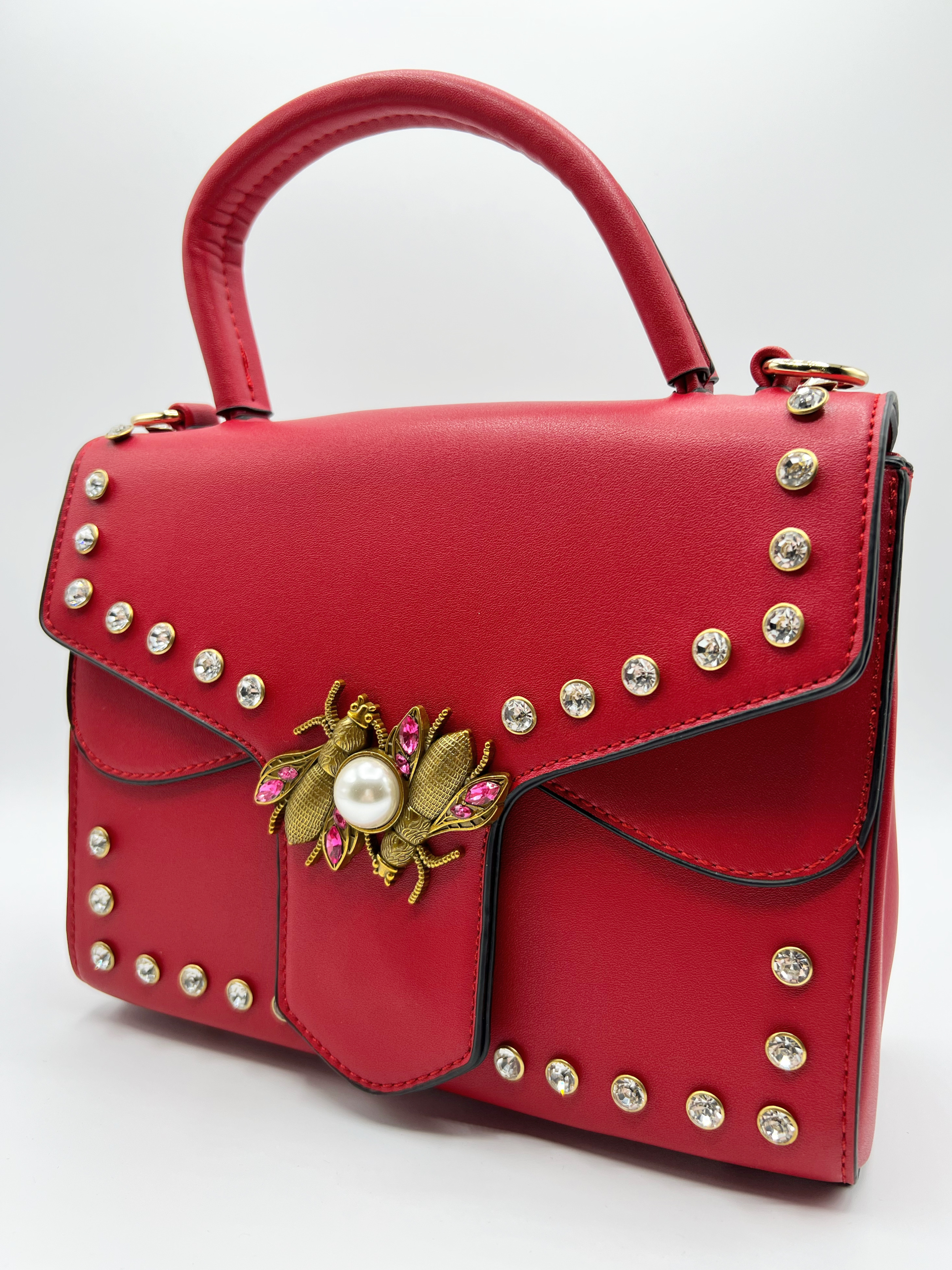 Bolso de mano con asa y correa de cadena opcional para bandolera. Seis compartimentos interiores y bolsillo exterior trasero con cremallera. Cierre de cremallera y solapa exterior con cierre de botón de imán. Dos abejas en metal con media perla y tachuelas en cristal sobre metal. Cuatro pernos de apoyo en inferior.
