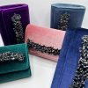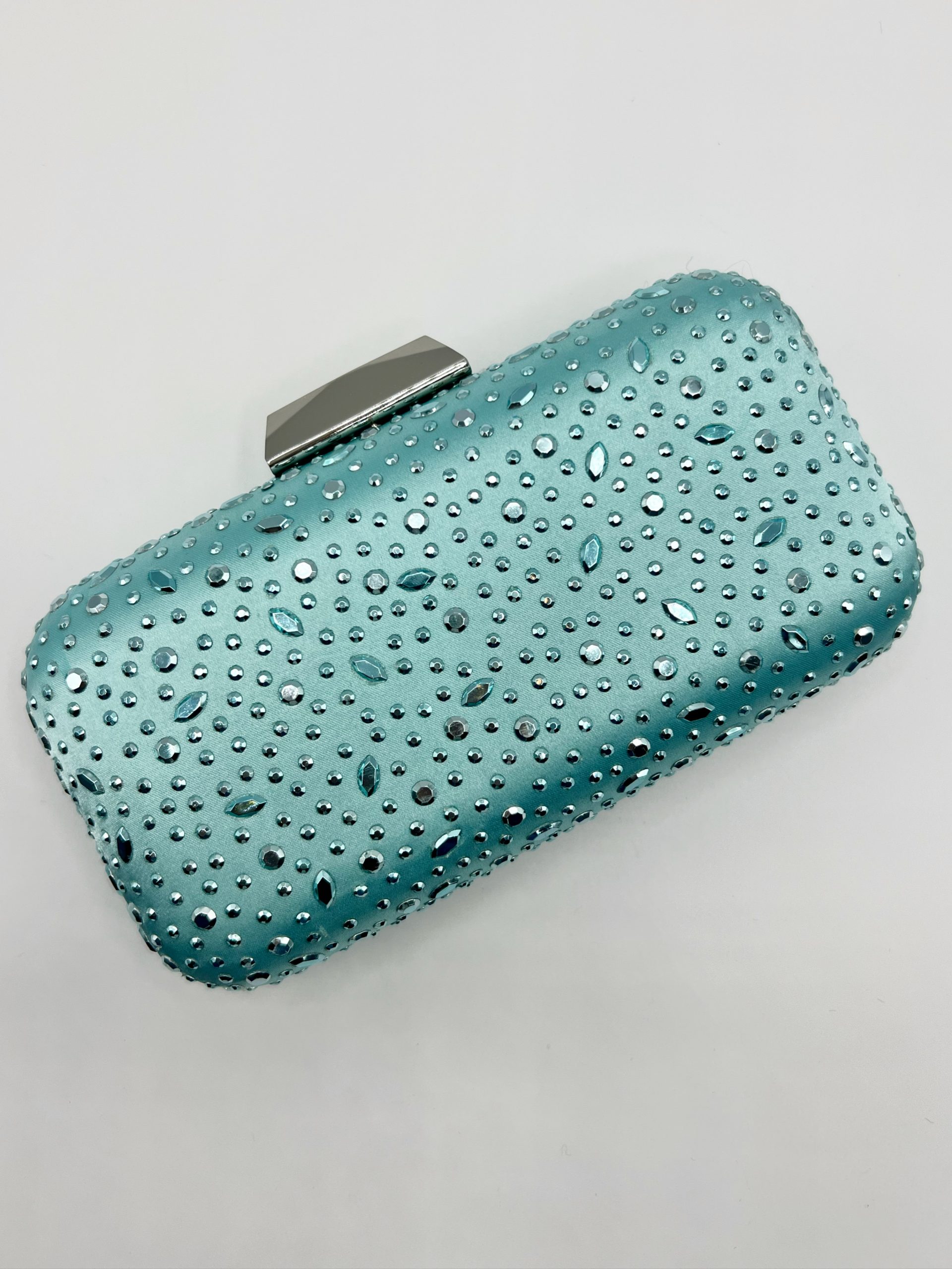 Bolso de mano tipo clutch con relieves del mismo color en ambos lados. Cadena metálica para colgar. 100% poliéster. Medidas: 18 x 10 x 4,5 cm. (largo x alto x ancho).