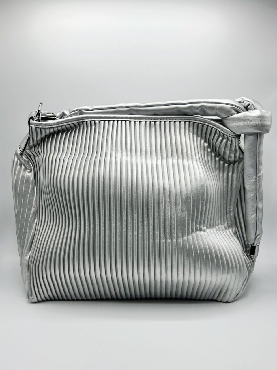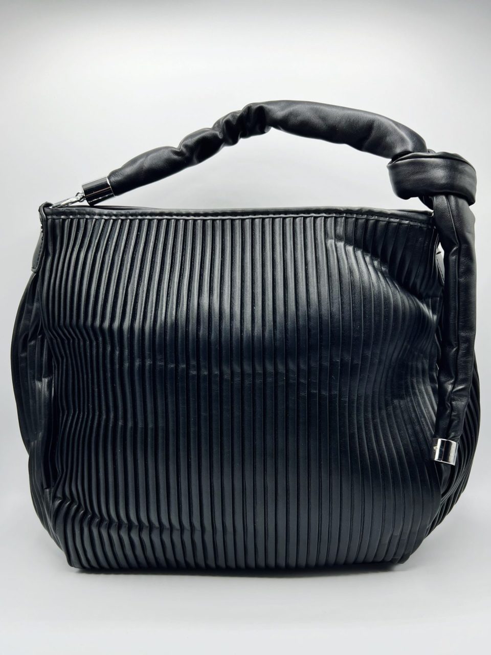 Bolso plisado exterior con dos compartimentos y tres bolsillos interiores, dos de ellos con cremallera y un bolsillo exterior de cremallera. Asa con detalle de nudo y cierre de cremallera. Exterior: 100% PU e Interior (forro): 100% poliéster. Fornituras en metal plateado.