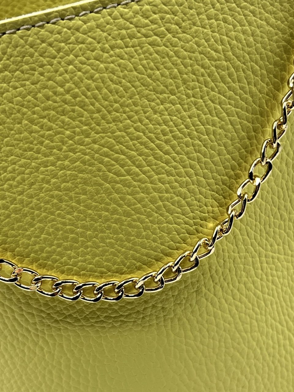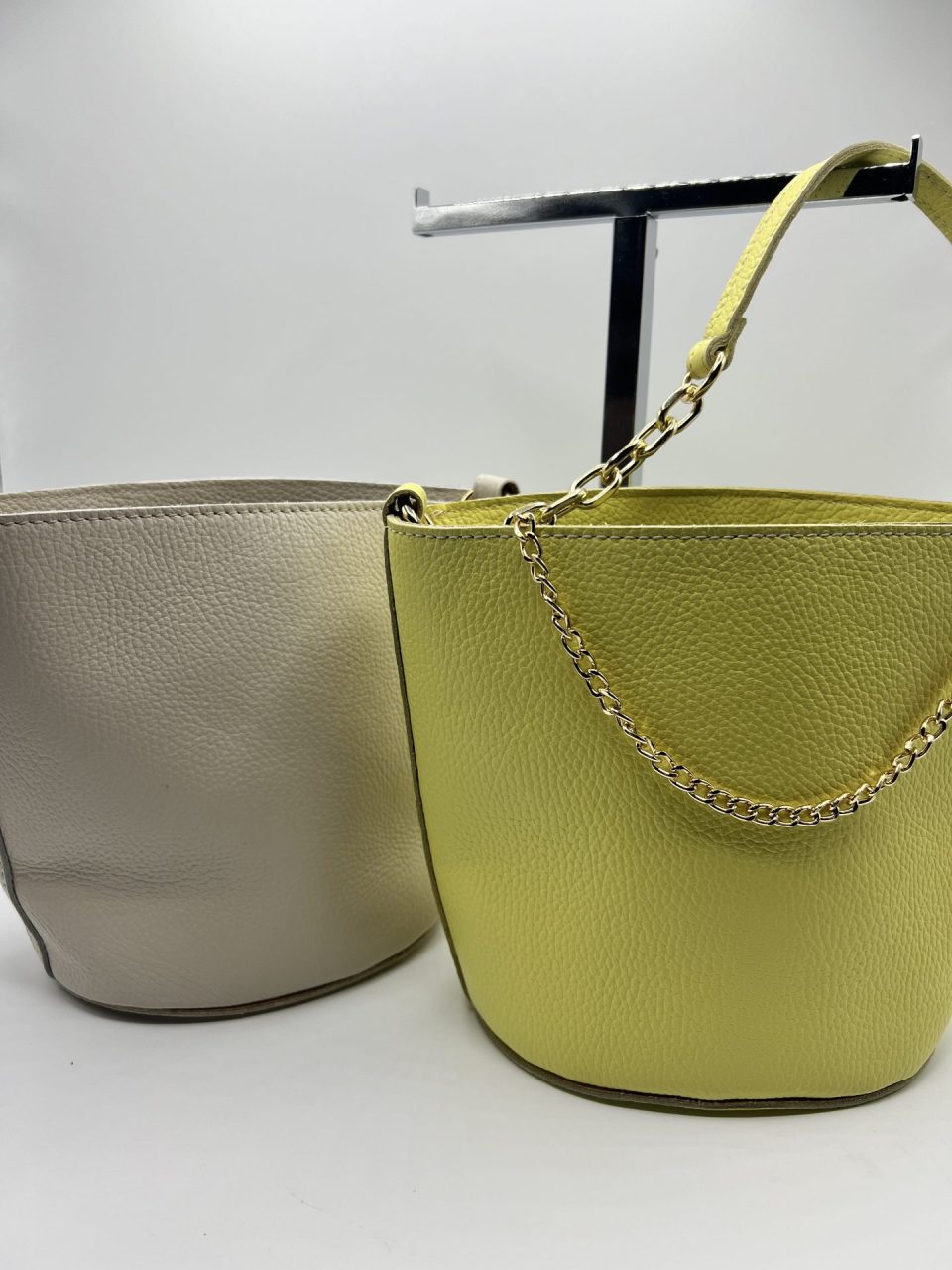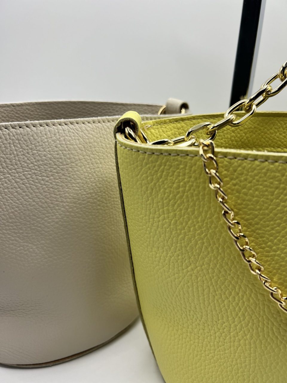Bolso saco interior en piel genuína, con cierre de cordones. Asa corta mixta en piel y cadena dorada y cadena para bandolera con enganches de mosquetón. Medidas: 18x20x14 cm. Made in Italy.