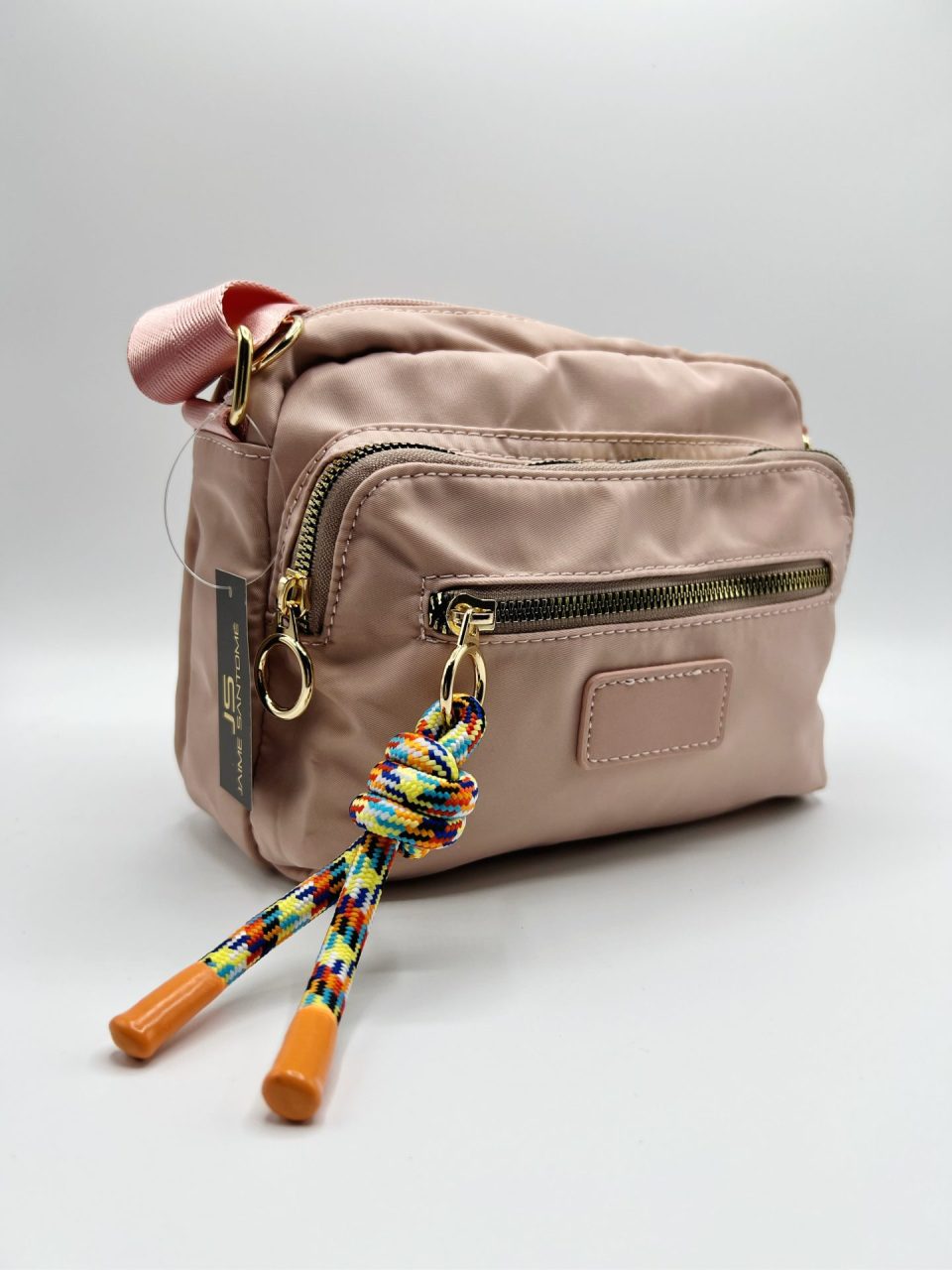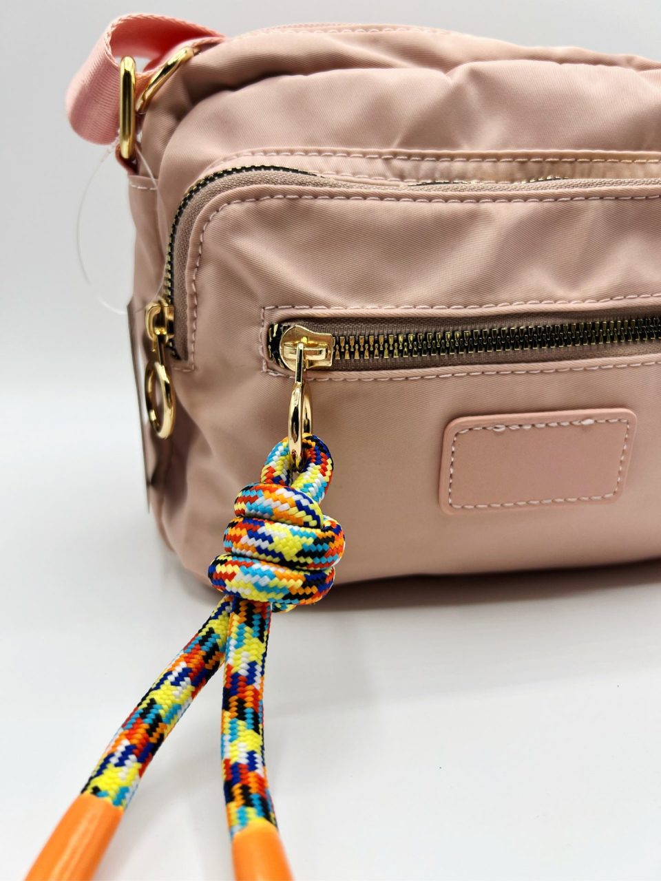 Bolso pequeño tipo bandolera, de correa ancha. Tres bolsillos exteriores de cremallera y tres en interior, uno de ellos con cremallera. Detalle de colgante de cordones multicolor. Cierre de cremallera. Composición interior y exterior en poliéster. Fornituras en metal dorado.