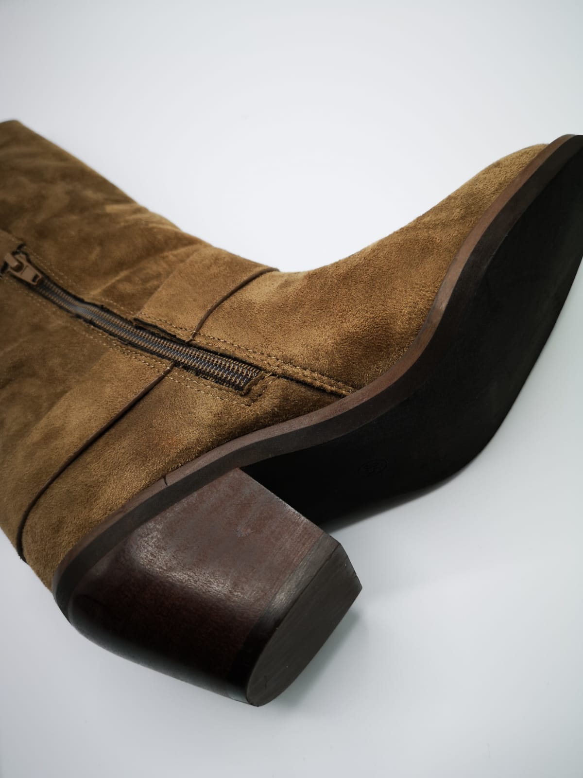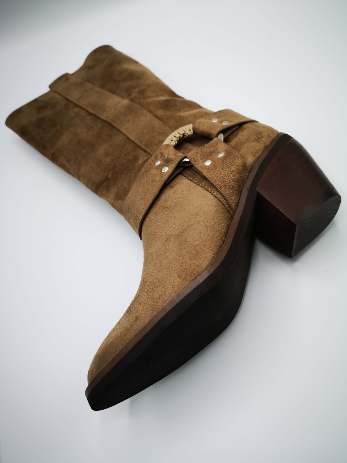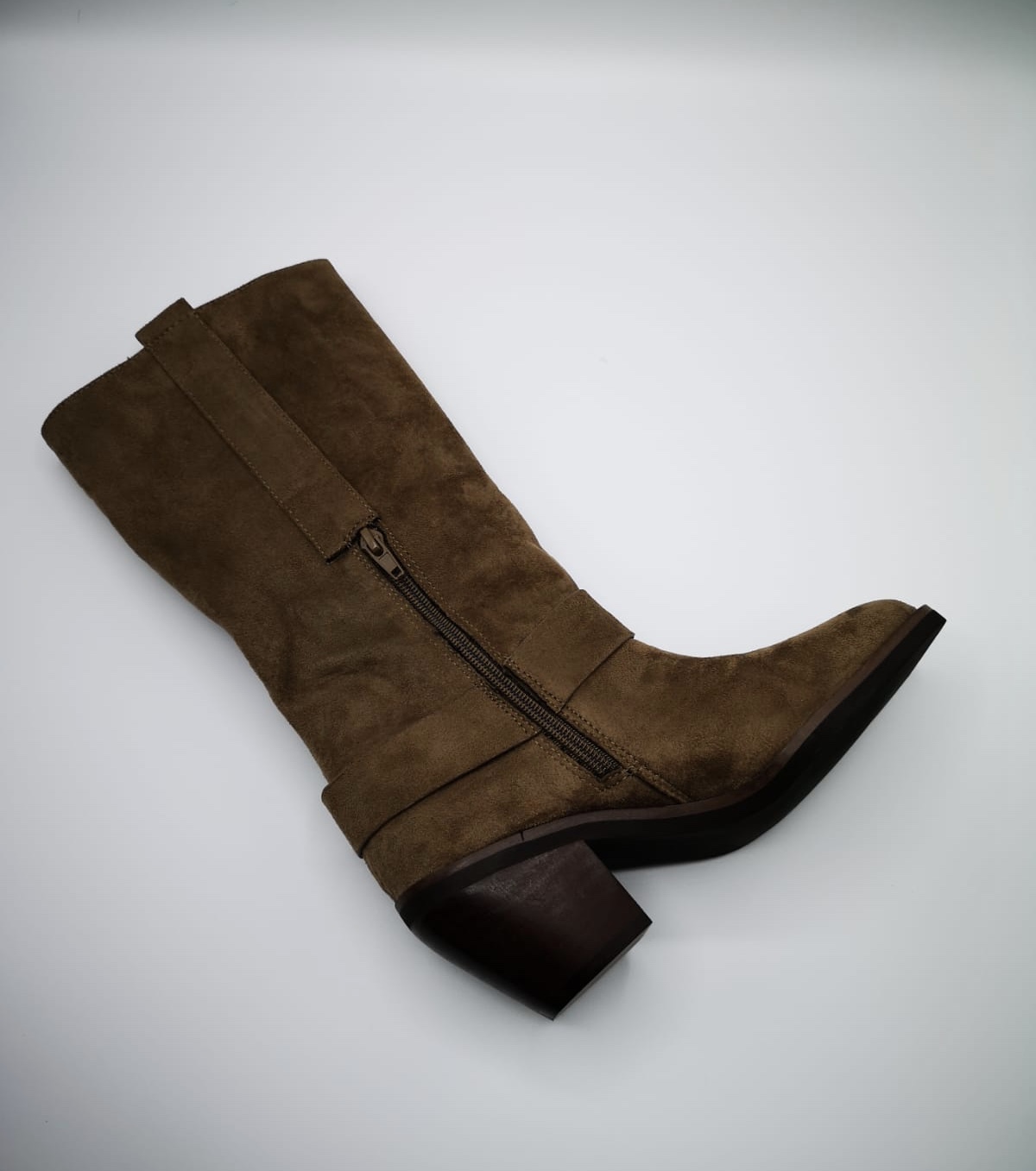 Bota campera antelina con detalle circular. Caña media. Tacón de 7 cm. Cierre de cremallera.