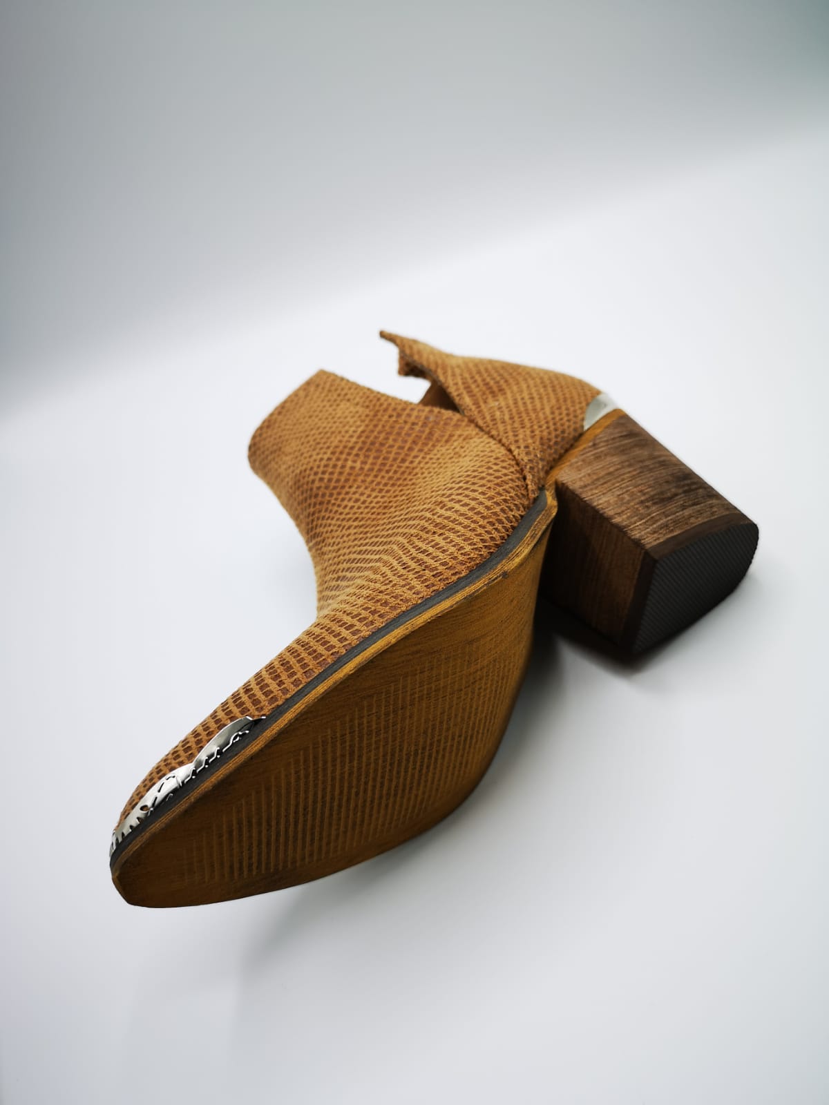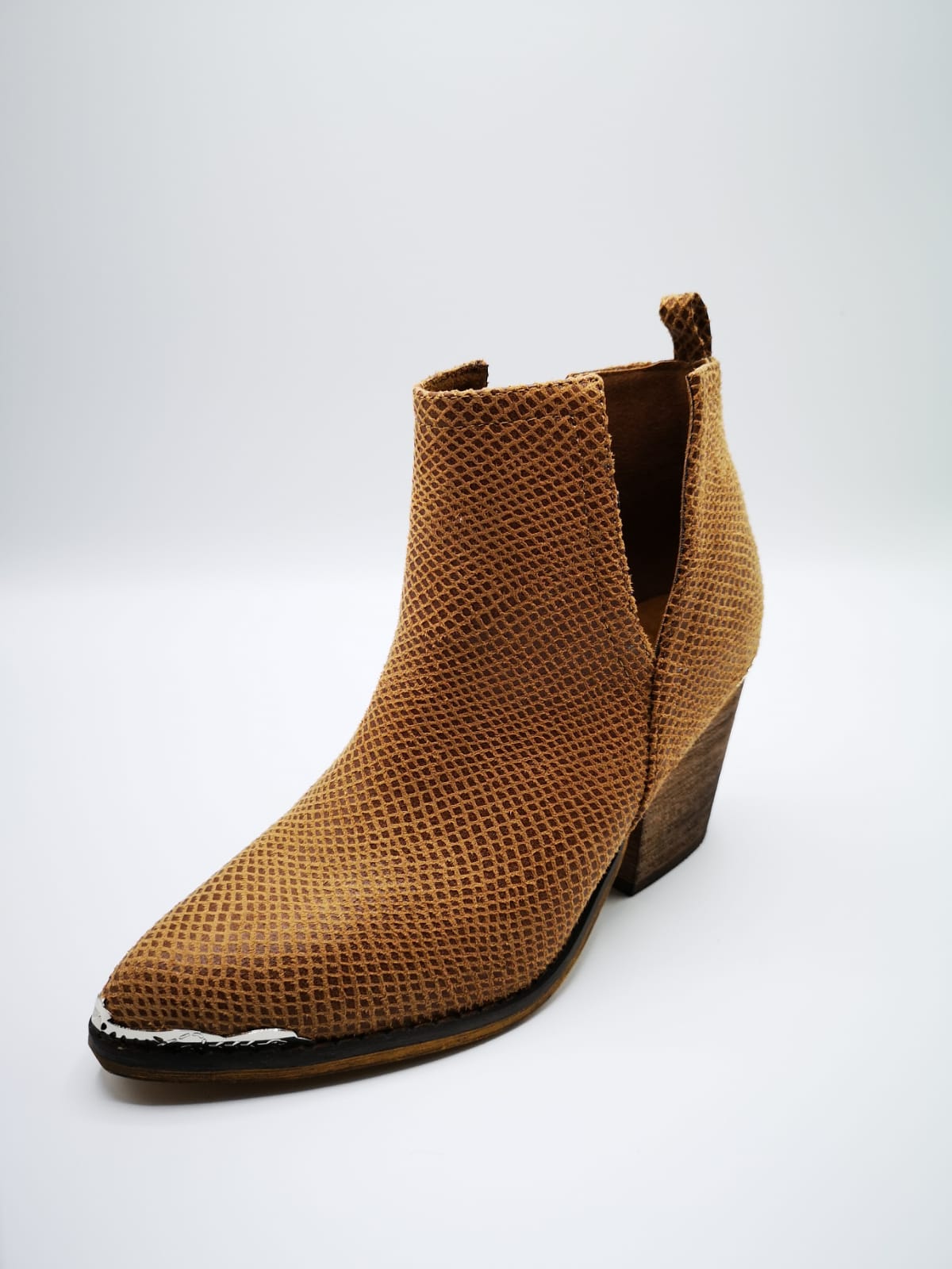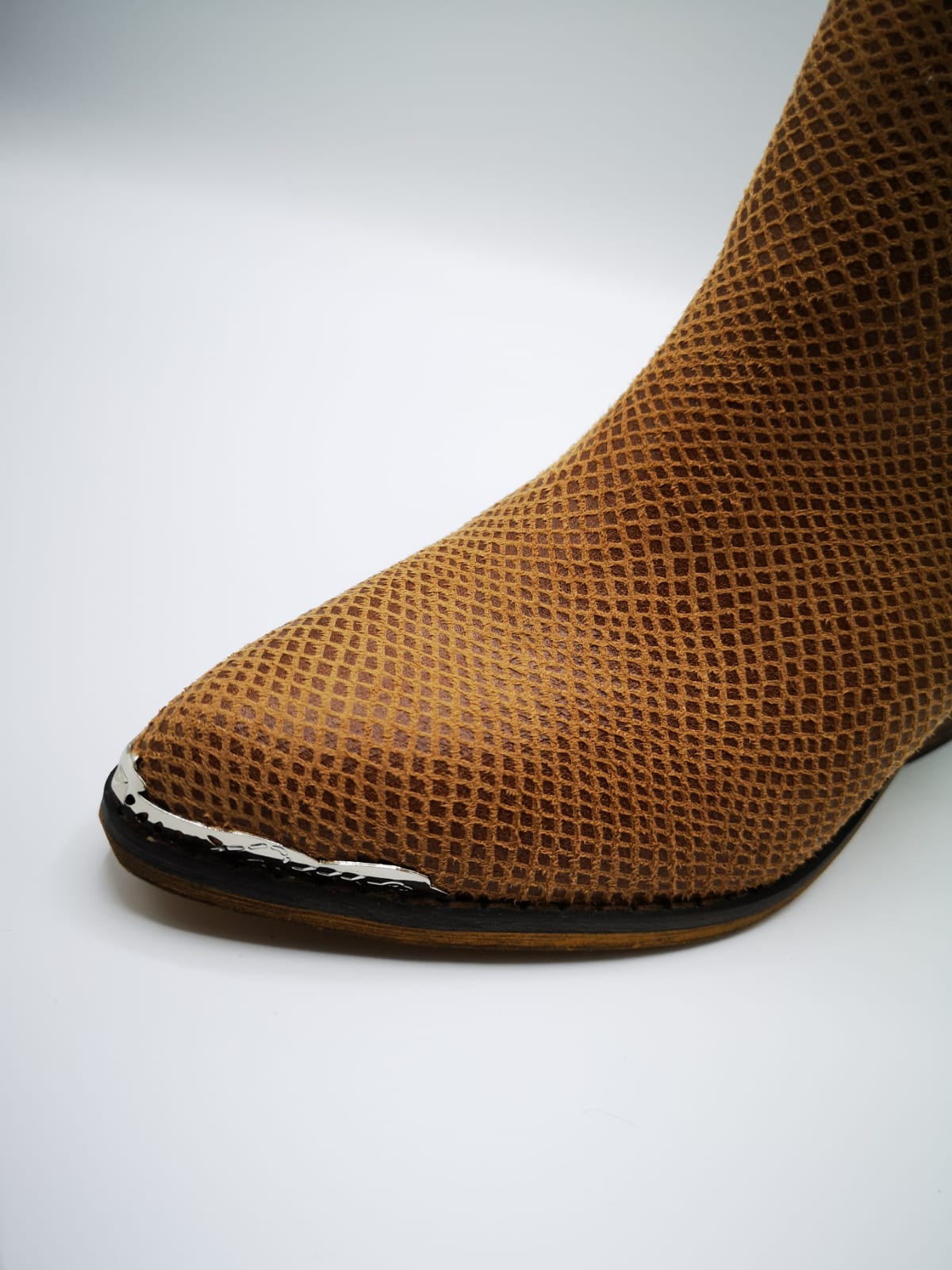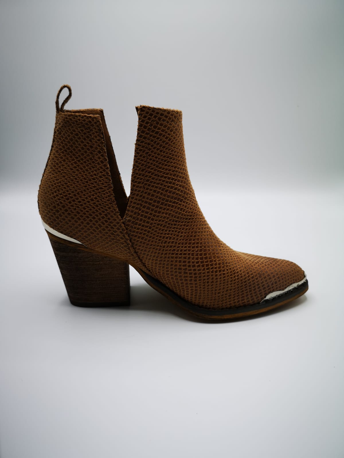 Botin en material grabado rejilla, con detalle dorado en punta y talón. Tobillo abierto. Cierre de ajuste al pie. Tacón de 7,2 cm.