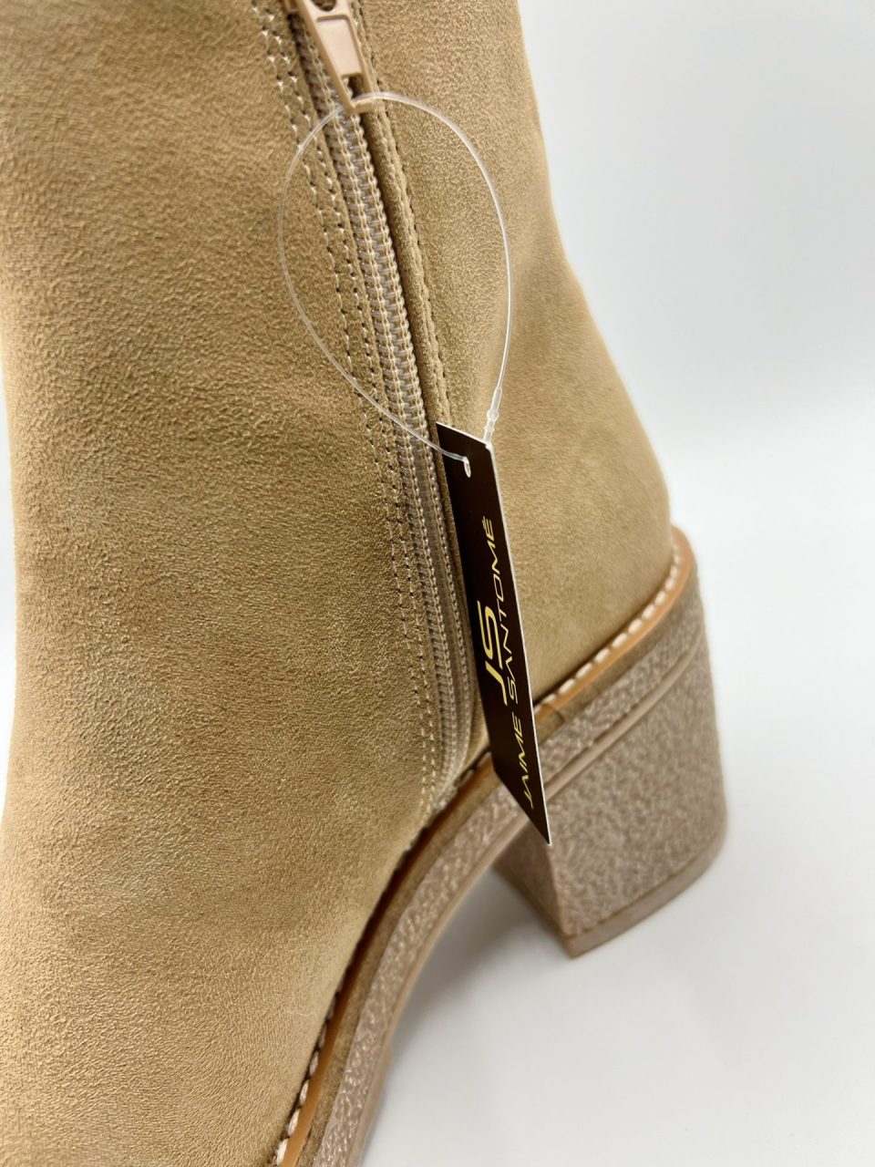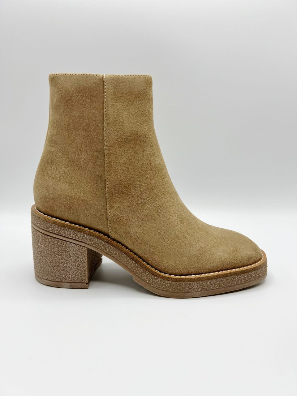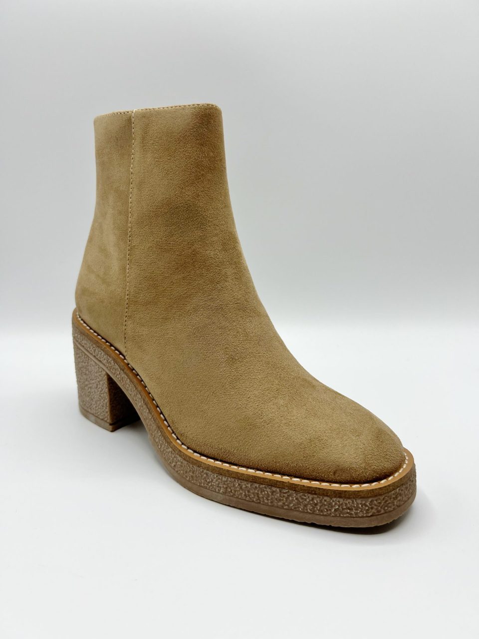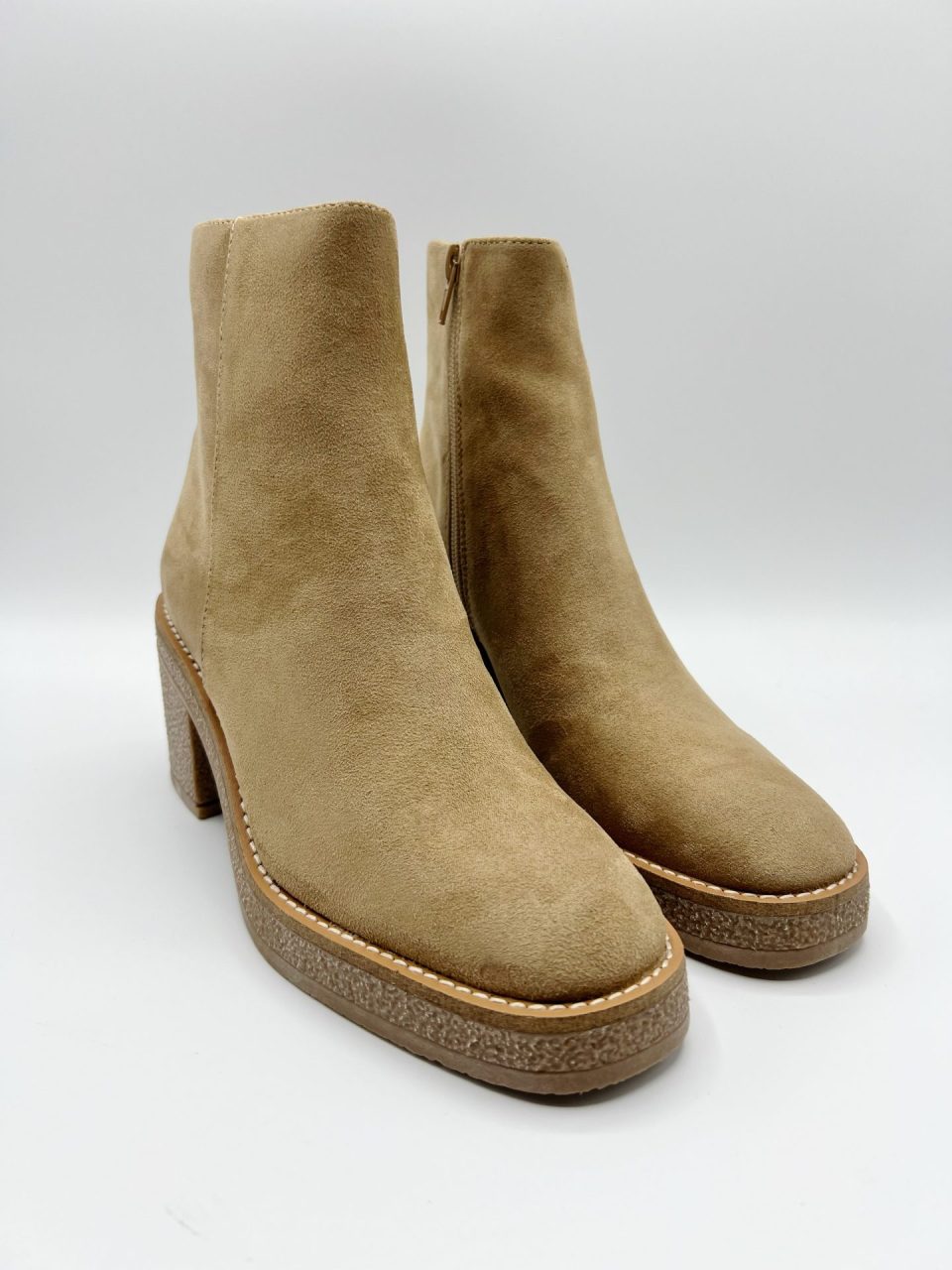Botín antelina con tacón crepe de bloque ancho, de 6,5 cm de alto y ligera plataforma de 2 cm.. Puntera redondeada. Cierre de cremallera. Empeine, forro y plantilla en textil y Piso sintético.
