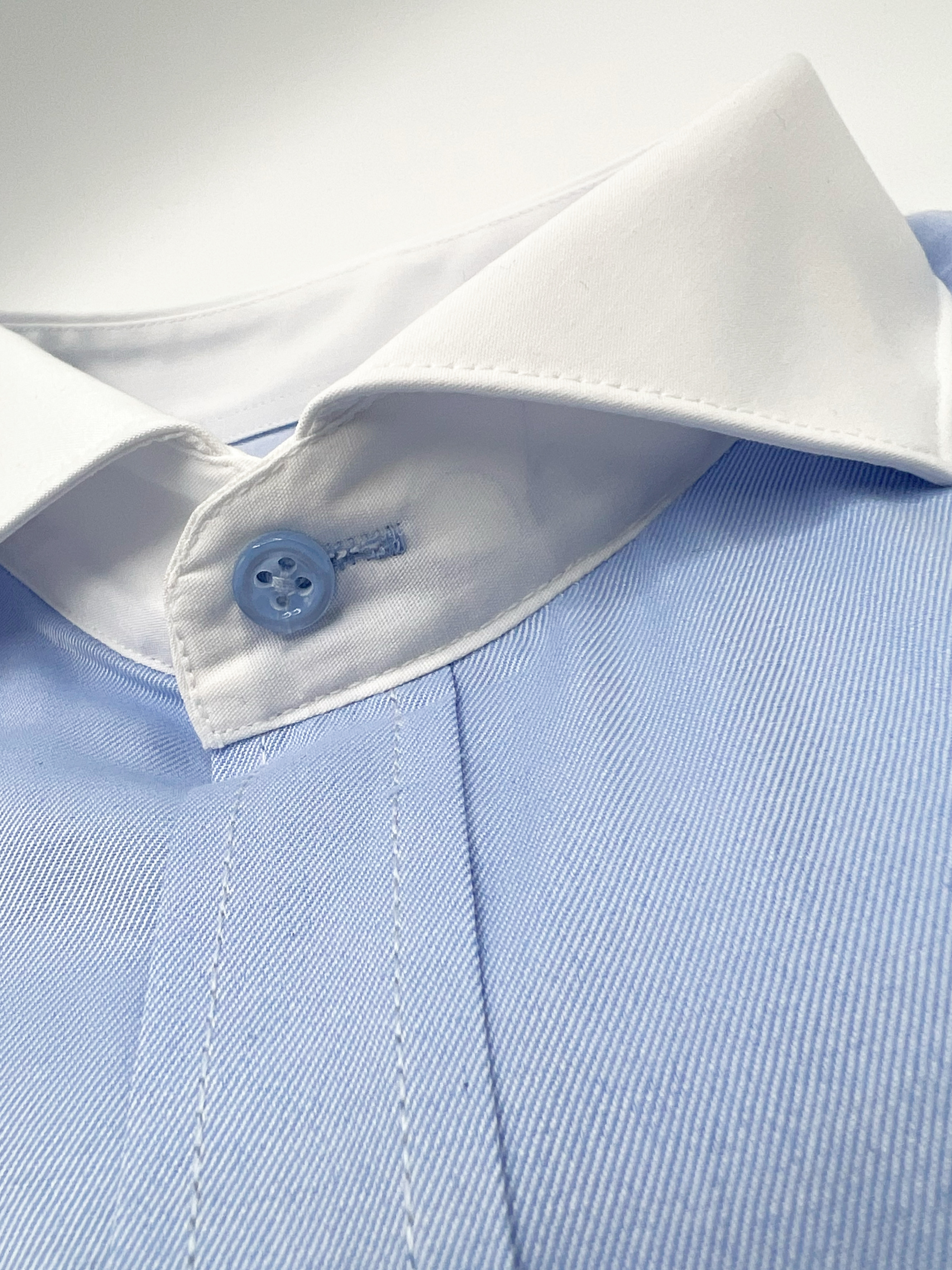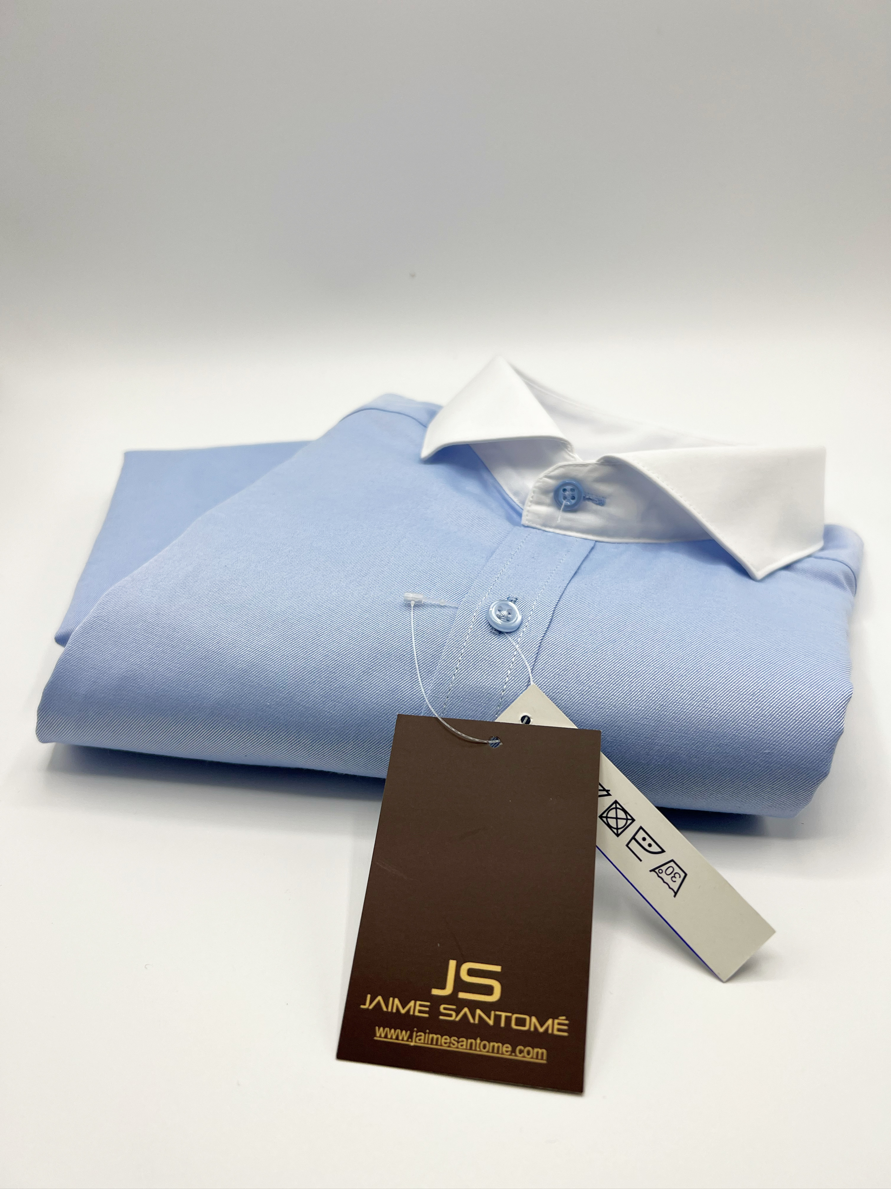 Camisa azul claro con puños y cuello italiano en blanco. Doble botón en puño con separación de 2,5 cm. Cierre de botones en color tejido azul claro. 80% algodón y 20% viscosa. Diseñado en España. Fabricado en Turquía. Supreme qualitty.