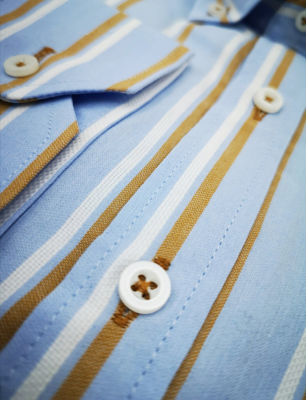 Camisa slim fit a doble raya en blanco y mostaza. Cuello double button. Manga larga con dos botones de ajuste en puño y otro superior de cierre abertura. Cierre de botonadura. 80% algodón y 20% poliester. Diseñado en España. Fabricado en Turquía. Supreme qualitty.