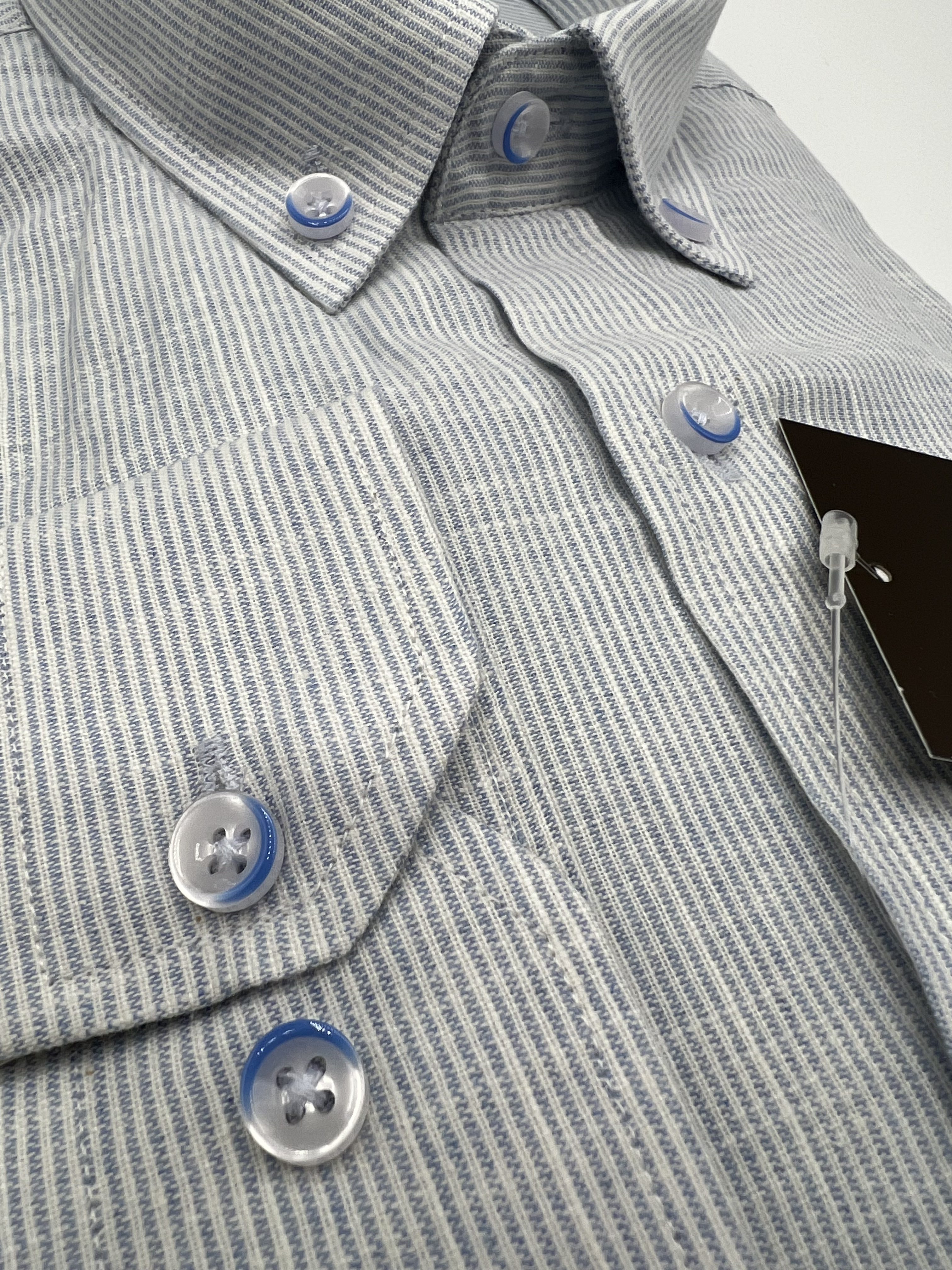 Camisa Slim Fit en color blanco con rayas en celeste. Cuello Button Down. Manga larga con dos botones de ajuste en puño y otro superior de cierre abertura. Cierre de botonadura. 80% algodón y 20% lycra. Diseñado en España. Fabricado en Turquía.