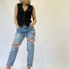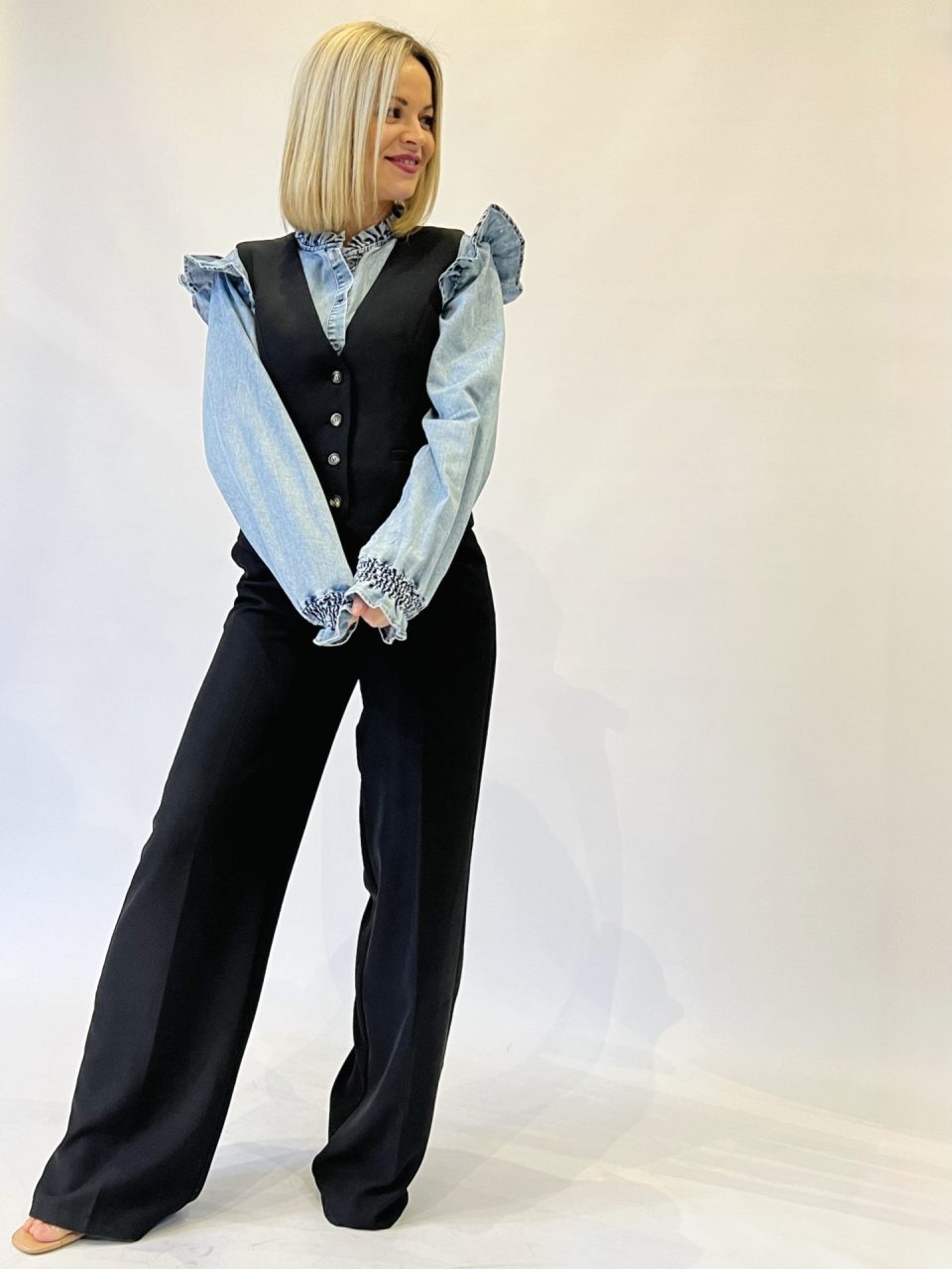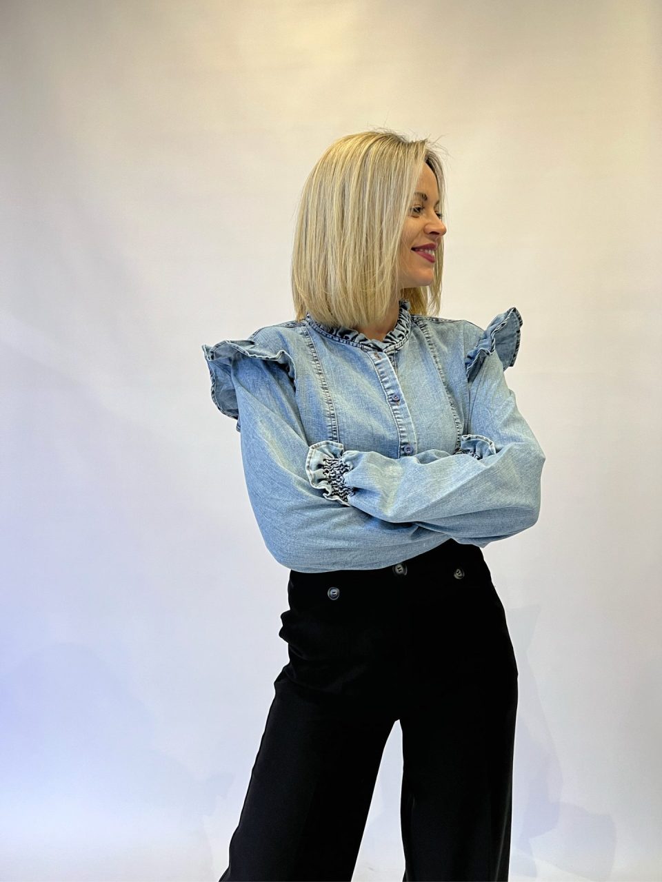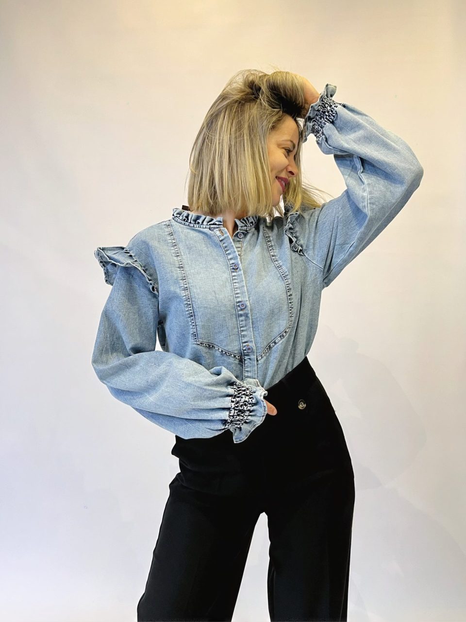Camisa vaquera de cuello redondo con volantes y manga larga acabada en fruncido y volantes. Bajo asimétrico y cierre frontal de botonadura. 100% algodón.
