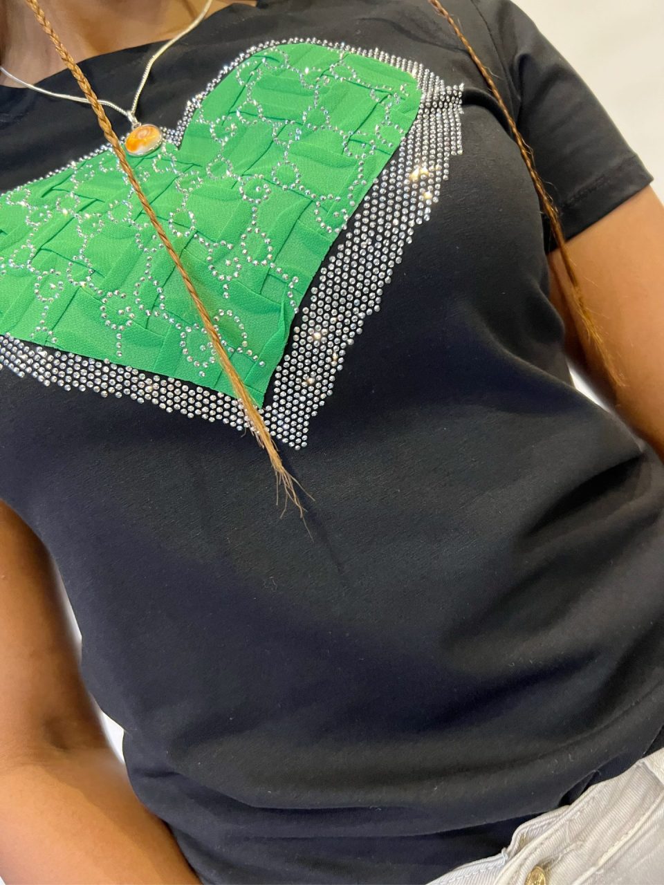 Camiseta mujer de cuello redondo y manga corta. Estampado de corazón en frontal con brillos en relieve. 95% algodón y 5% elastano.