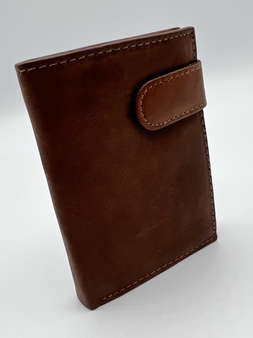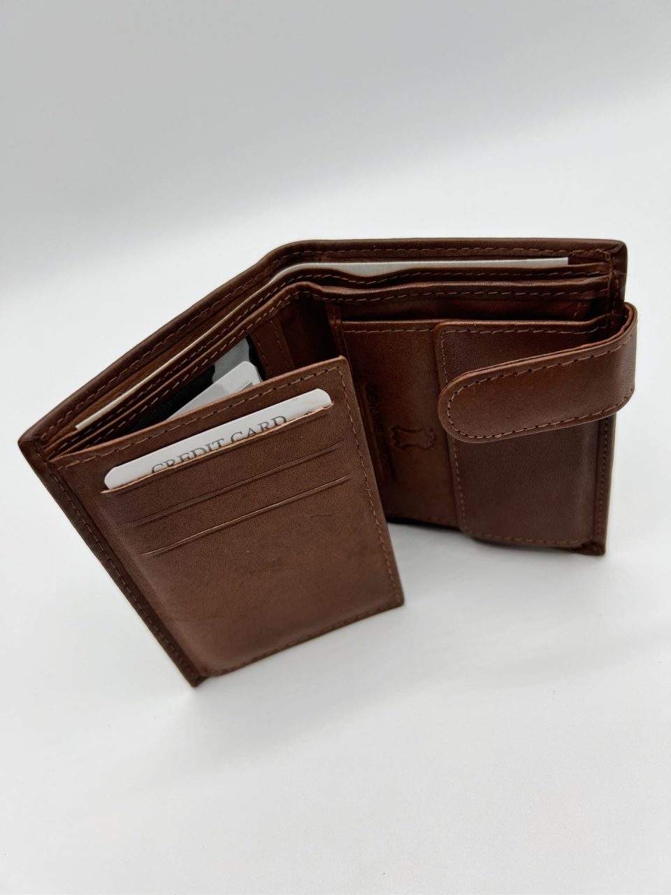 Cartera, billetera y tarjetero hombre en piel genuina. Diversos compartimentos para documentación, tarjetas, monedas y billetes. Medidas: 10,50 x 8 x 2,2 cm. Cierre de botón de presión.