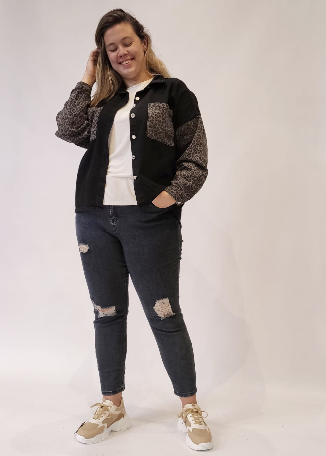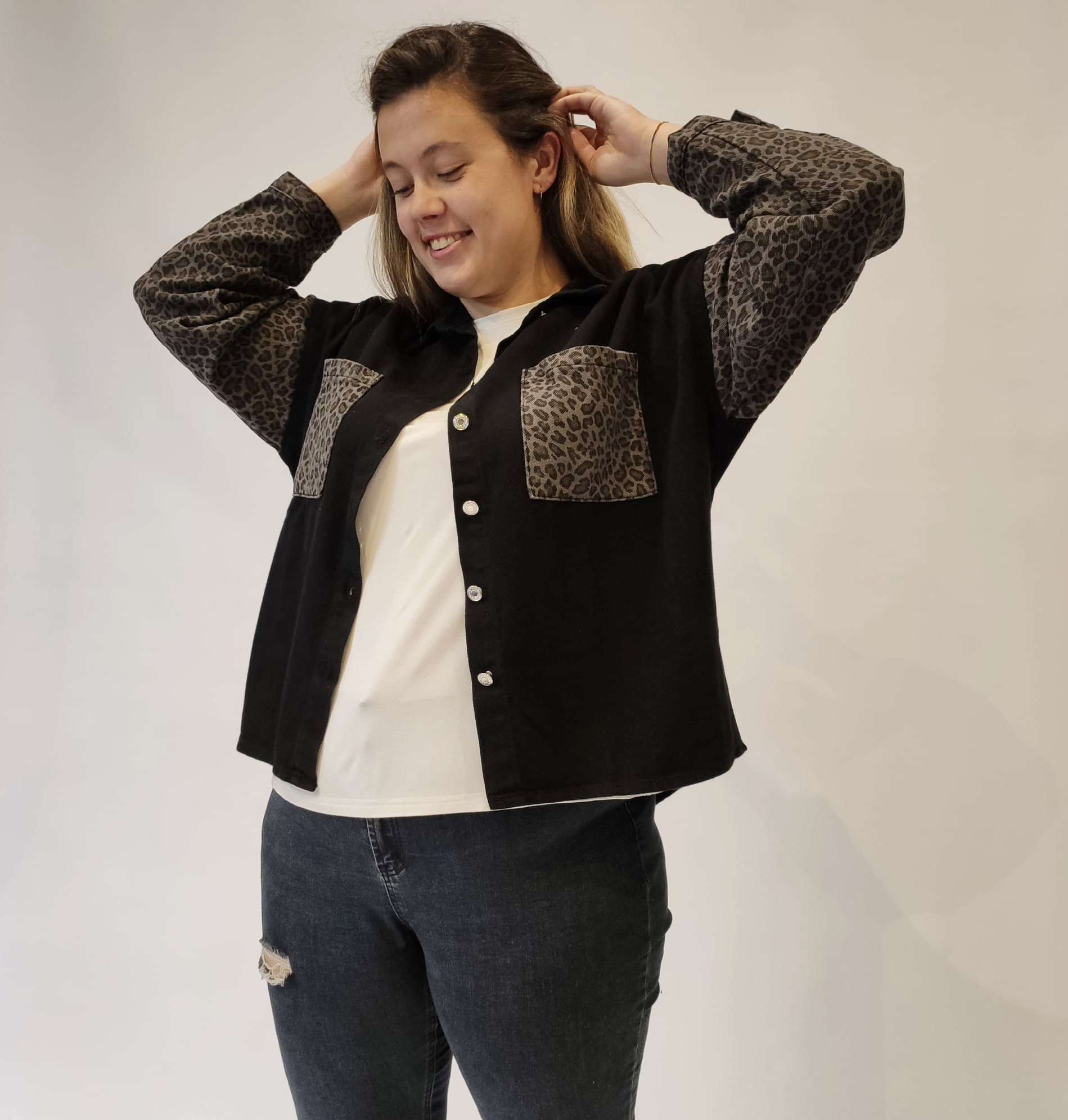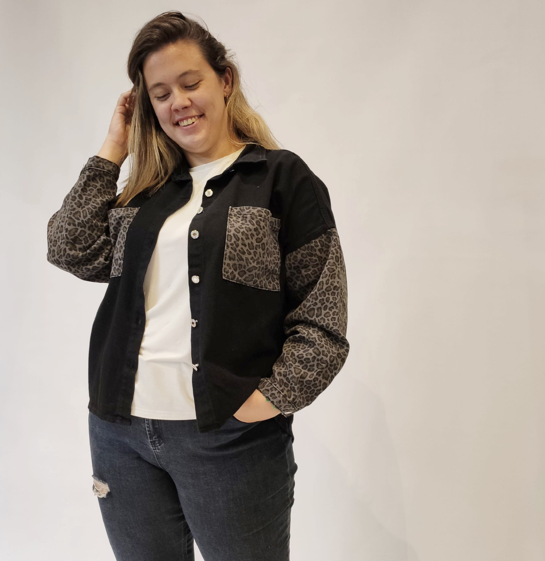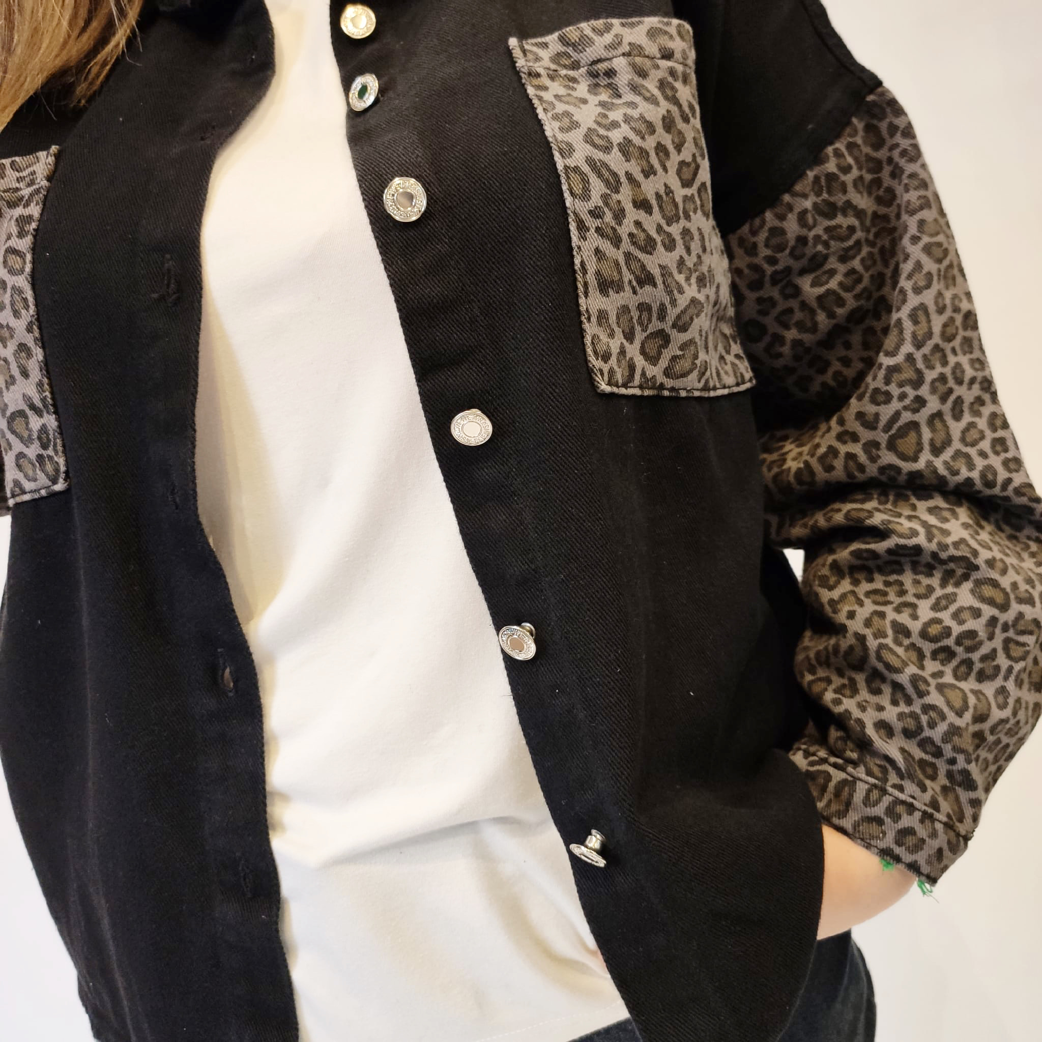 Chaqueta vaquera, tipo sobrecamisa, de cuello solapa y manga larga con puño cerrado por un botón. Dos bolsillos plastrón en pecho. Mangas y bolsillos en estampado animal print. Cierre de botones siete botones metálicos. 100% algodón.