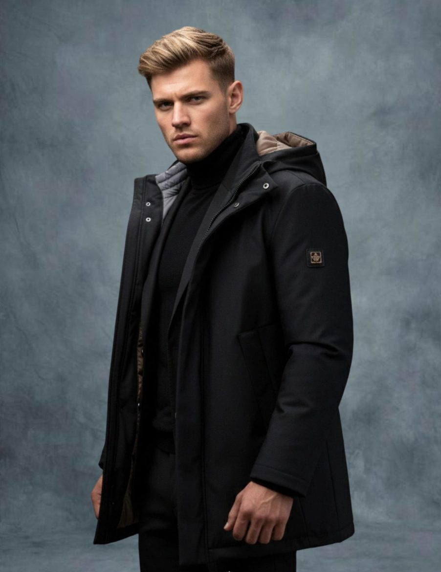 Chaquetón sport técnico de manga larga y cuello caja elevado, con capucha desmontable por cremallera.