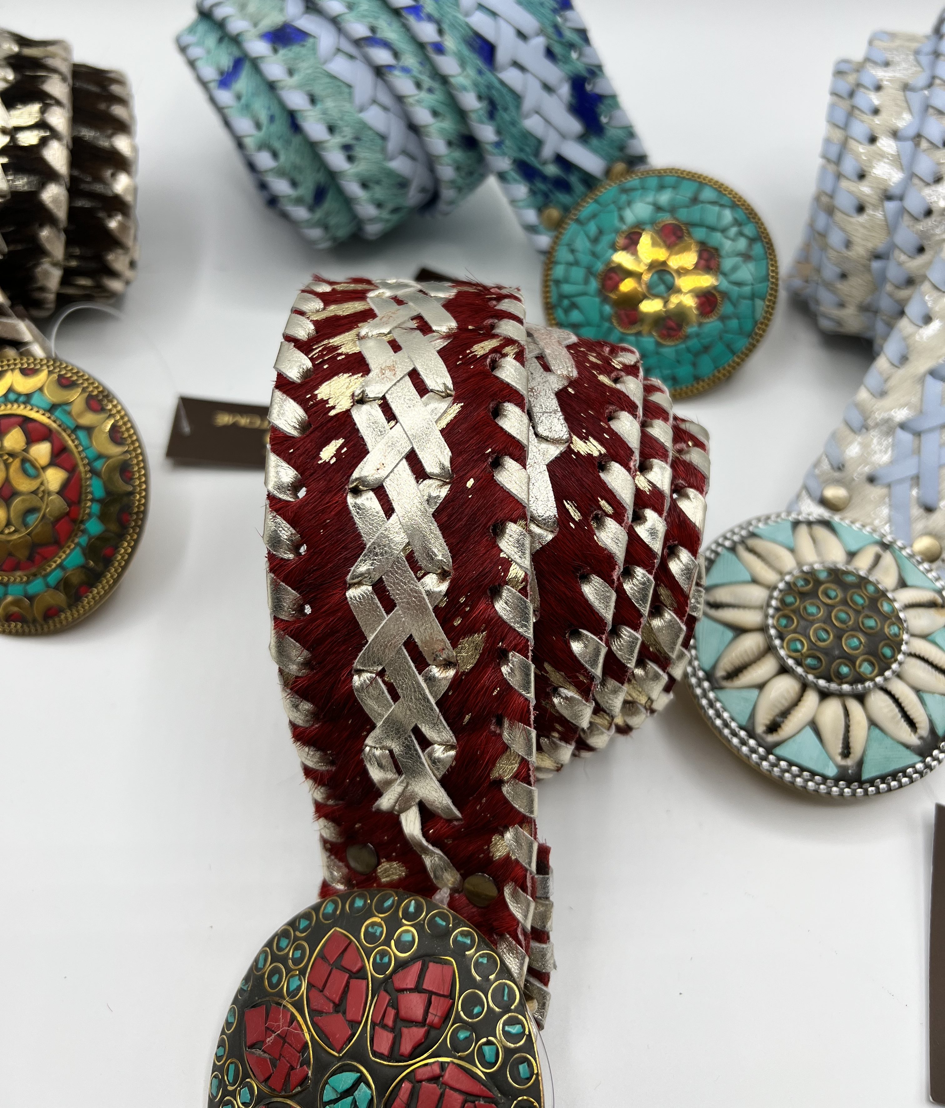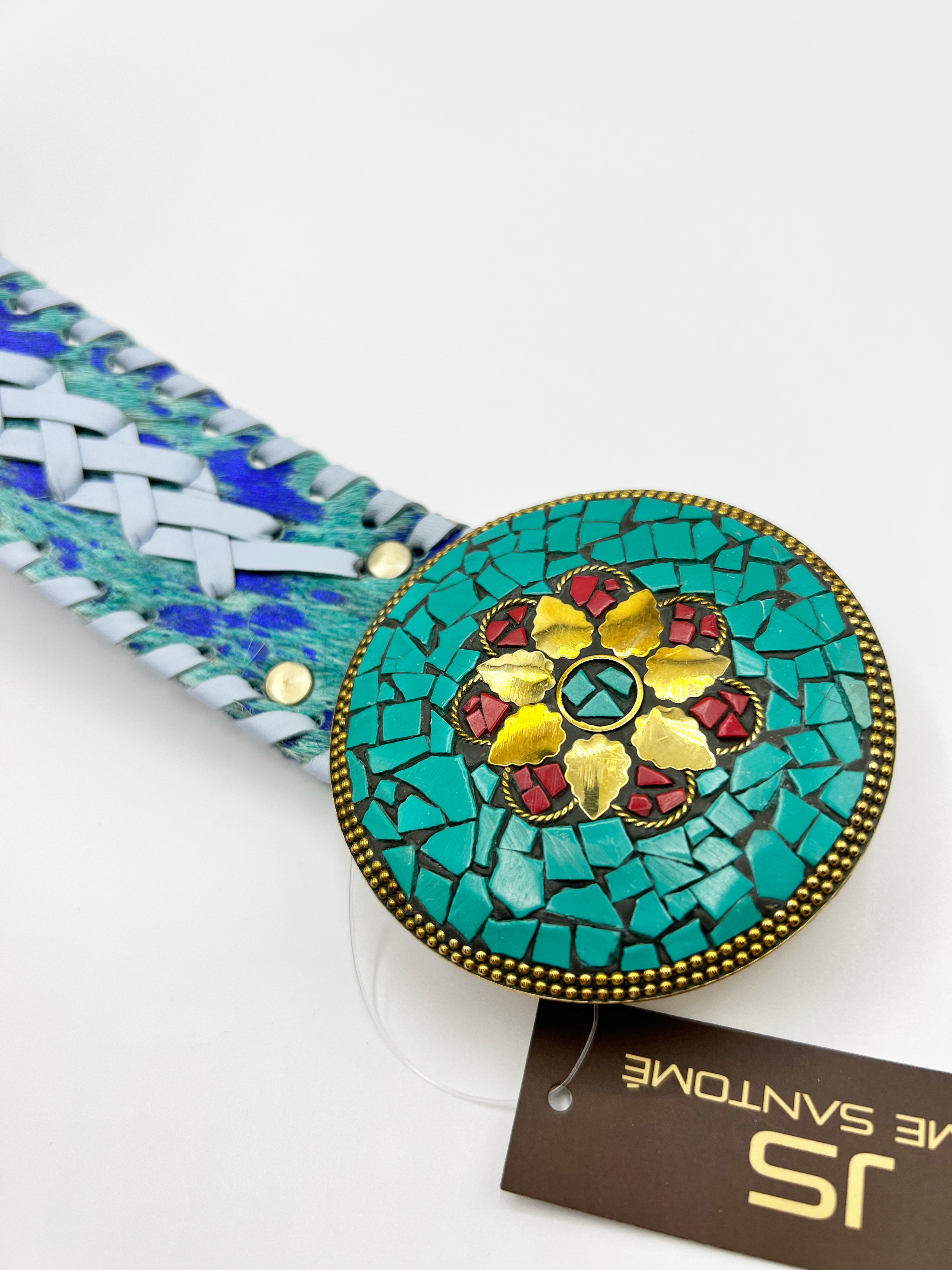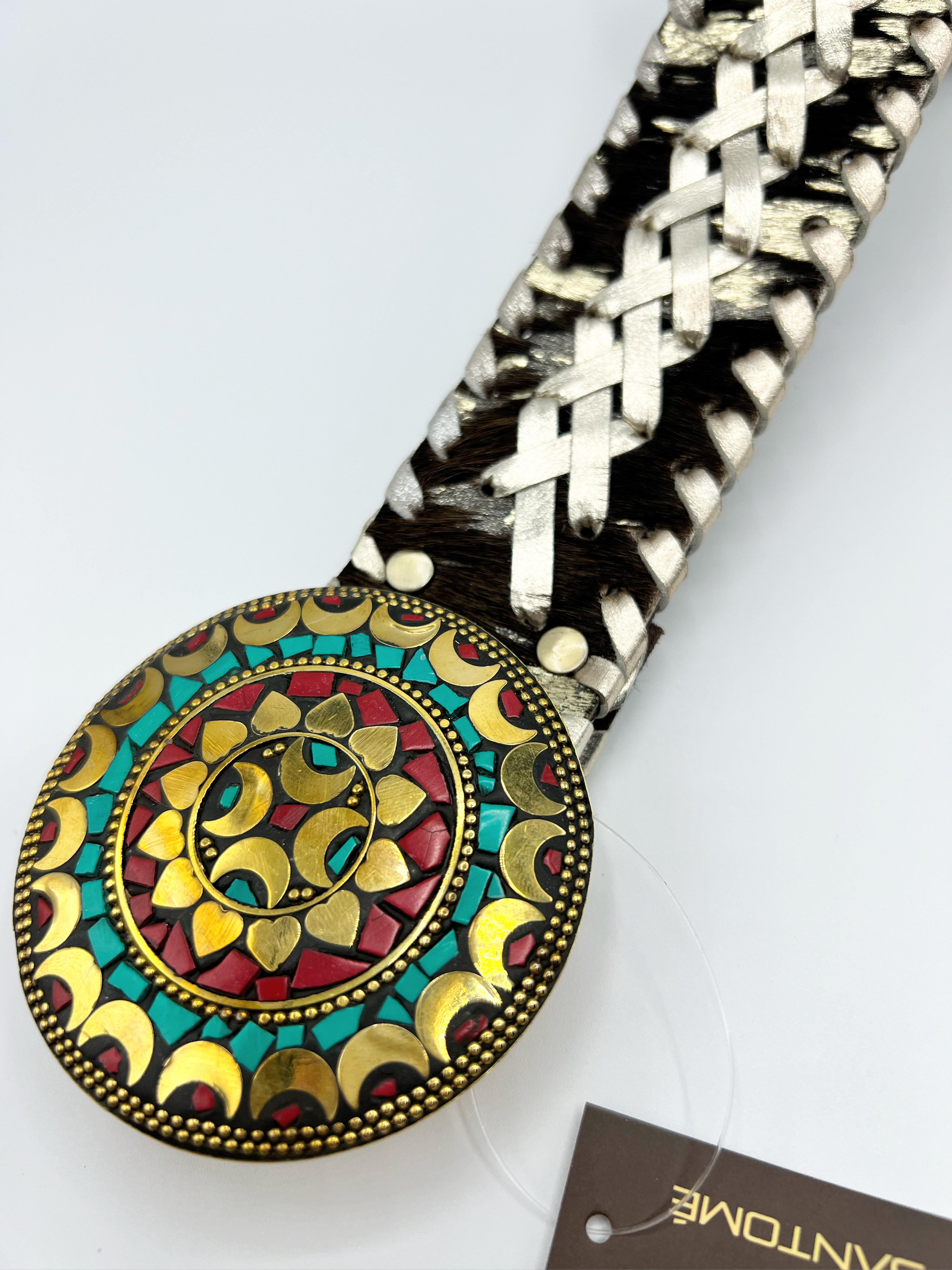 Cinturón Banjara hecho con piel de cabra y con bordados trenzados en textil unicolor, Hebilla redonda chapón de metal dorado con caorís (conchas) o piedras, con enganche de pico. Ancho de cinturón: 48 mm. y diámetro hebilla: 78 mm. Fabricado en India.