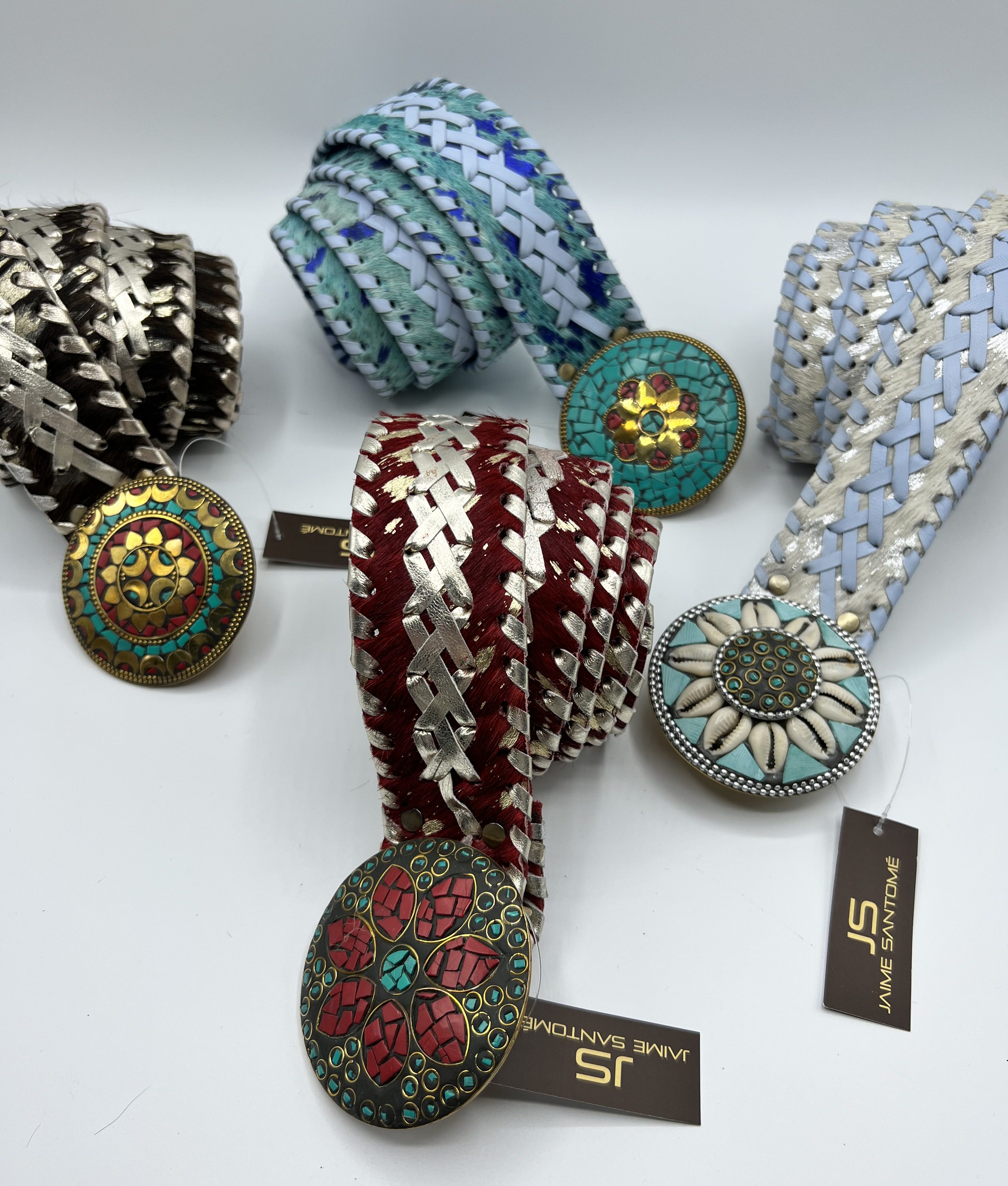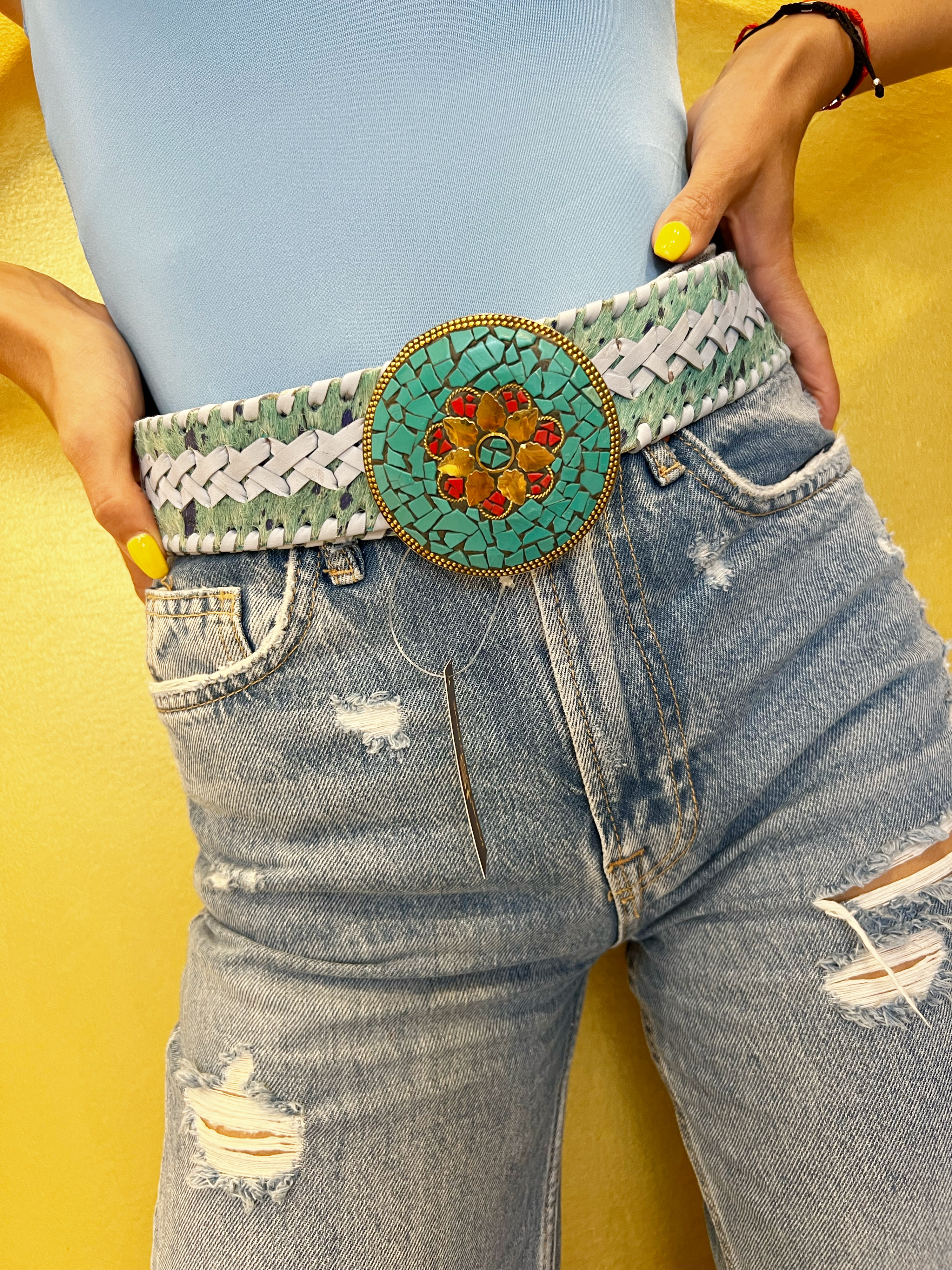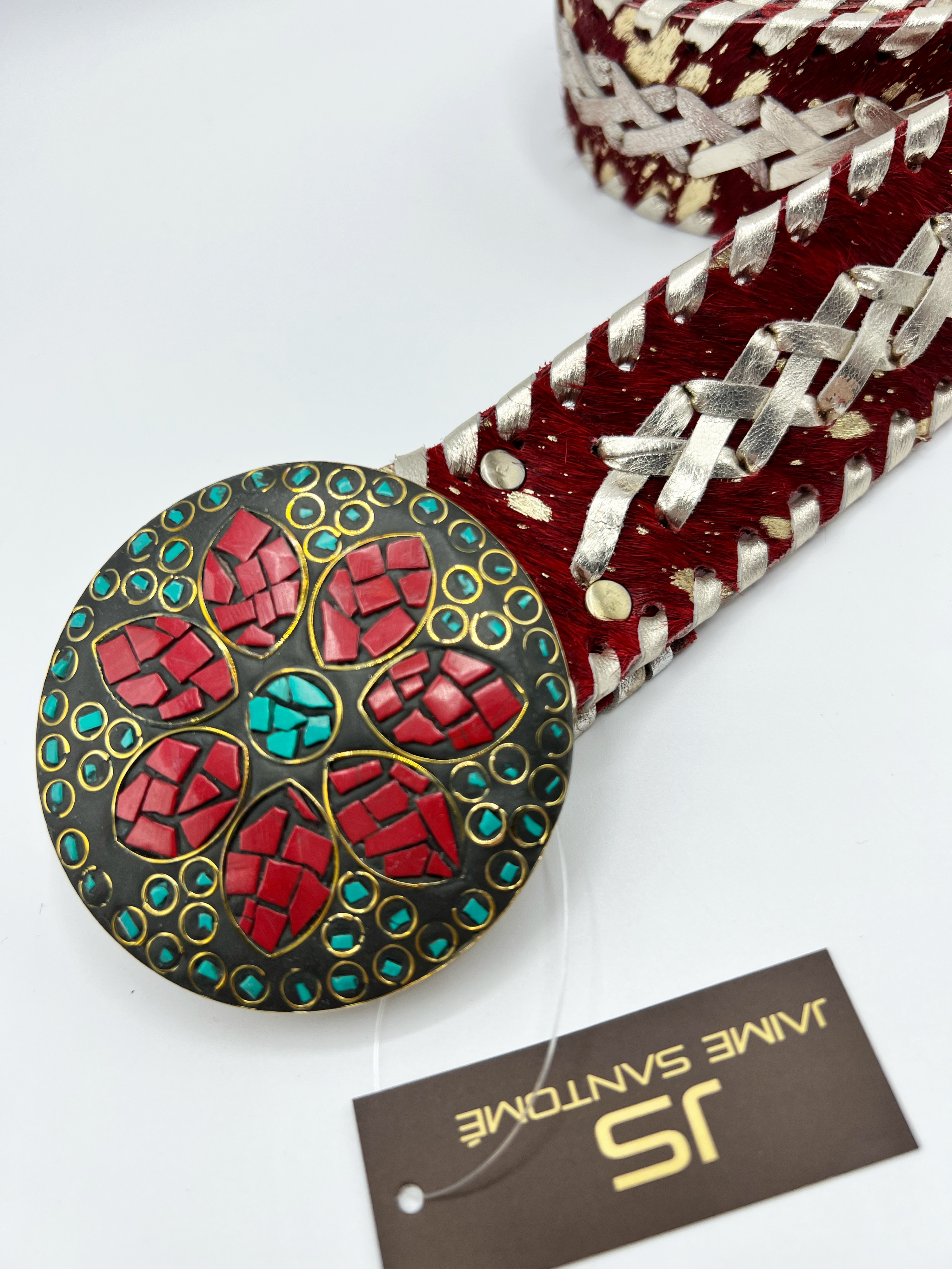 Cinturón Banjara hecho con piel de cabra y con bordados trenzados en textil unicolor, Hebilla redonda chapón de metal dorado con caorís (conchas) o piedras, con enganche de pico. Ancho de cinturón: 48 mm. y diámetro hebilla: 78 mm. Fabricado en India.