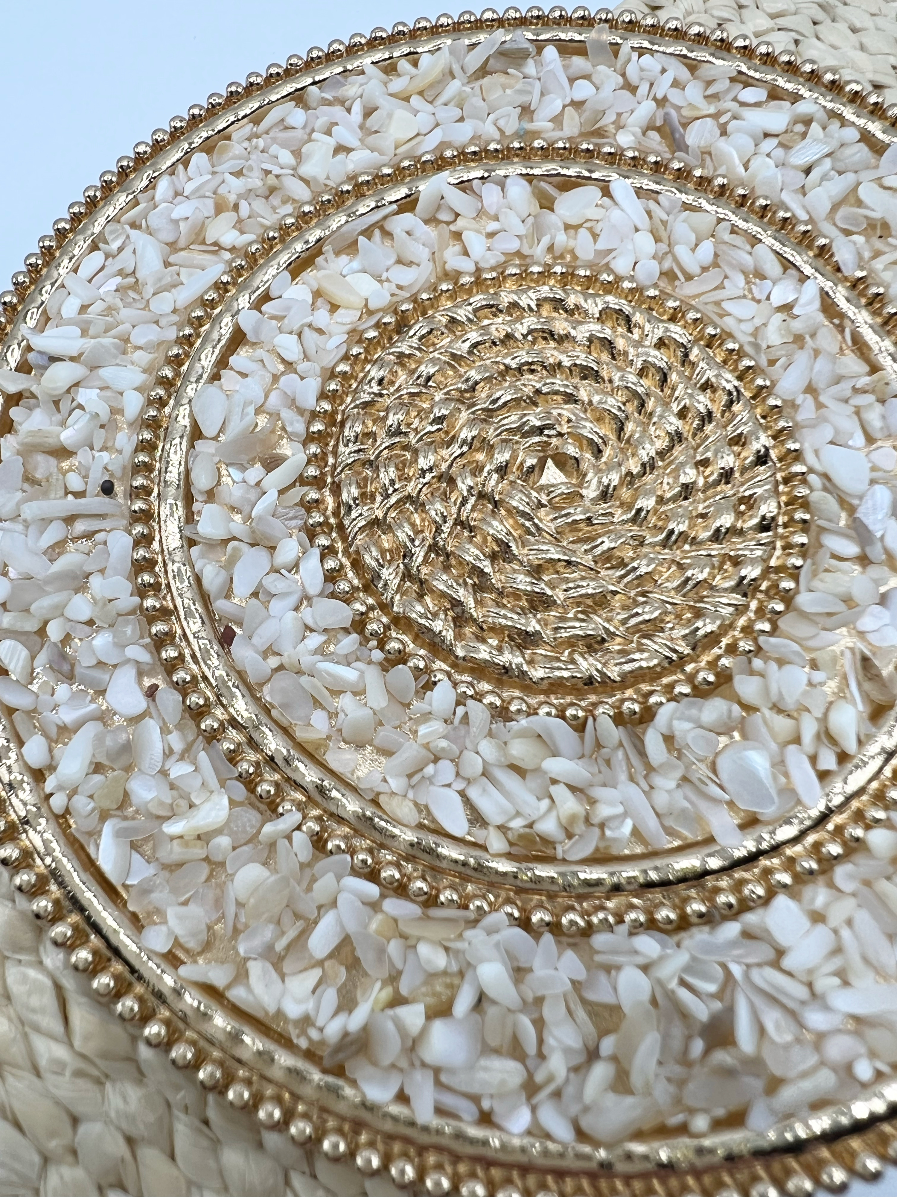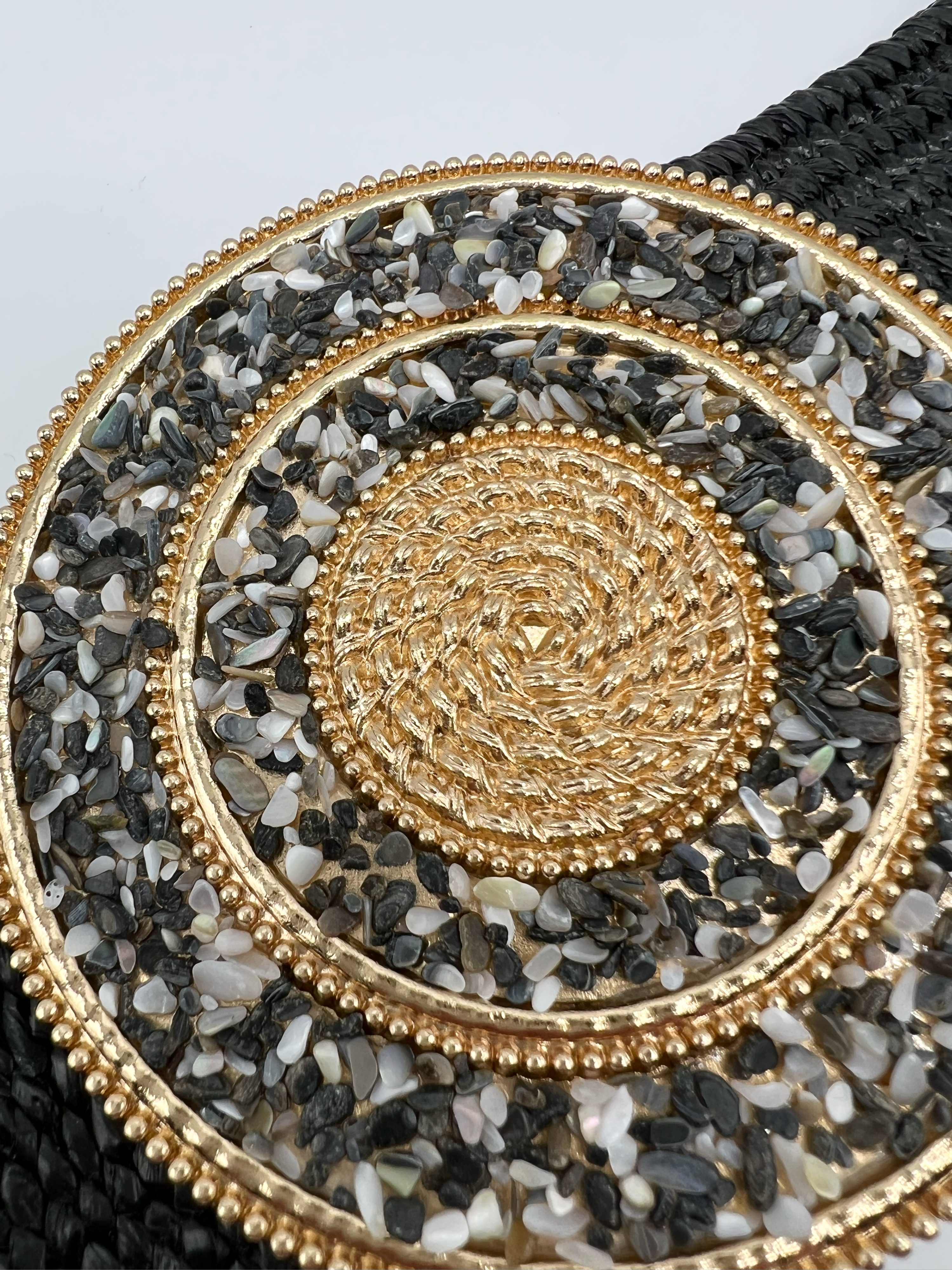 Cinturón de poliéster elástico con hebilla redonda en metal dorado y partículas multitono. Cierre de ganchos. Ancho aproximado cinturón: 5,5 cm. Composición: 80% Poliéster, 5% PU y 15% Metal.