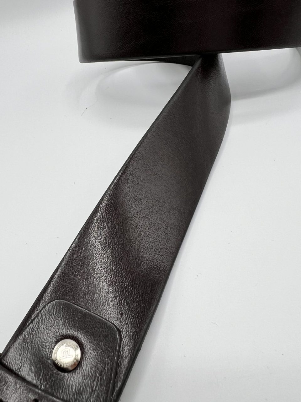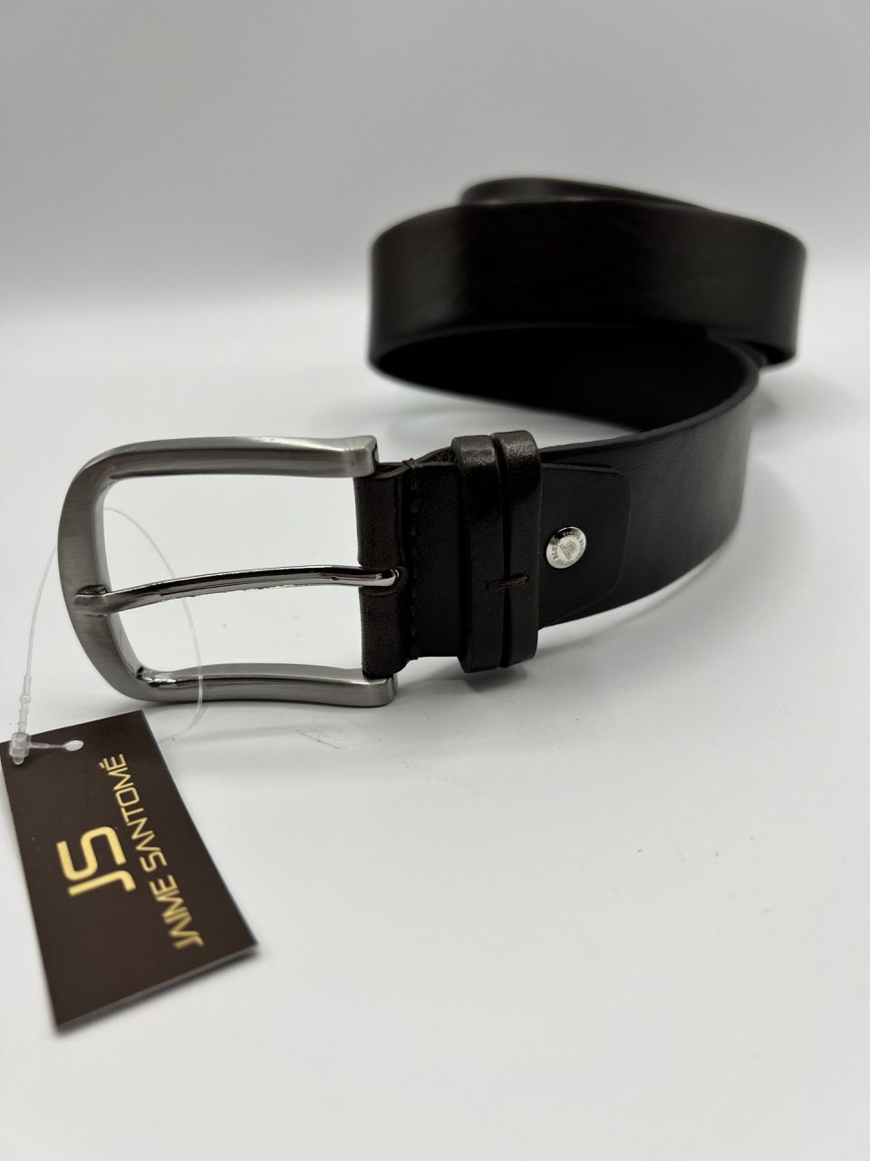 Cinturón piel genuina vacuno lisa. Exterior y forro en piel vaquetilla; hebilla en zamak. Hecho en España. Ancho correa: 40 mm. Talla 115. Se puede cortar para reducir talla.