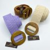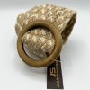 Cinturón de poliéster elástico con hebilla redonda, mitad en metal dorado liso y mitad cubierta de abalorios naranja. Ancho aproximado cinturón: 5 cm. Composición: 70% Poliéster, 20% Elastano y 10% Metal.