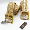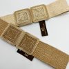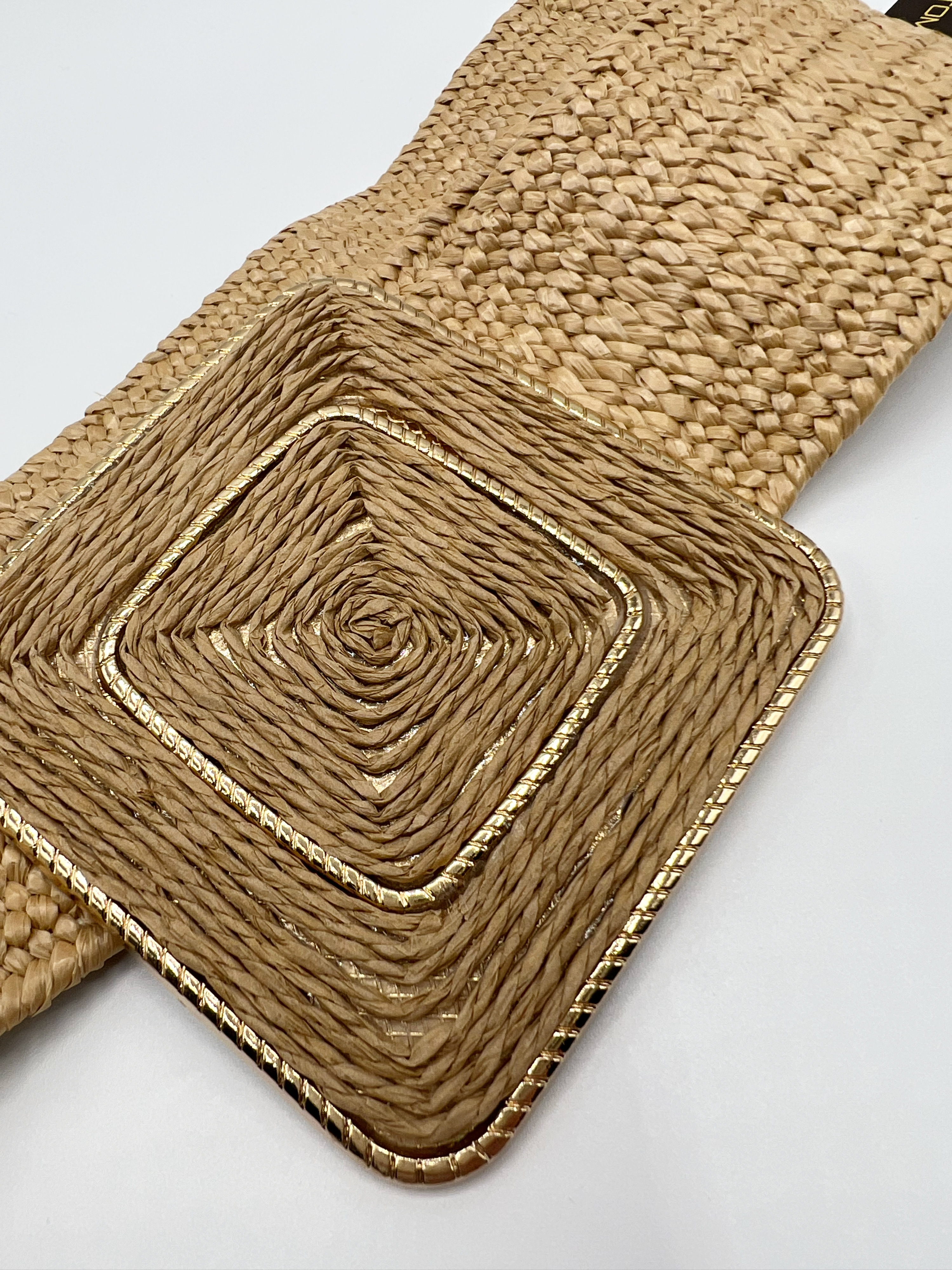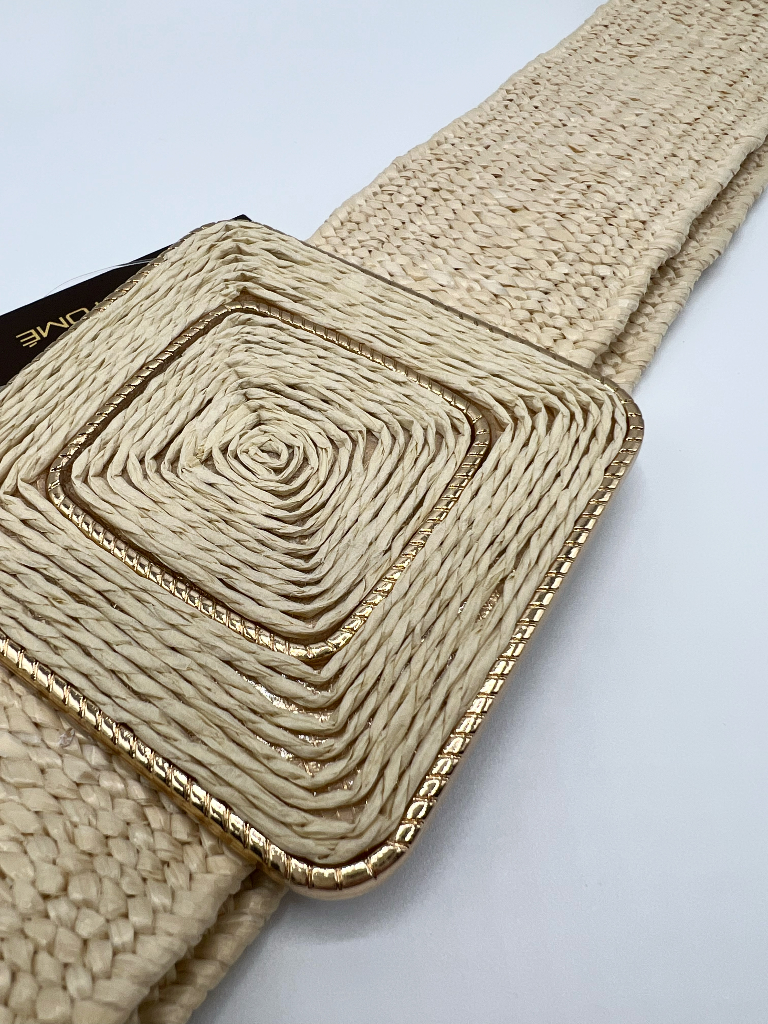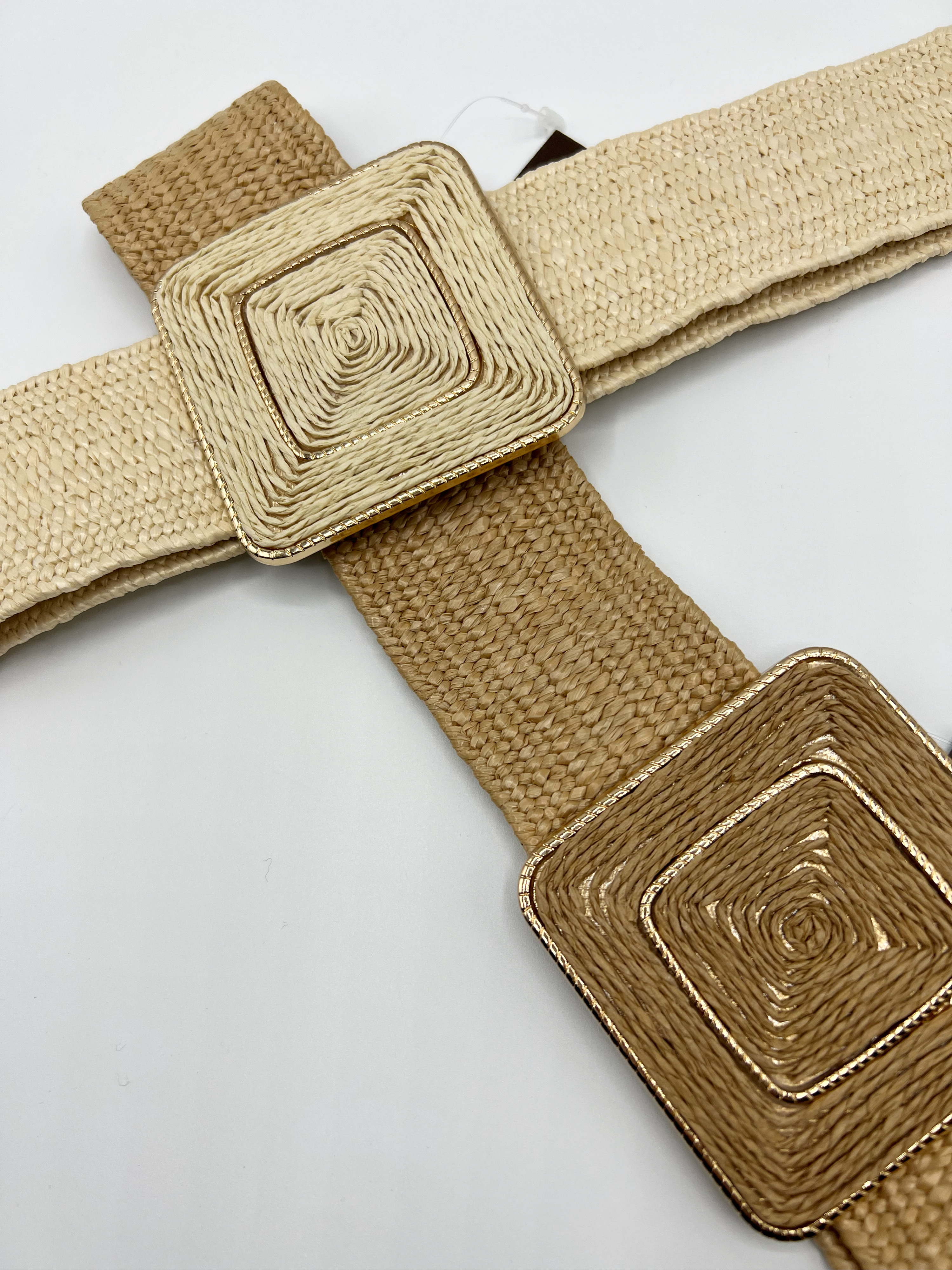 Cinturón de poliéster elástico con hebilla cuadrada en poliéster y metal dorado. Cierre de ganchos. Ancho aproximado cinturón: 5,5 cm. Composición: 90% Poliéster y 10% Metal.