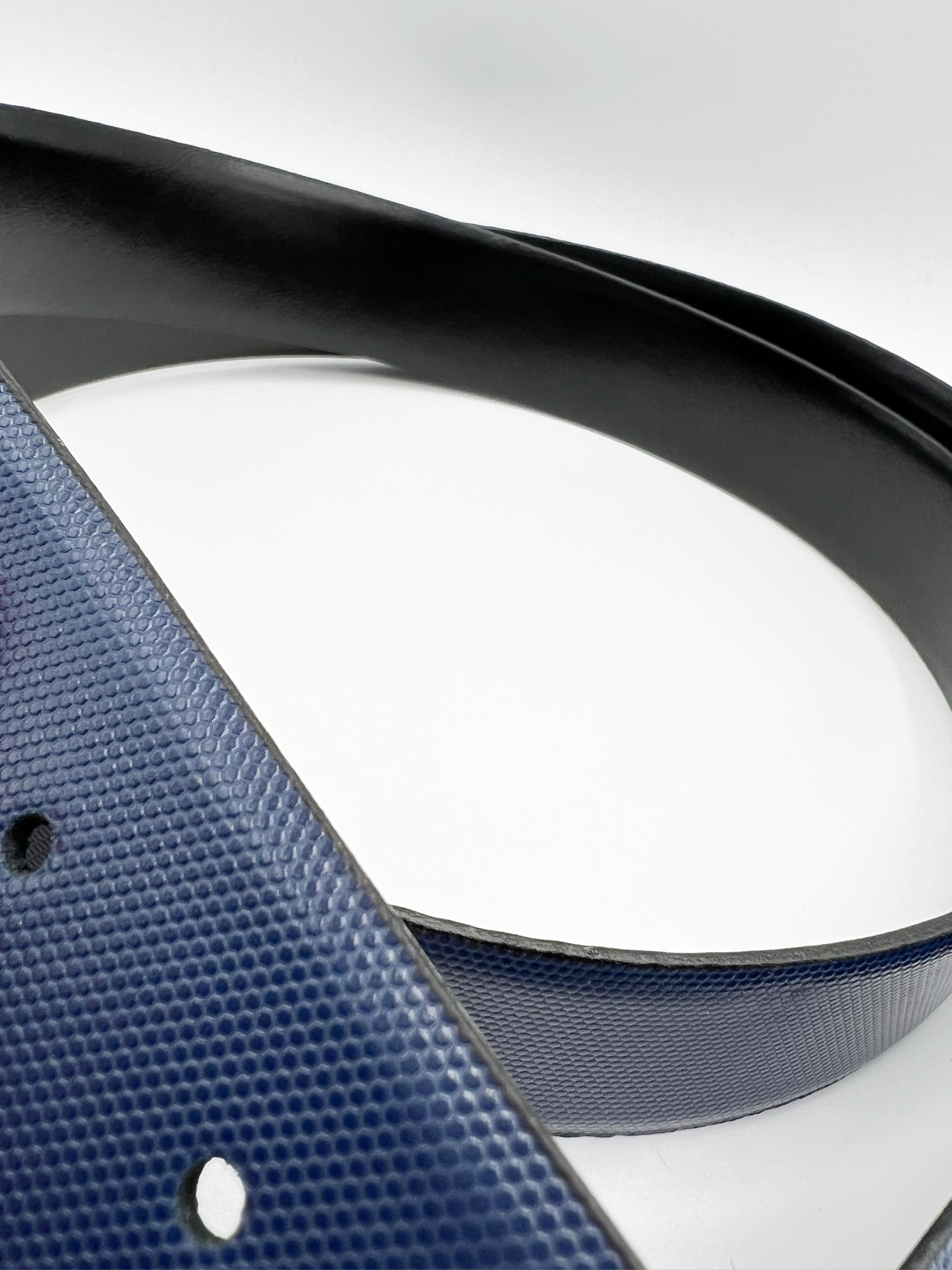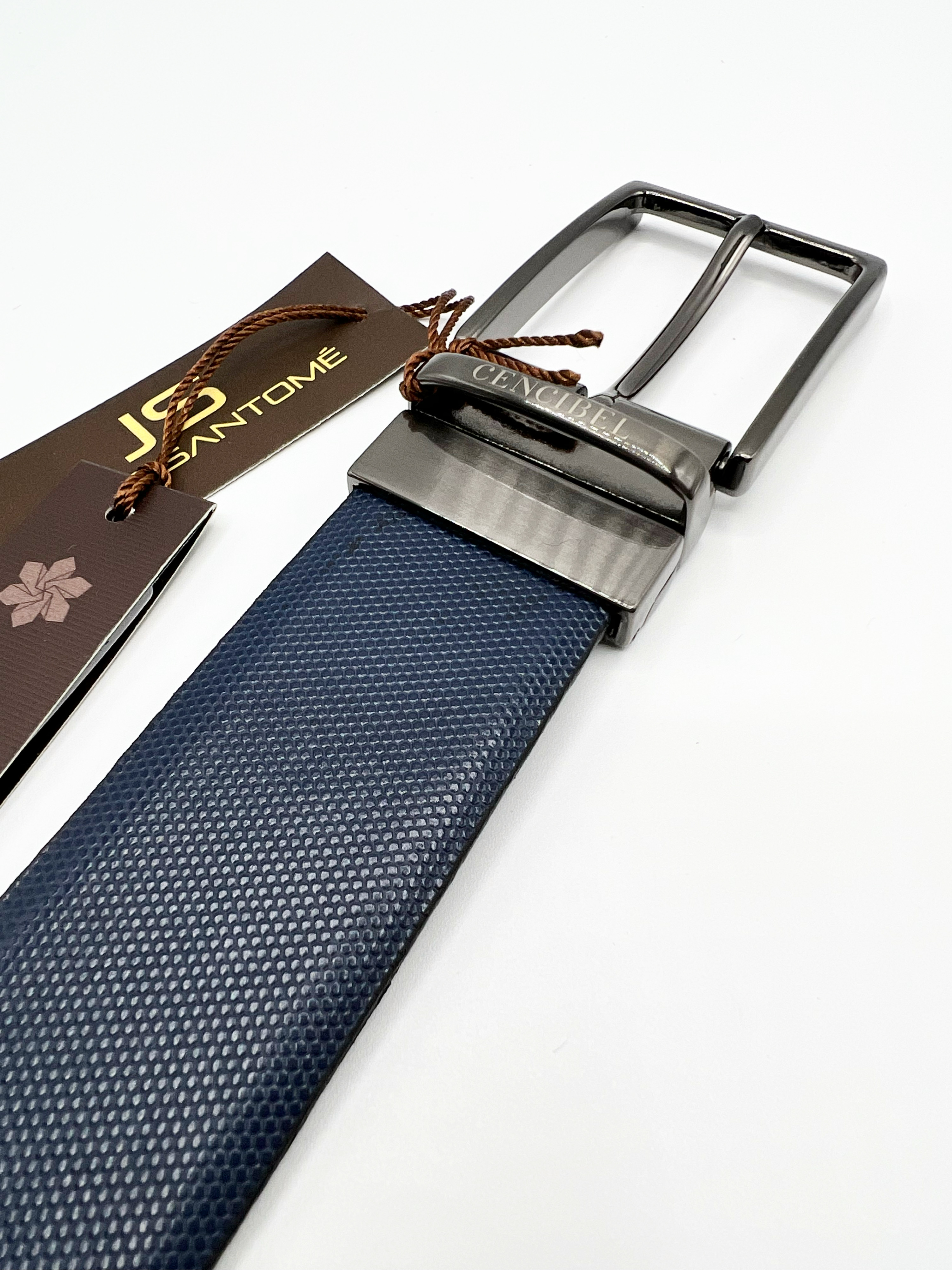 Cinturón de vestir reversible que se puede utilizar por ambos lados, por un lado en color marino picado y por el otro en color negro liso. Piel de vacuno caviar y hebilla de metal Zamack.