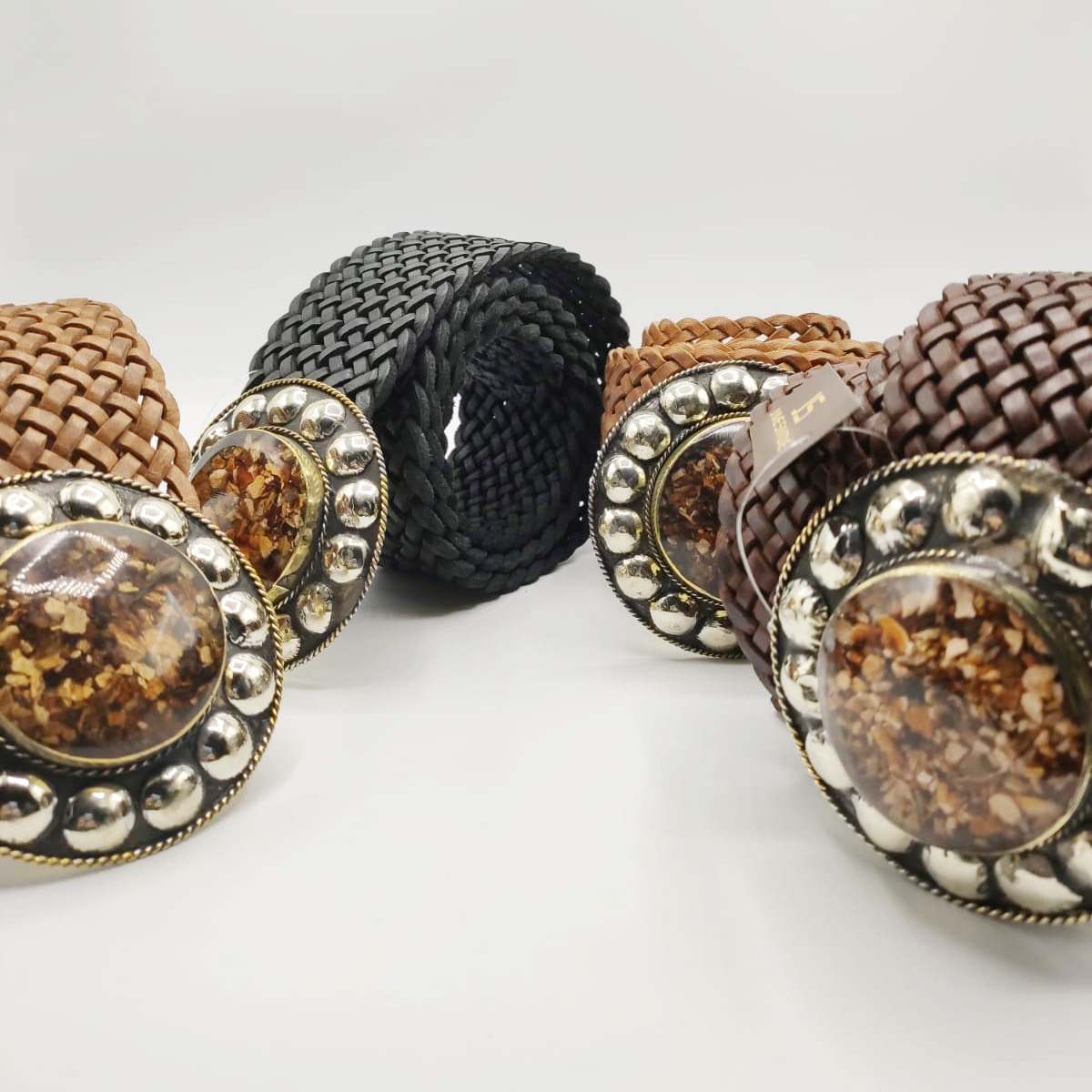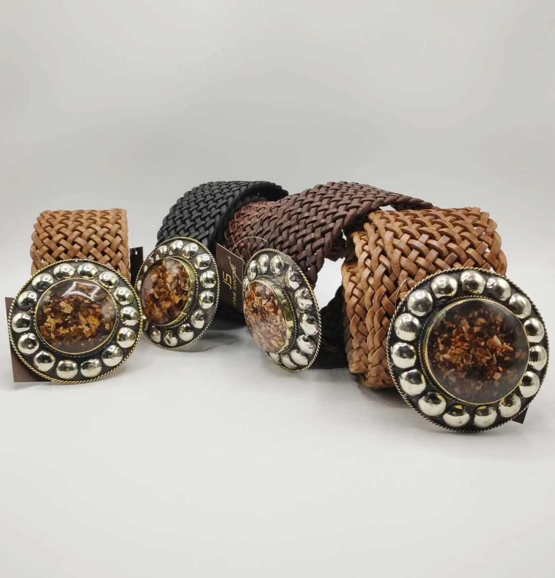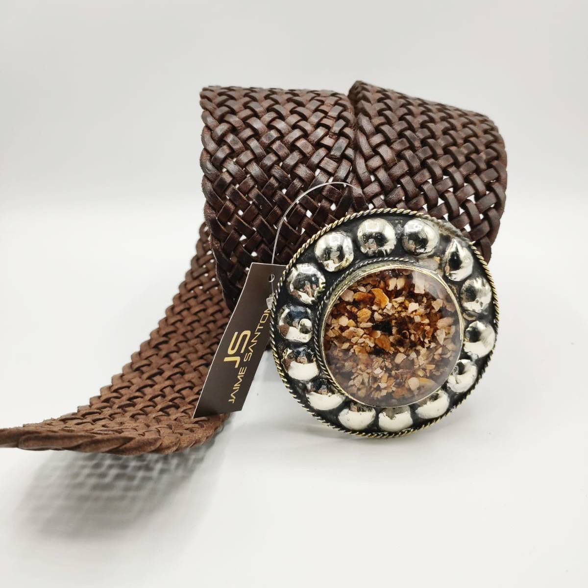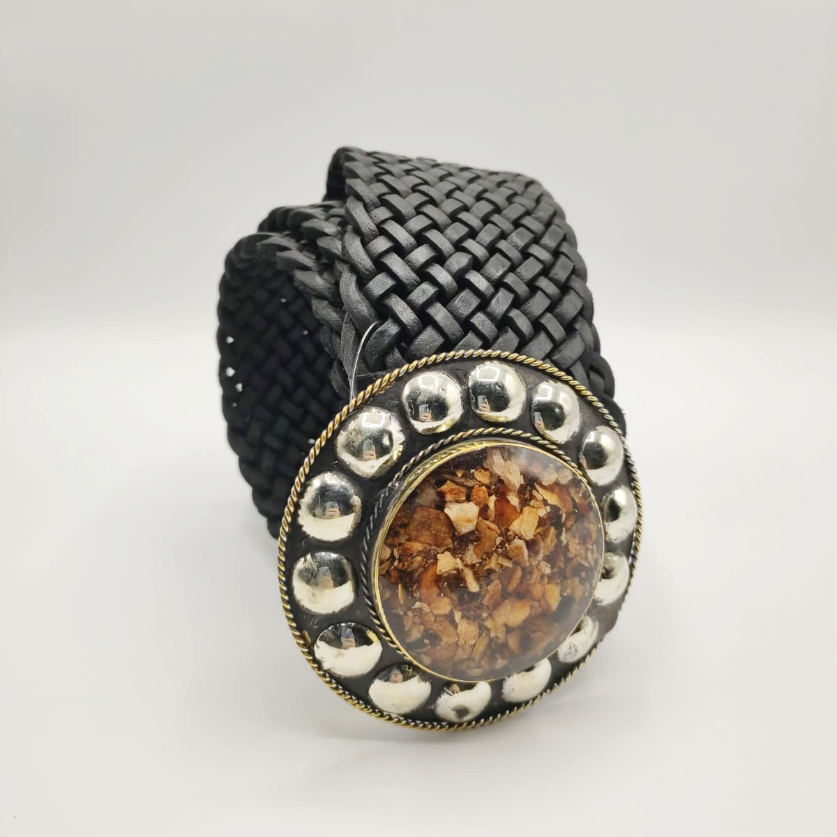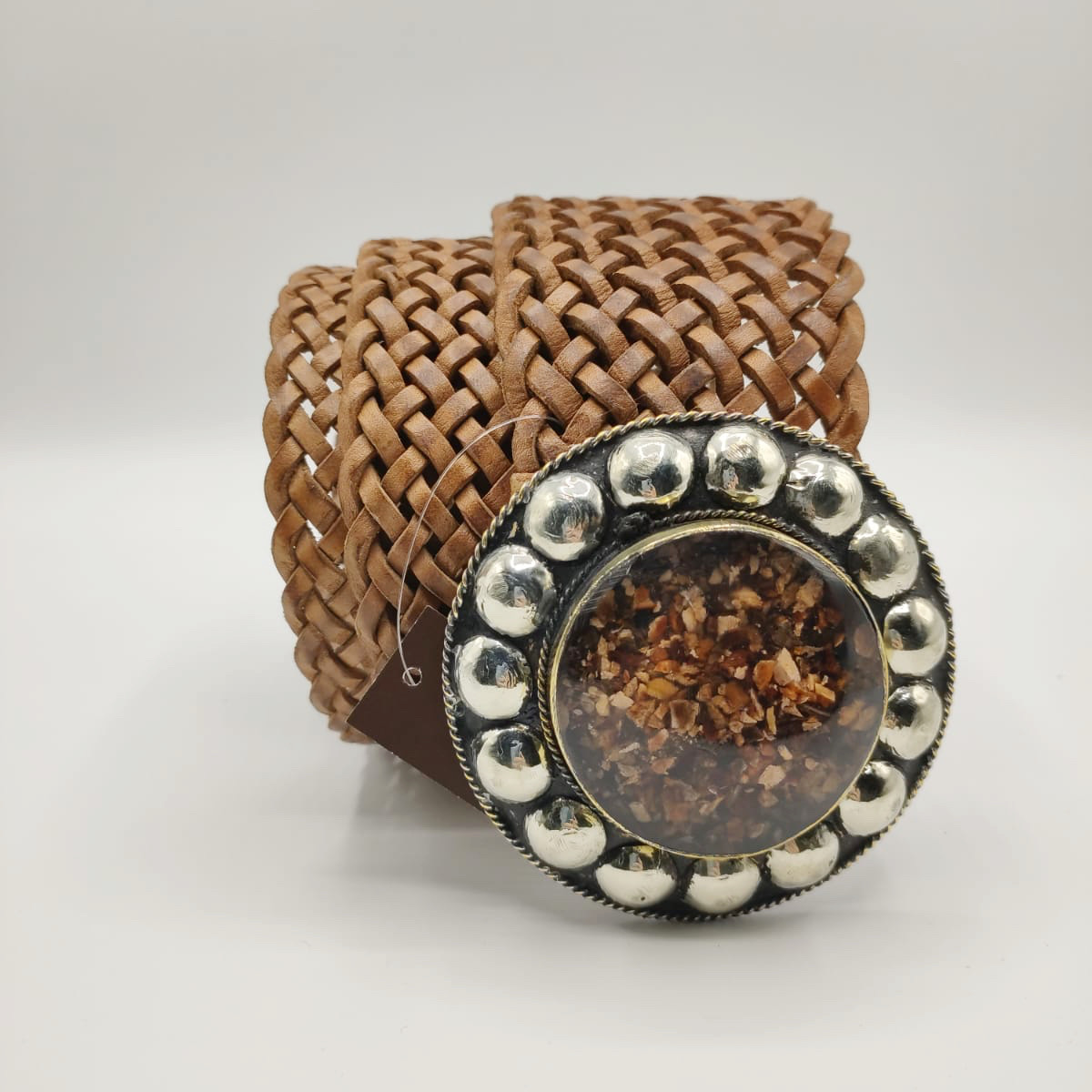 Cinturón de piel trenzado, con la hebilla redonda con piedras en su interior y tachuelas. Hecho a mano. Ancho 6,00 a 6,50 cm. Diámetro hebilla: 88 mm.