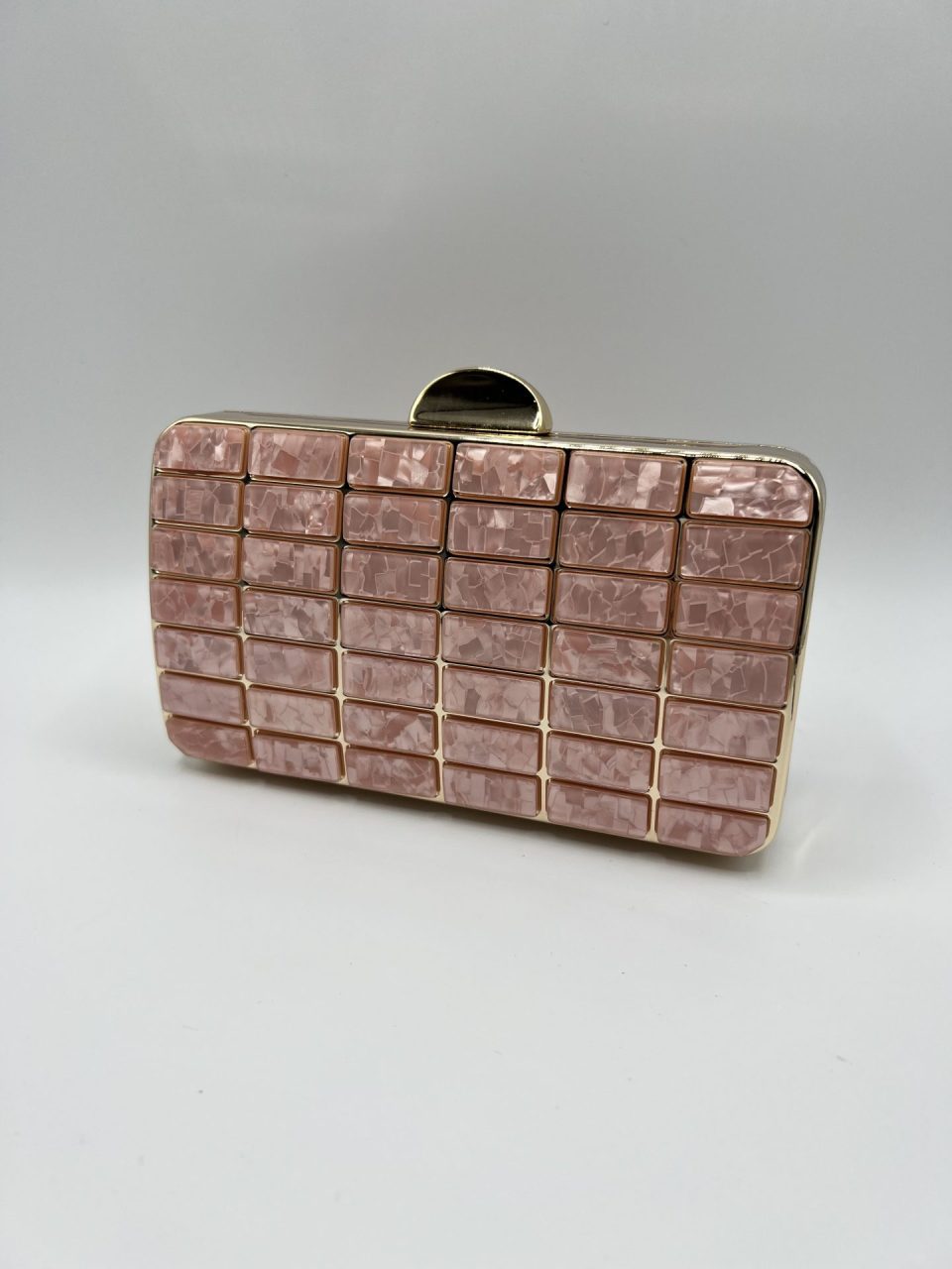 Bolso clutch, combinado en dorado y nácar por ambos lados. Interior forrado en tela. Cadena extraíble para colgar de eslabones dorados.