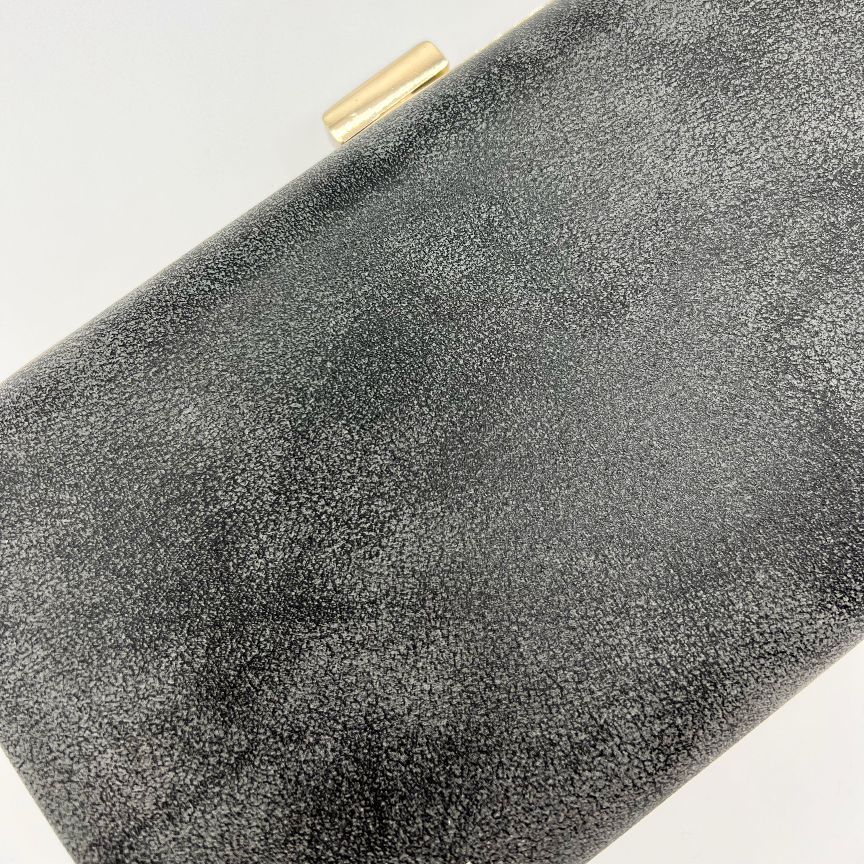 Clutch de fiesta con detalle de anillo con pedrería para llevar de mano y opción de cadena para colgar. Frontal con detalle de flecos plateados de pedrería. Medidas aproximadas: 17x10x5 cm.