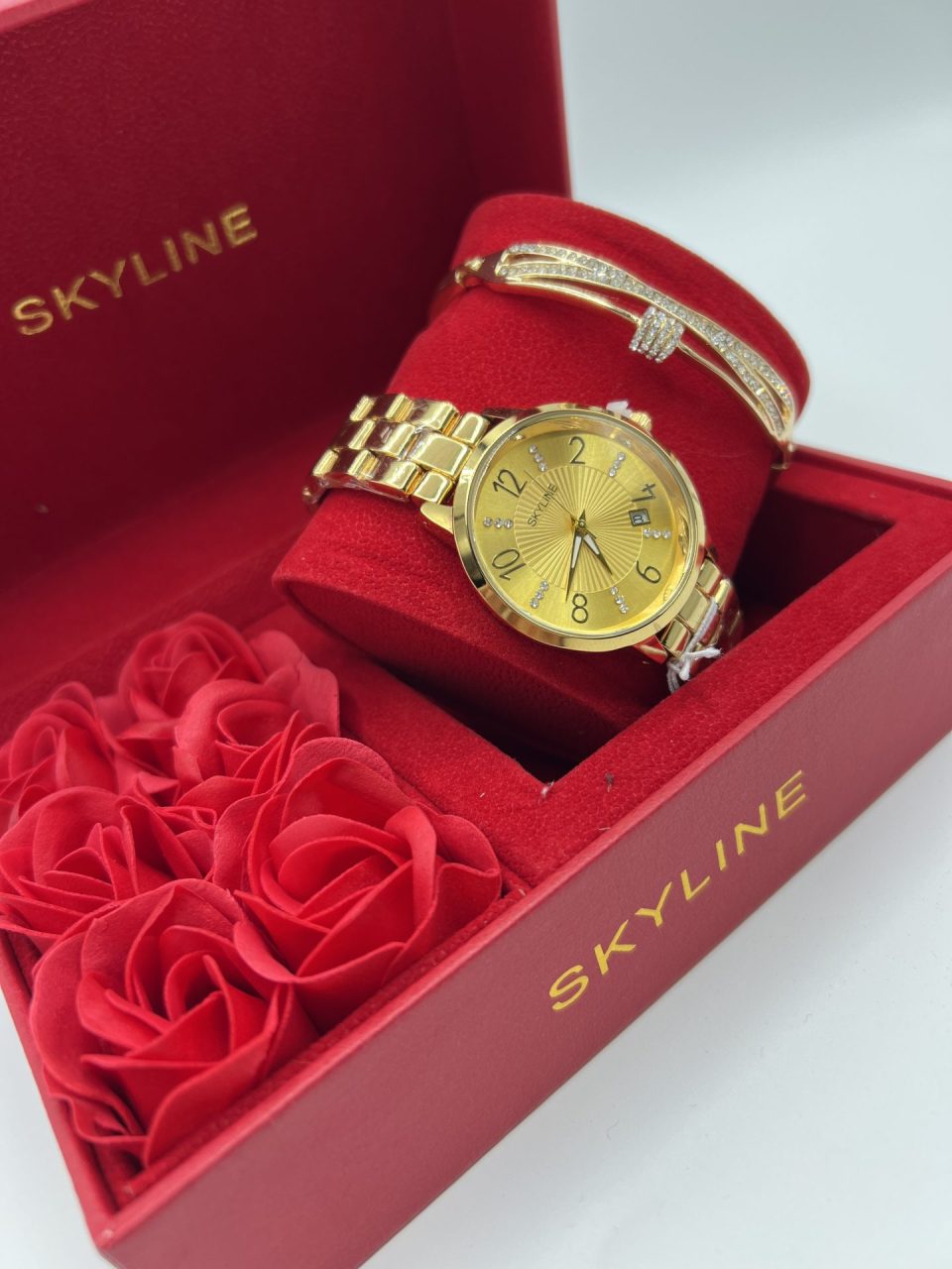 Reloj Skyline en acero inoxidable + collar y pendientes. Movimiento: cuarzo japonés. Correa: acero inoxidable. Impermeabilidad: WR 3ATM. Función: hora y calendario.